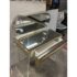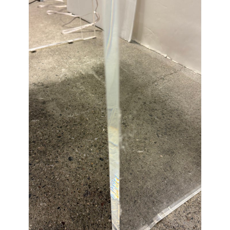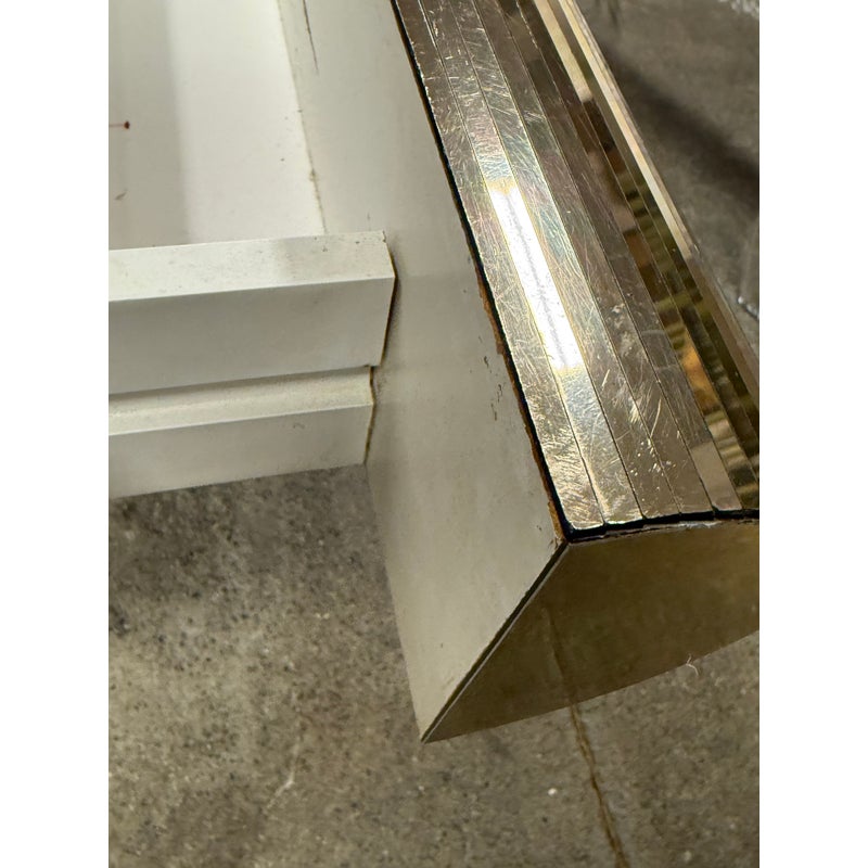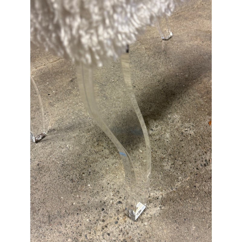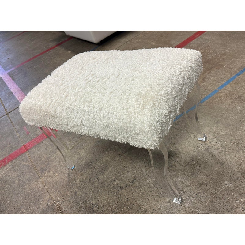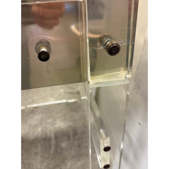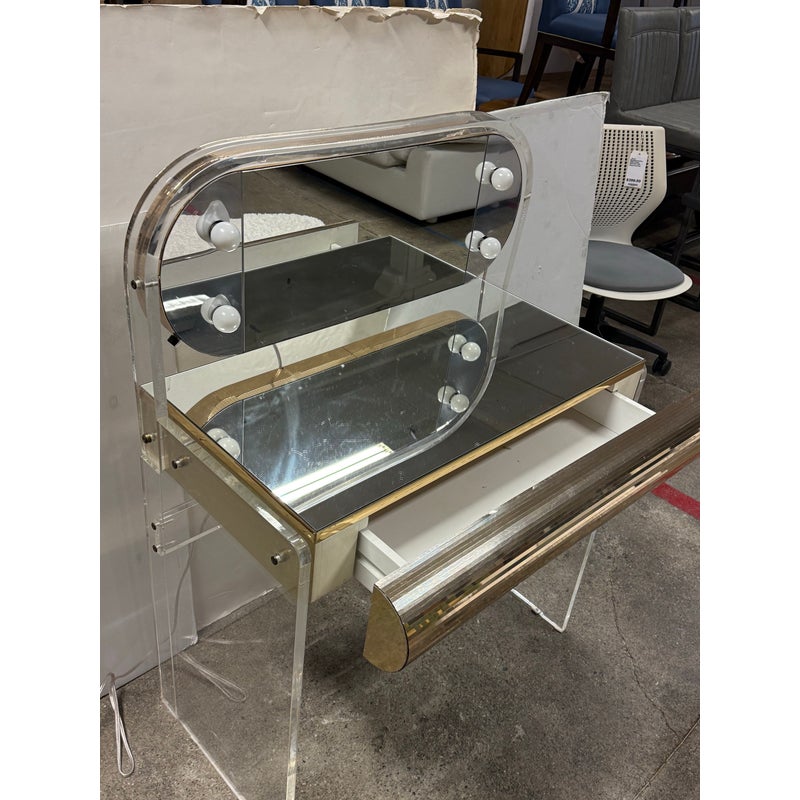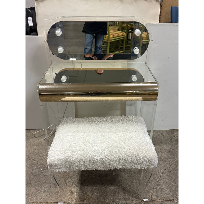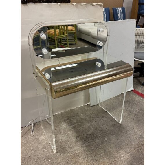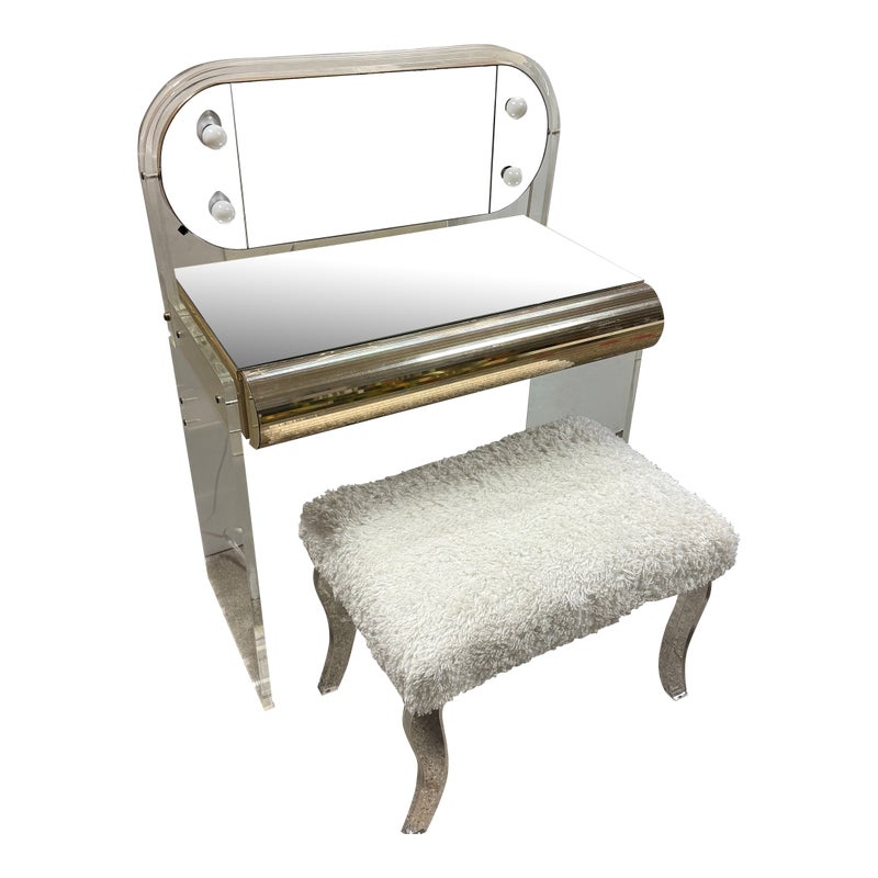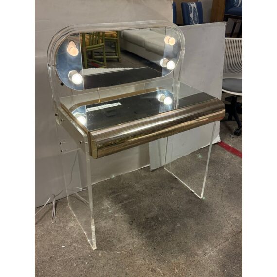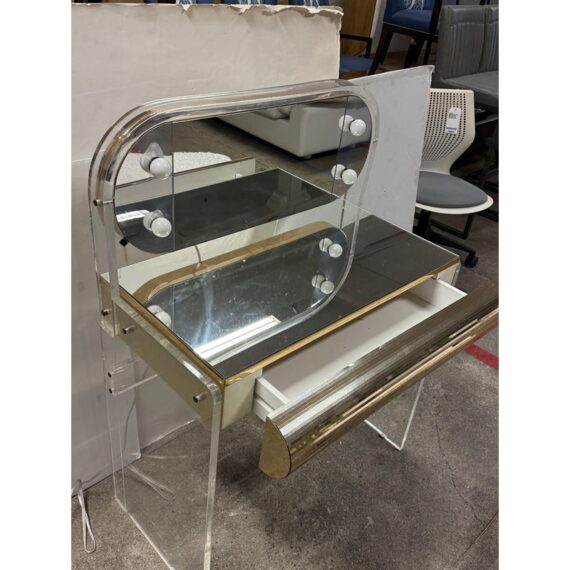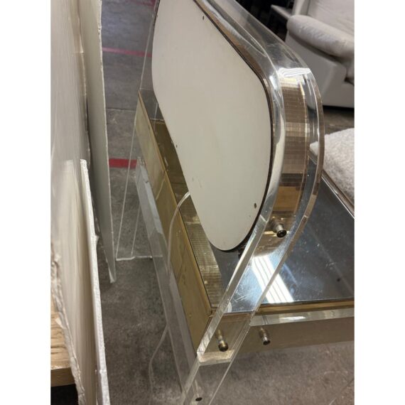 Design Plus Gallery presents a Vintage Lucite Vanity + Bench from Hill Manufacturing. Creations at Dallas designed this luxe piece back in the 1980s with all the “glamour puss” of opulence, elegance, and perhaps even a touch of theatrical flair, potentially appealing to someone who embraces a glamorous lifestyle. The vanity and frame of the bench are made from Lucite with the legs on the ottoman have a turned out appeal similar to cabriole legs and it has a plush white seat. The vanity has a mirror with four lights at each corner, applied brass tiles, and a single drawer. Visible wear is present to the lucite with visible scratches. Minor breakage on the brass plates. Considered to be in consistent good condition for its vintage usage. Made in Dallas, Texas, USA.