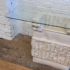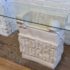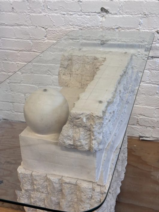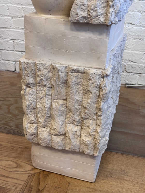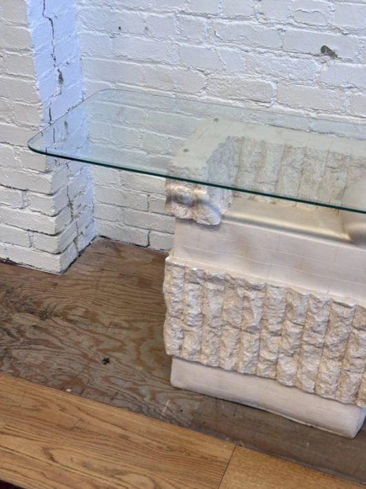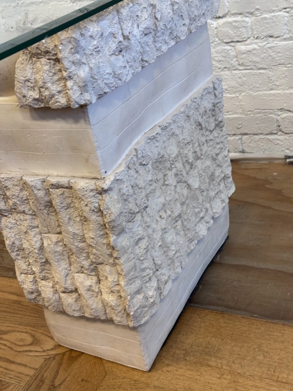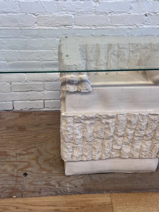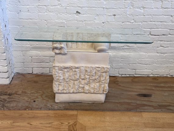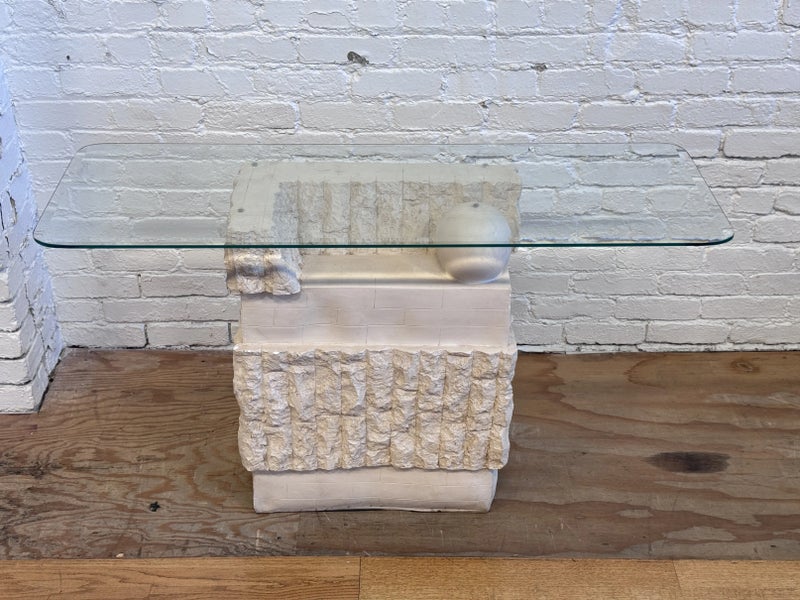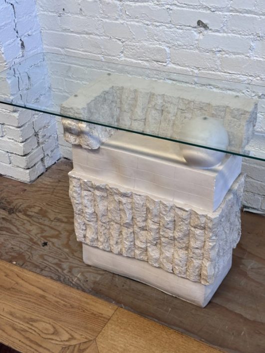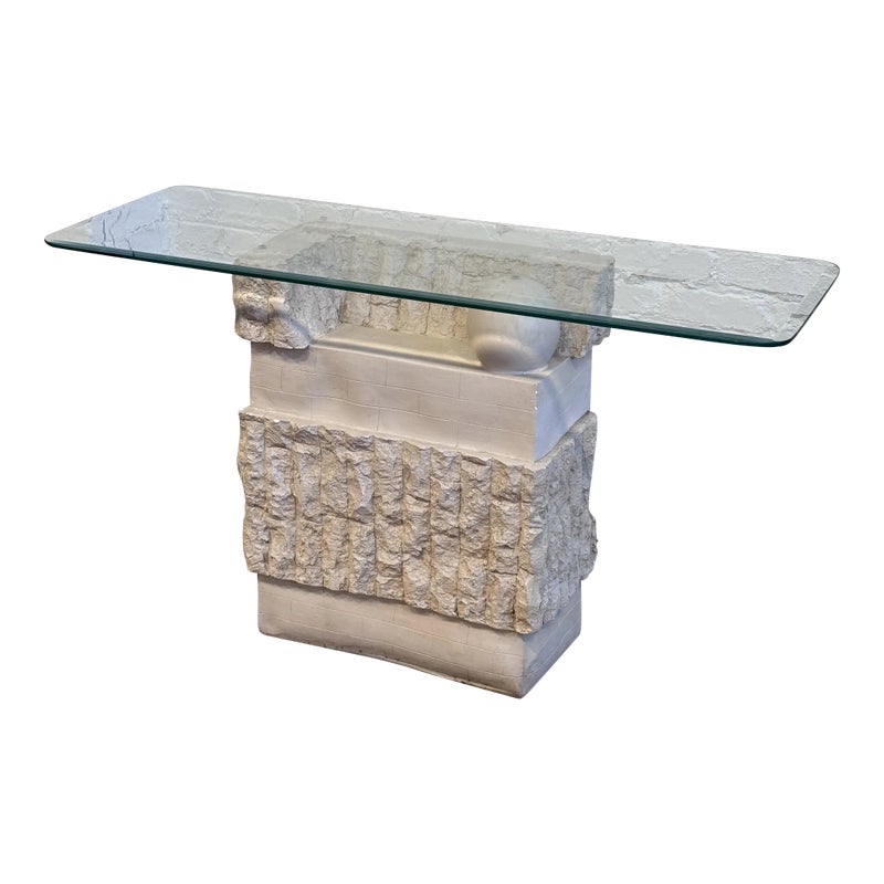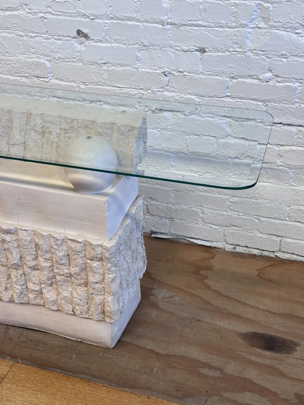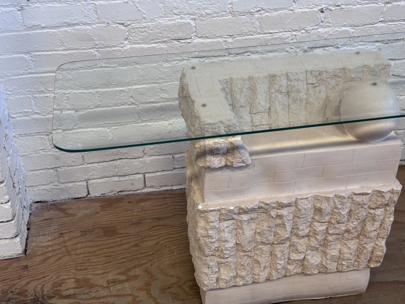 Design Plus Gallery presents a Circa 1980’s Magnussen Ponte Tessellated Mactan Stone Stone Console Table. The stone base looks ancient from the Roman era with columns and a single ball that holds the glass surface atop. An elegant look to sit just about anywhere in the home. Is in Is in good condition for its age with minimal surface wear that is consistent with use. Small chip on the edge of glass. This is a discontinued model.