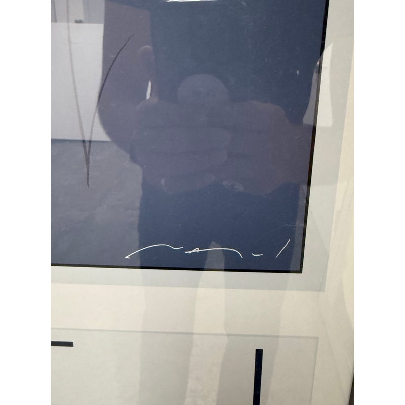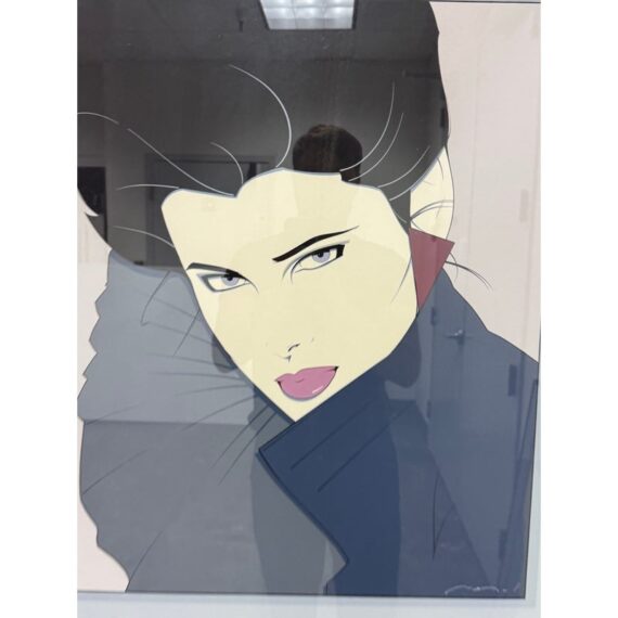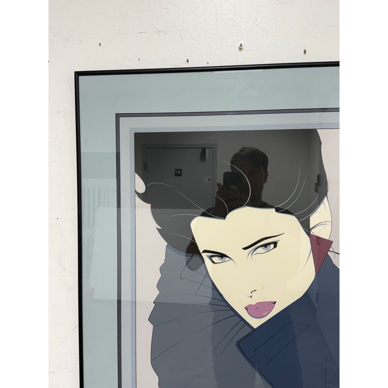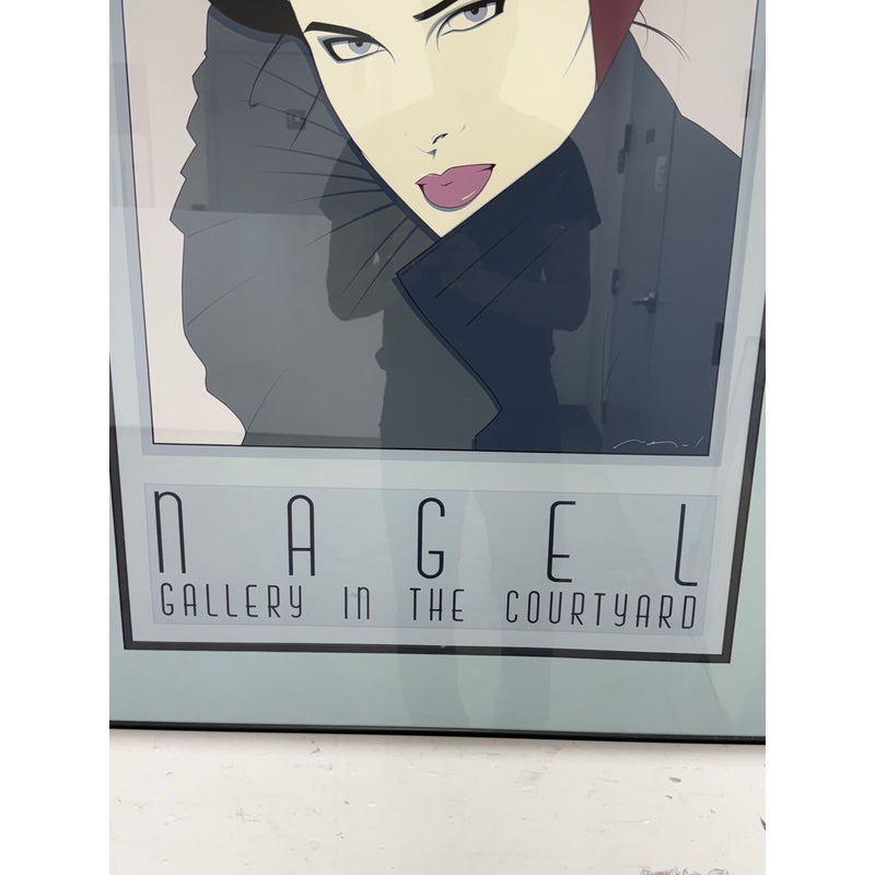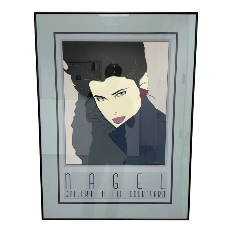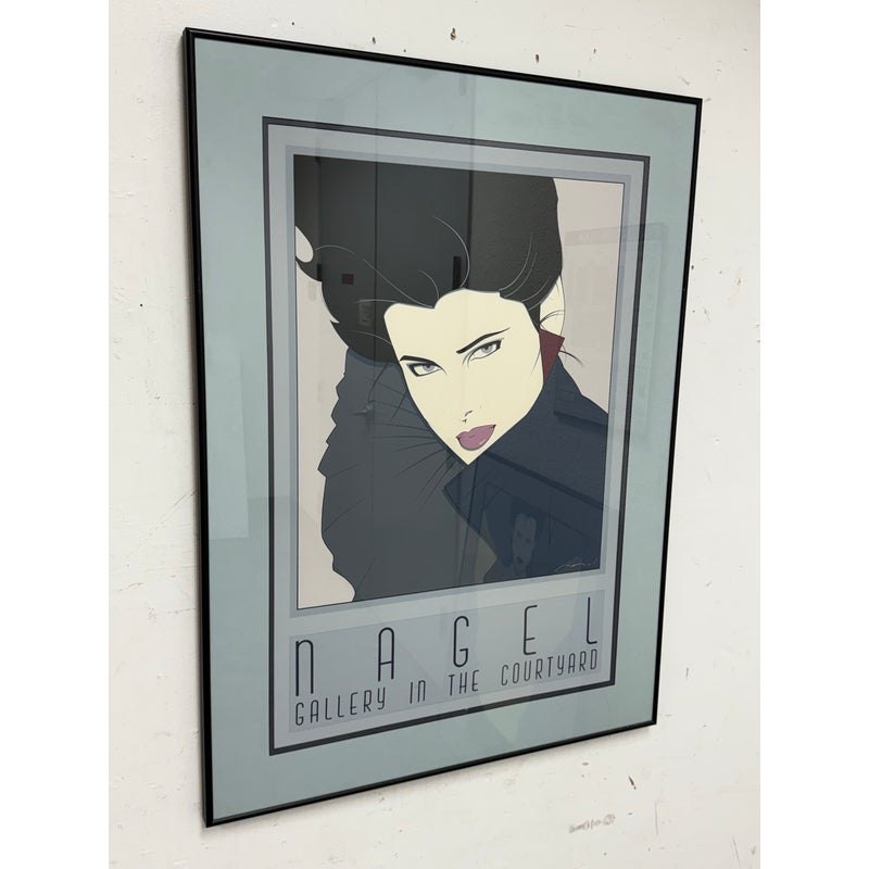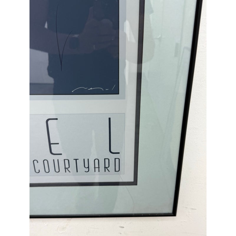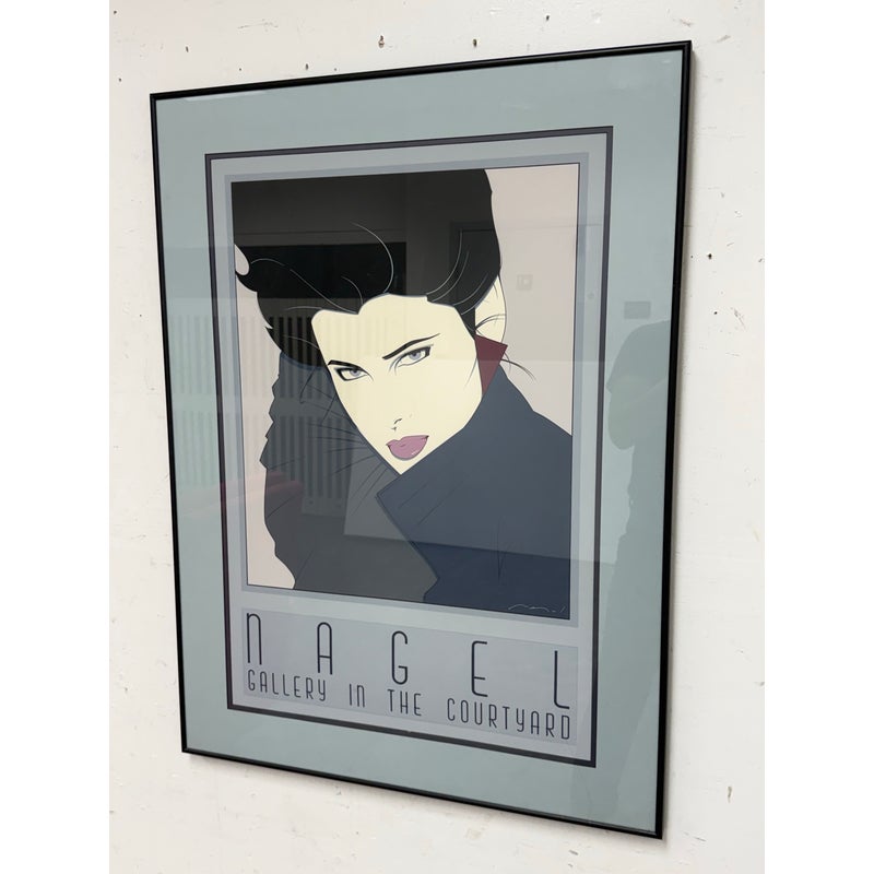 Design Plus Gallery presents a Circa 1980’s “Gallery in the Courtyard” Silkscreen from Patrick Nagel’s (1945-1984). An American artist and illustrator known for his distinctive Art Deco-influenced style and iconic depictions of women. “Commemorative #7” is a serigraph (silkscreen print). Nagel’s work is characterized by high-contrast colors, bold lines, and elegant, stylized portrayals of women, often incorporating influences from Japanese woodcuts. Nagel’s art became synonymous with the glamorous and sophisticated aesthetic of the 1980s, and his work, including this serigraph, is highly sought after by collectors. Custom framed, In good condition, visible and minimal wear from usage, a scratch is visible on bottom right.