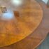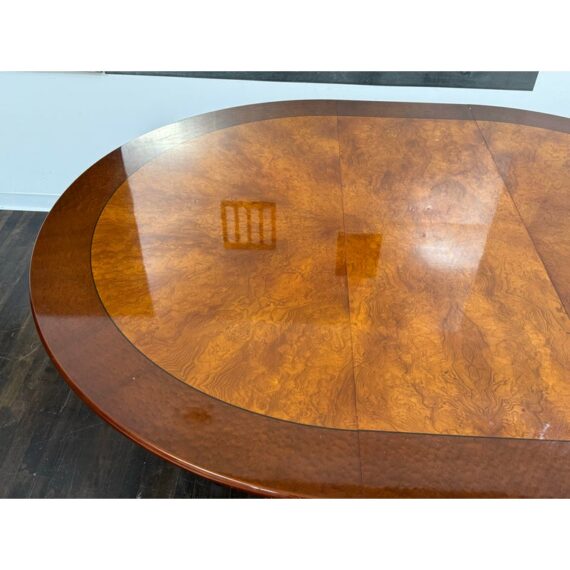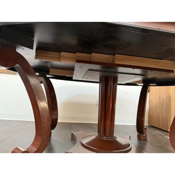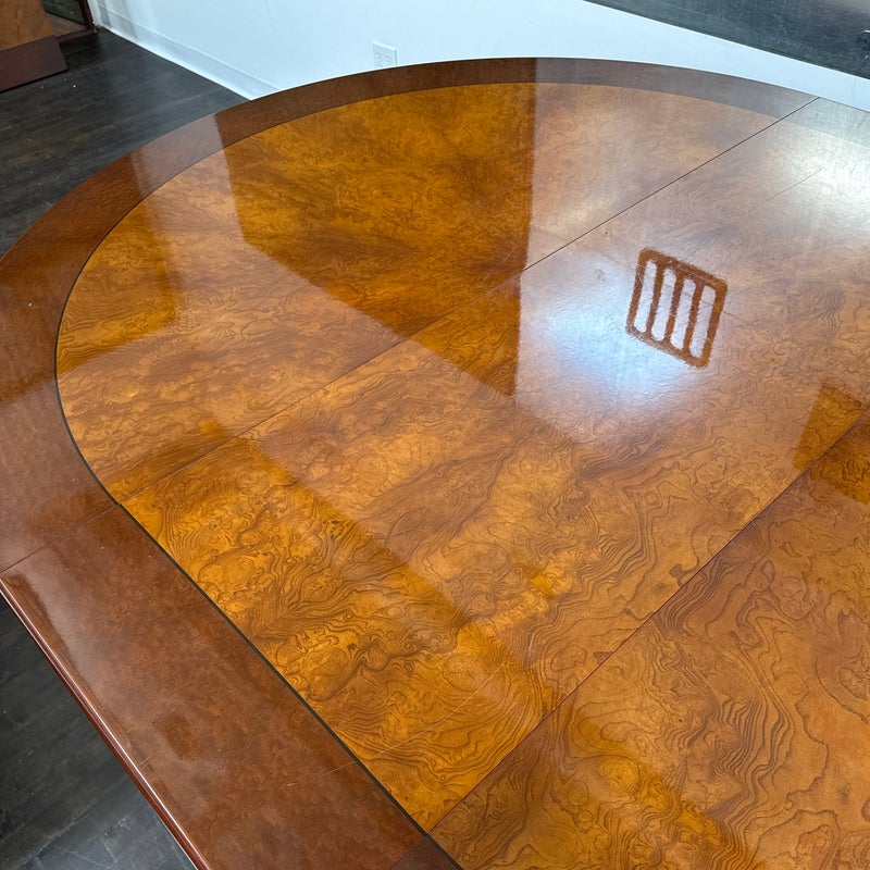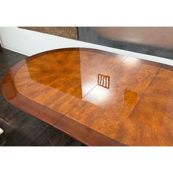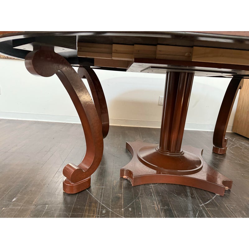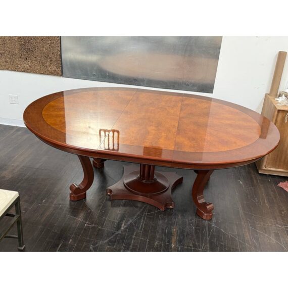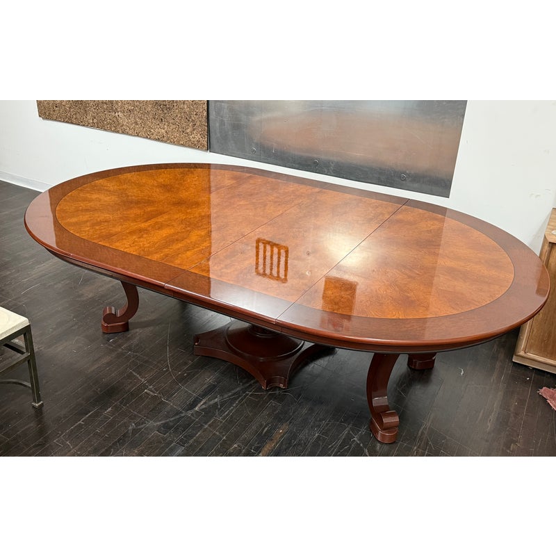 Design Plus Gallery presents a Custom Design Extension Table by E-Street Makers. Elevate your dining or meeting space with this elegantly versatile extension table, masterfully designed to adapt to various occasions, from intimate dinner parties to dynamic conference gatherings. Starting as a classic round table the table seamlessly extends to a sophisticated racetrack oval shape that provides generous seating with a visually striking silhouette. The tabletop showcases a harmonious two-tone wood finish in warm hues accentuated by a lustrous semi-gloss sheen. The clever extension mechanism allows it transform. Anchoring the table is a robust pedestal base, thoughtfully crafted with four legs that extends with the surface. This unique architectural detail not only ensures unwavering support but also adds sculptural interest to the design. In good condition, visible and minimal wear from usage. Visible chips on frame and surface. The extension mechanism needs to be explained more. Made in USA.