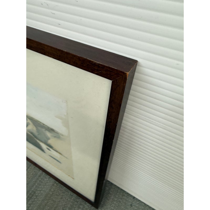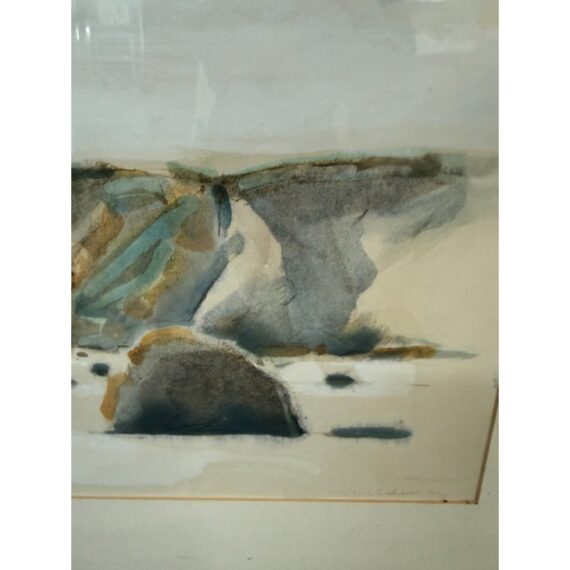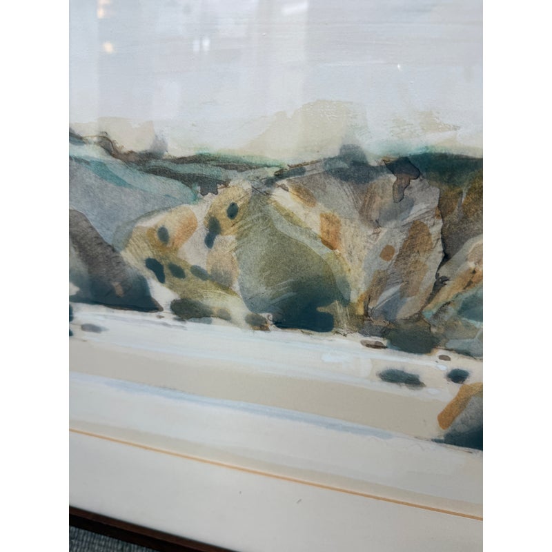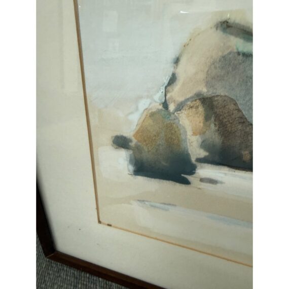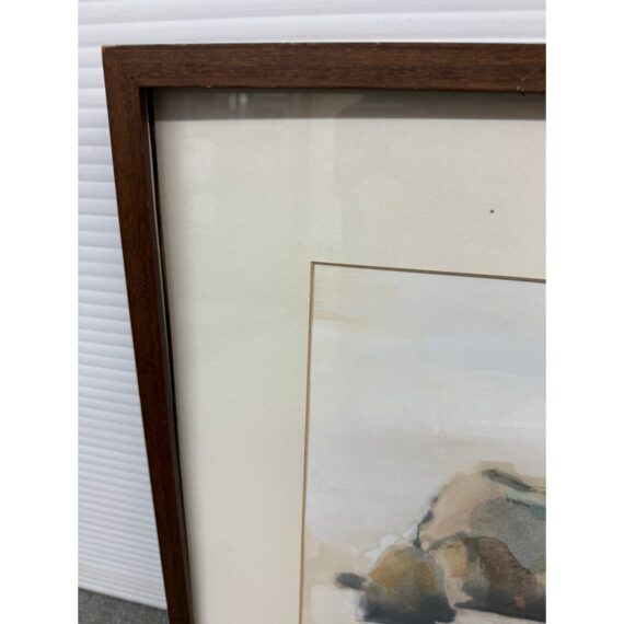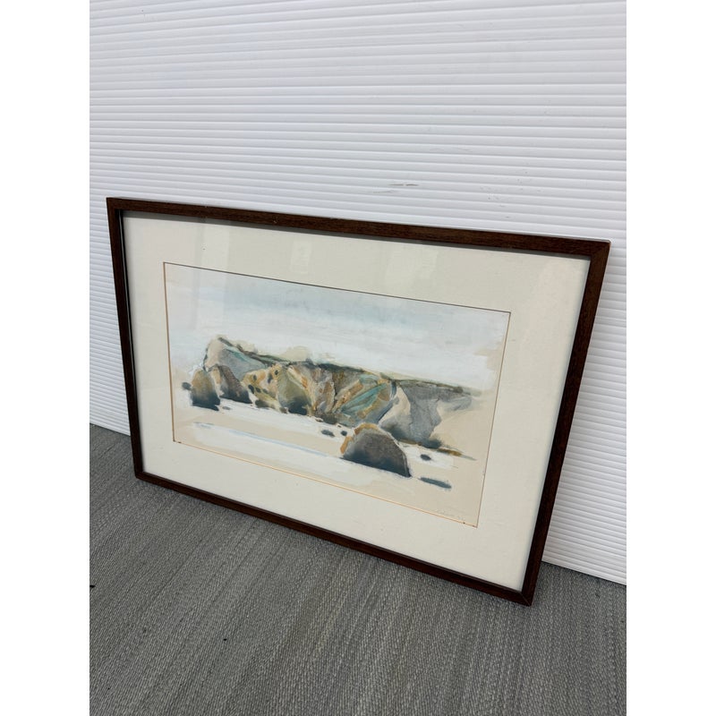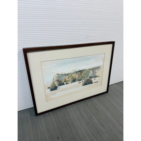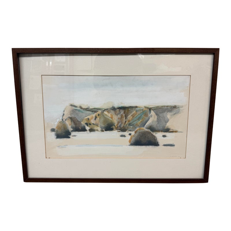 Design Plus Gallery presents a Circa 1982 Original Water Color of “San Francisco Bay” from Artist Larry Welden (1922-2012). This watercolor painting captures a tranquil, far-off view of hillsides and rugged cliffs that rise gracefully near the beach. The artist’s brushwork is soft and expressive, with sweeping strokes of creamy whites and gentle grays forming the contours of the land. Tints of earthy browns and subtle greens hint at patches of wild grass and sunlit rock. The cliffs and hills undulate gently, their forms softened by the watercolor’s fluidity, suggesting a landscape shaped by time and wind. The foreground suggests the sandy edge of the shore, mere feet from where the ocean’s waves roll in, their presence felt but not directly depicted. The entire scene radiates serenity—a quiet moment where the vastness of the sea meets the steadfast earth, inviting the viewer to pause and breathe in the peacefulness of nature’s embrace. The artwork is presented in wood frame with a cream matte. Larry Welden, was a celebrated Sacramento artist and teacher, brings his mastery of watercolor to this piece, creating an atmosphere that is both contemplative and dynamic. The artwork would benefit with a new matte and frame. Signature on bottom right. In good condition, visible distress on frame and minimal soil wear from age. Painted in California, USA.