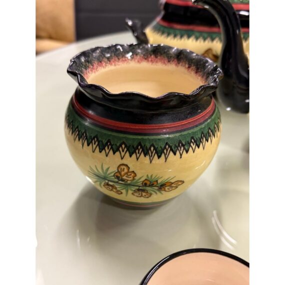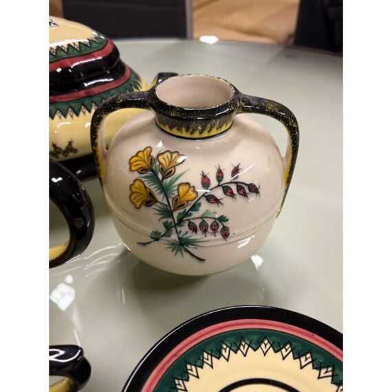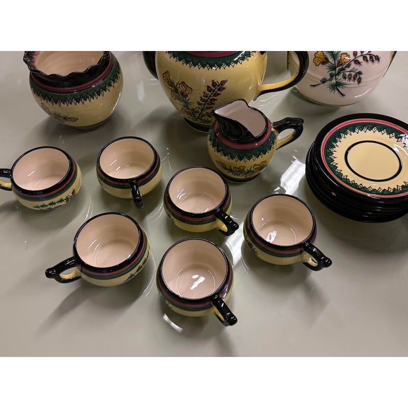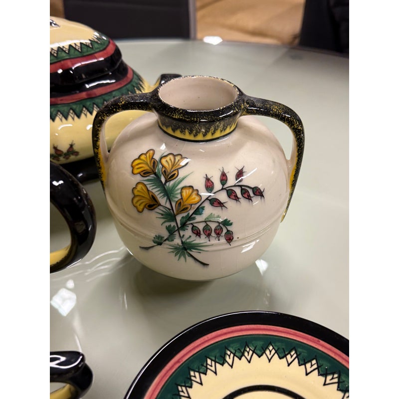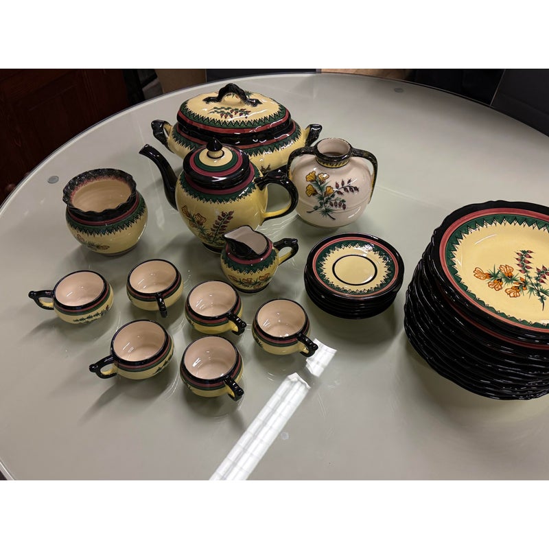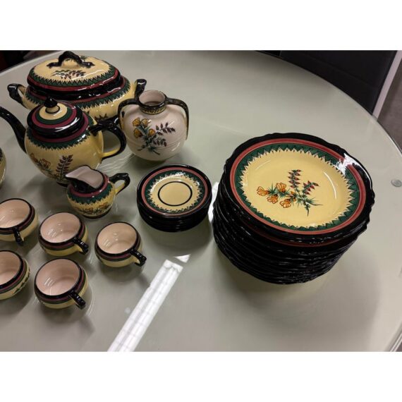 Design Plus Gallery presents Set of Thirty-One French Faience Serve-ware by Henriot Quimper. These are all handmade pieces with hand-painted florals + botanical sprigs across a bone yellow background that is framed by green with red banding encircled a black rim. The set includes this assortment of serving and tea pieces: a teapot, a covered tureen, a creamer, a lidded sugar bowl, a two-handled vessel, multiple handled cups, and a mix of plates and small dishes. Gloss-glazed faience gives each piece a smooth surface while preserving the character of hand-painted brushwork and slight variation from piece to piece. They are each signed by artist + numbered. They are in good condition with two saucer plates having a chips more pronounced then the usual visible and minimal wear from usage. Made in France.