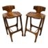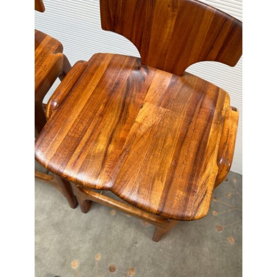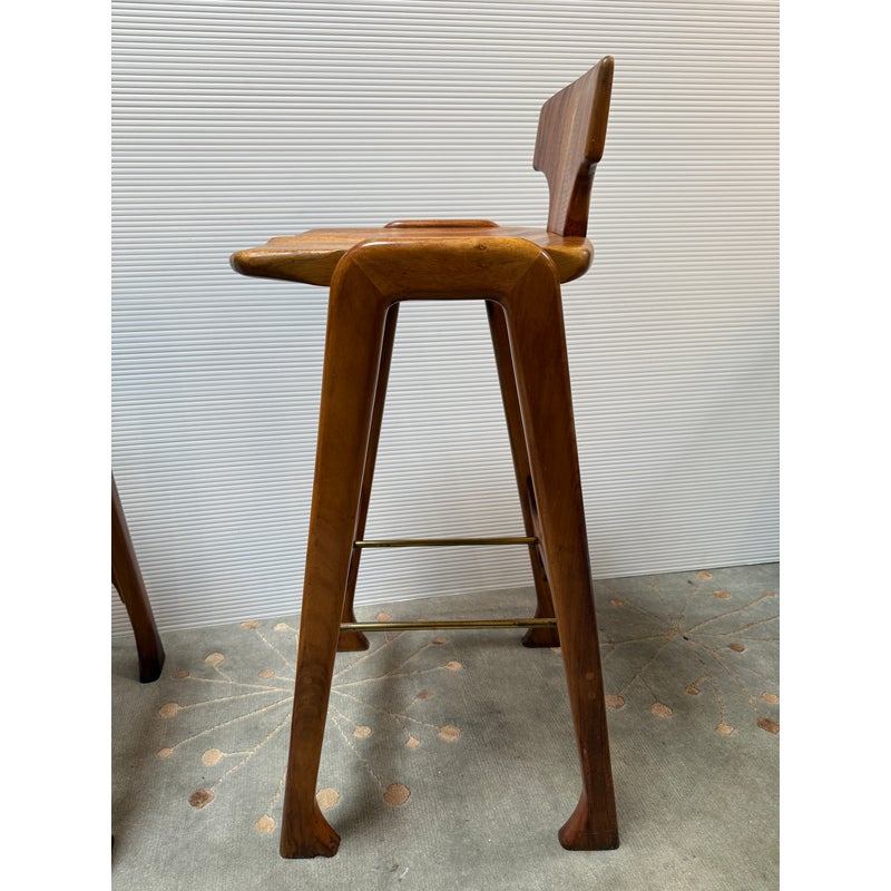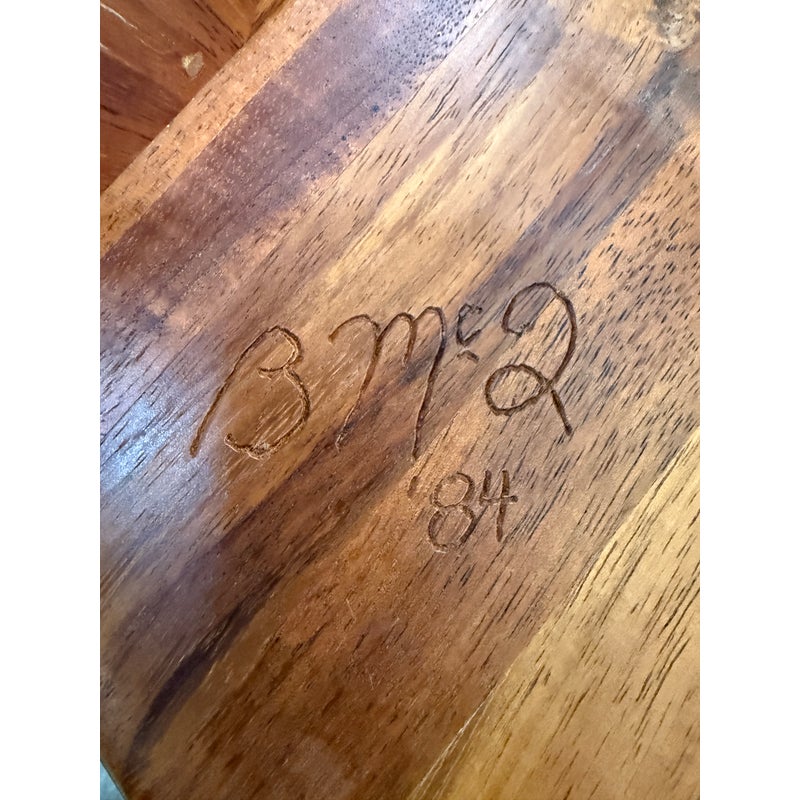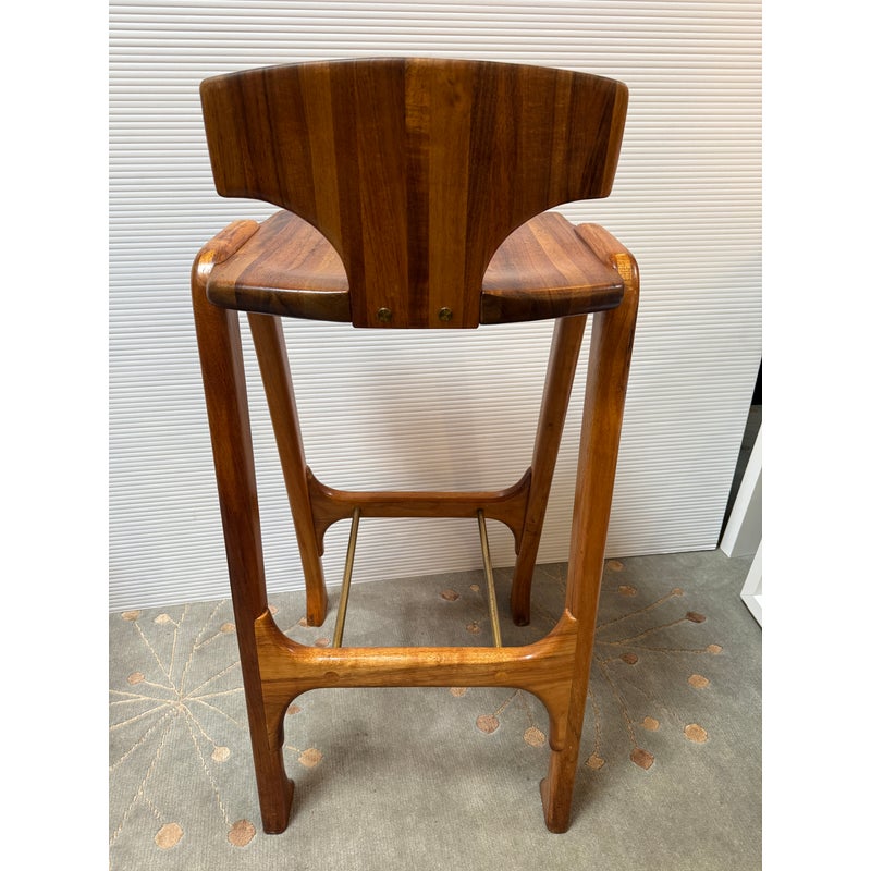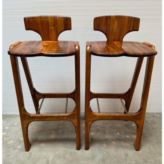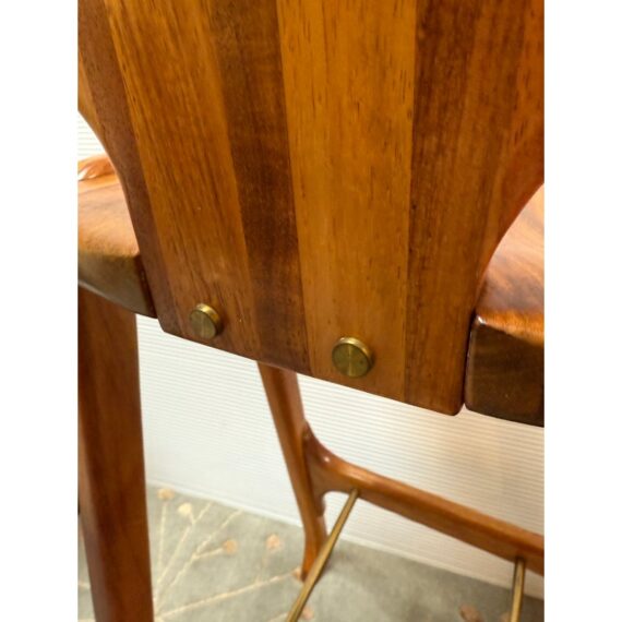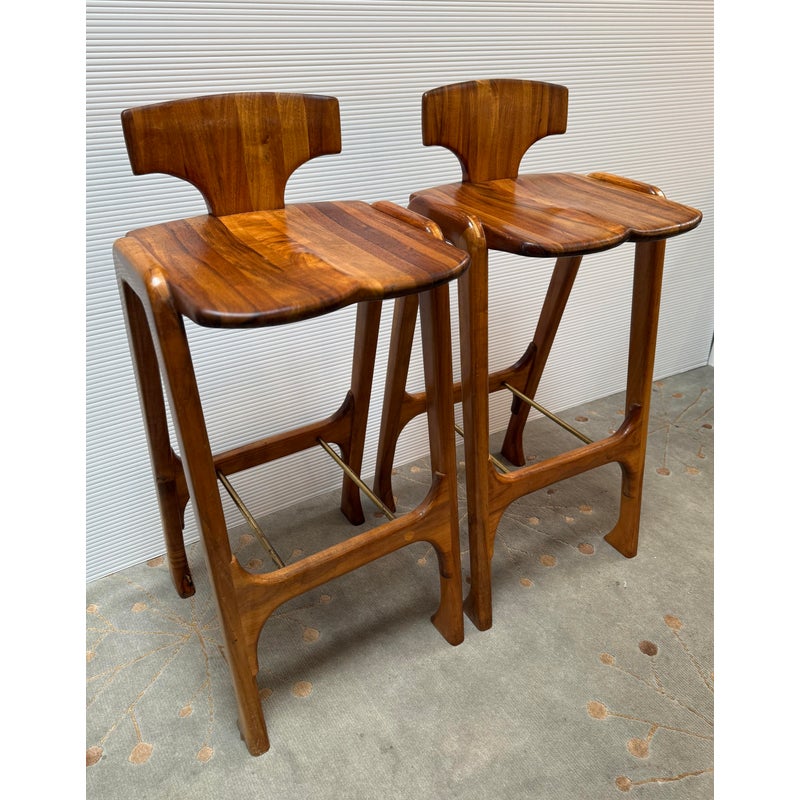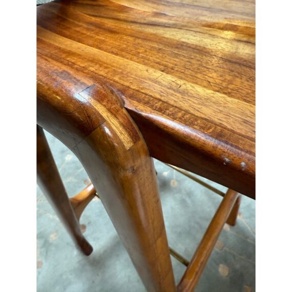 Design Plus Gallery presents a Pair of Koa Wood Bar Stools from Bruce McQuilkin. The stools are considered to be functional art as they are beautifully hand crafted from solid koa wood made by noted California builder Bruce McQuilkin in 1982. Please note the an etched signature by him on underside of stools. The more closely these stools are examined, the more evident is the major talent McQiulkin had. The solid koa that the stools are made from is now almost impossible to get. They are in excellent original condition with minimal wear for their usage.