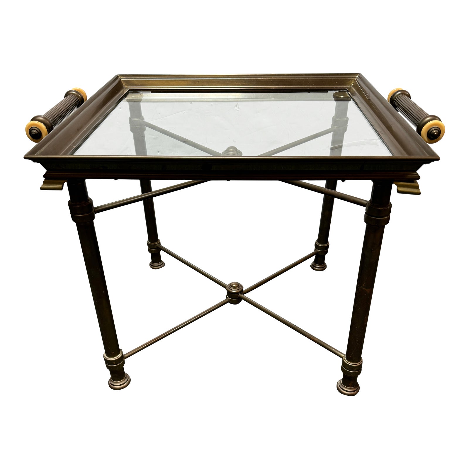 Design Plus Gallery presents a Circa 1984 French Tray Table by Chapman. Classic French directoire styling with cross bracing, this two piece table aims to be useful. Scaled beautifully, the handled inset glass tray lifts off the stand for serving. Natural patina has made this brass piece glow. Little evidence of surface wear, just patina; condition is good for age and use.