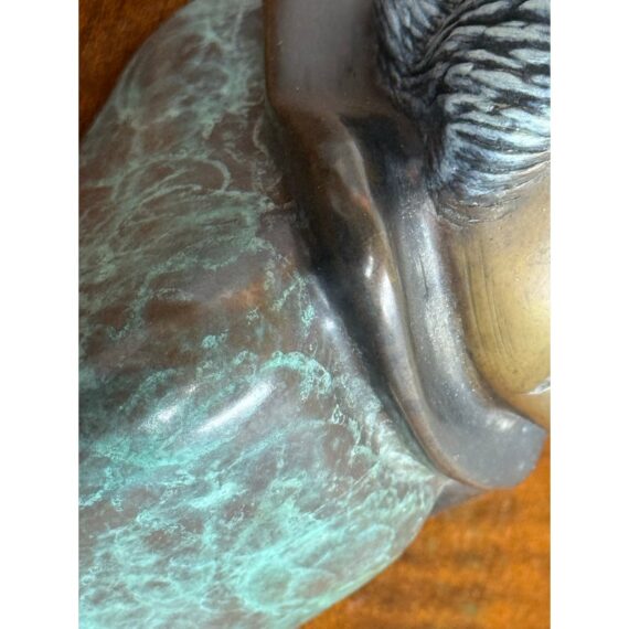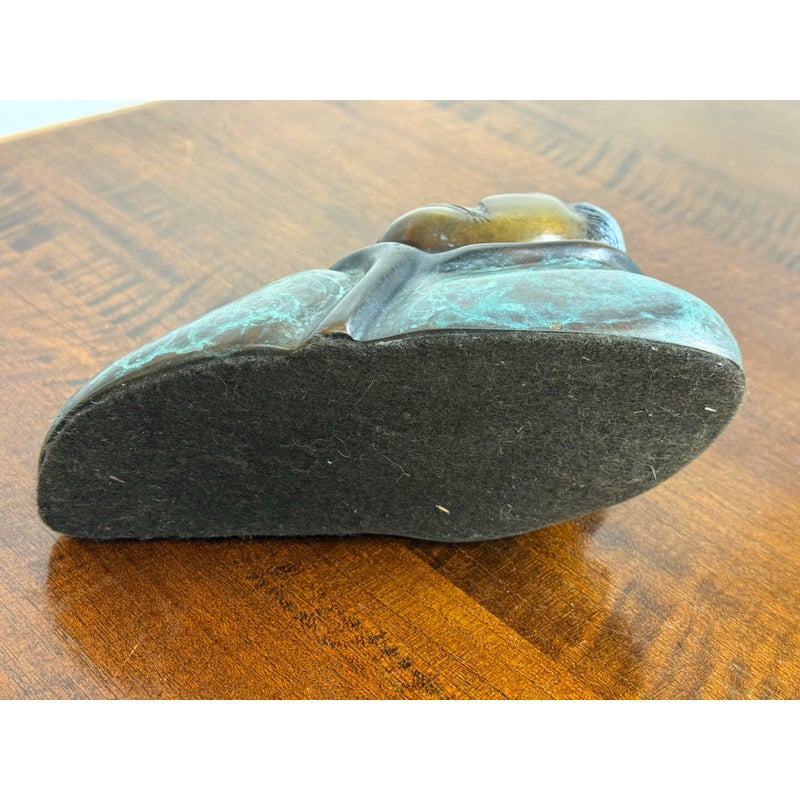 Design Plus Gallery presents a Bronze Sculpture of an Intuit Woman by Sharon Spencer. The piece is signed with the date of 1985 and is the last in a series of twenty. When Spencer began her exploration of bronze the amazing patinas that give her work such characteristic color began to emerge. Patinas are a treatment of the bronze with various salts, minerals and acids that react chemically with the bronze to change its color. Working with Artworks Foundry, Sharon became a master at this, and often has her pieces look like stone or marble. Sharon’s work reflects her fascination with Native American, Eskimo, and Asian cultures. It affirms her respect for animals and the earth, and this thematic thread is constant throughout her body of work, which ranges from large outdoor abstract pieces to small-scale, figurative work. This sculpture is in good condition for its usage with minimal wear and a testament to her artistry.