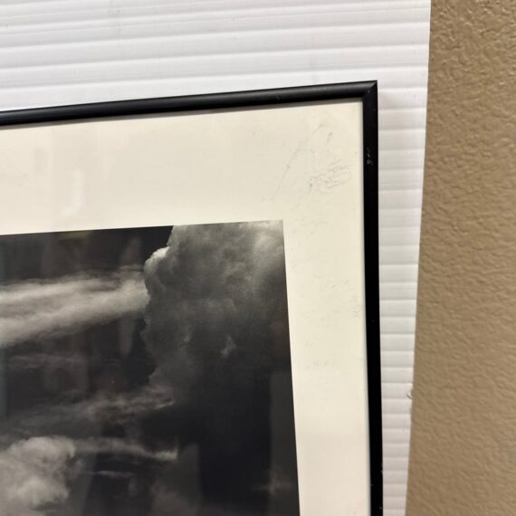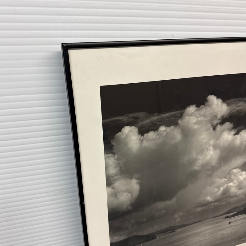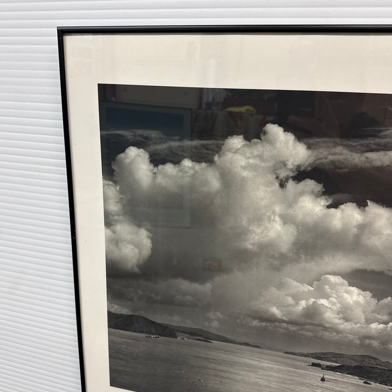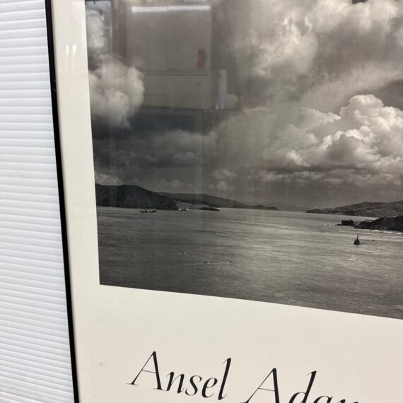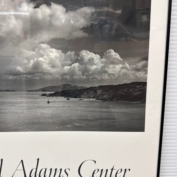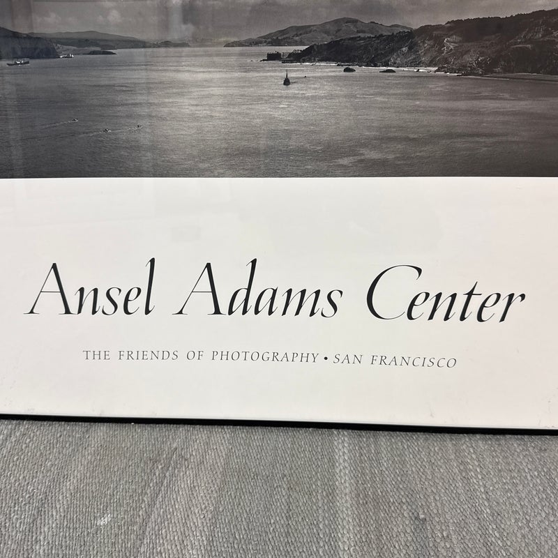 Design Plus Gallery presents a Poster from the Ansel Adams Center in San Francisco. The poster has Friends of Photography, San Francisco written below that stunning seascape of the San Francisco Bay Area. The photograph of the image was originally taken by the artist in 1953 and offset lithograph was produced in 1986. The waters shown was the view of the Golden Gate Strait before the construction of the Golden Gate Bridge. The poster is encased in a black metal frame and is in good overall condition for its usage.
