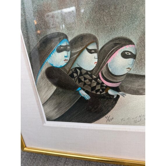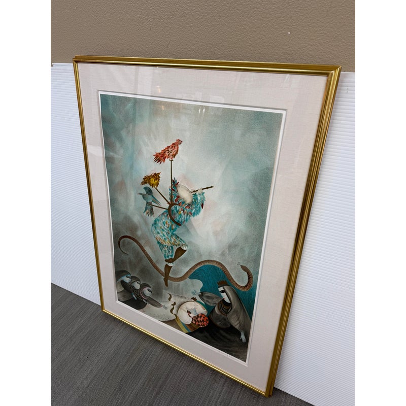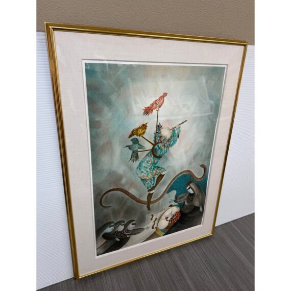 Design Plus Gallery presents “The Magic Flute” Lithograph by Graciela Rodo Boulanger. In 1986, the Metropolitan Opera of New York commissioned Boulanger to create a poster as well as a limited edition original lithograph commemorating Mozart’s “The Magic Flute” to promote their 1987-88 season. The signed lithograph from the artist is found on the lower center with its limited number of 31 of 300; along with a note from the artist to recipient. The ashen color palette in the original lithograph of “Magic Flute” is the antithesis of what she is so well-known for, but this work full encapsulates the mood of one of the world’s most celebrated operas. While remaining true to her form and colorful imagination, “Magic Flute” is a true testament to the talent of this great artist. Is in good condition with minimal wear for its overall usage.
