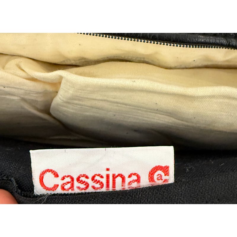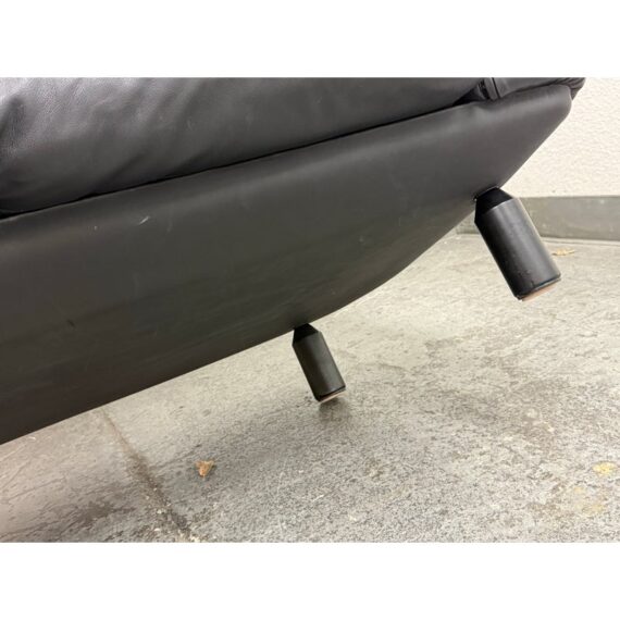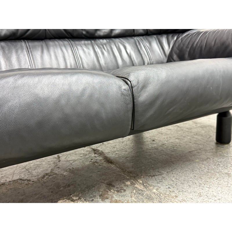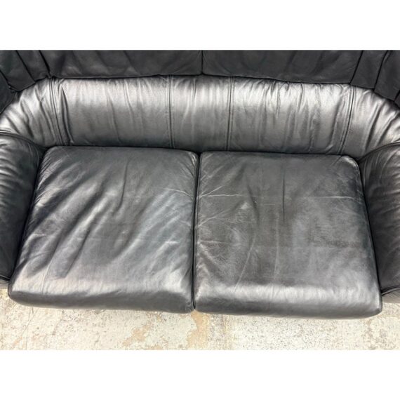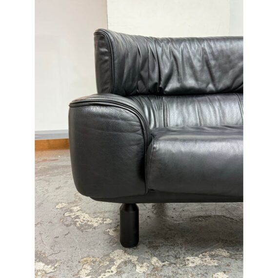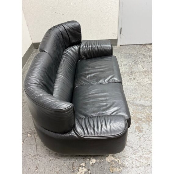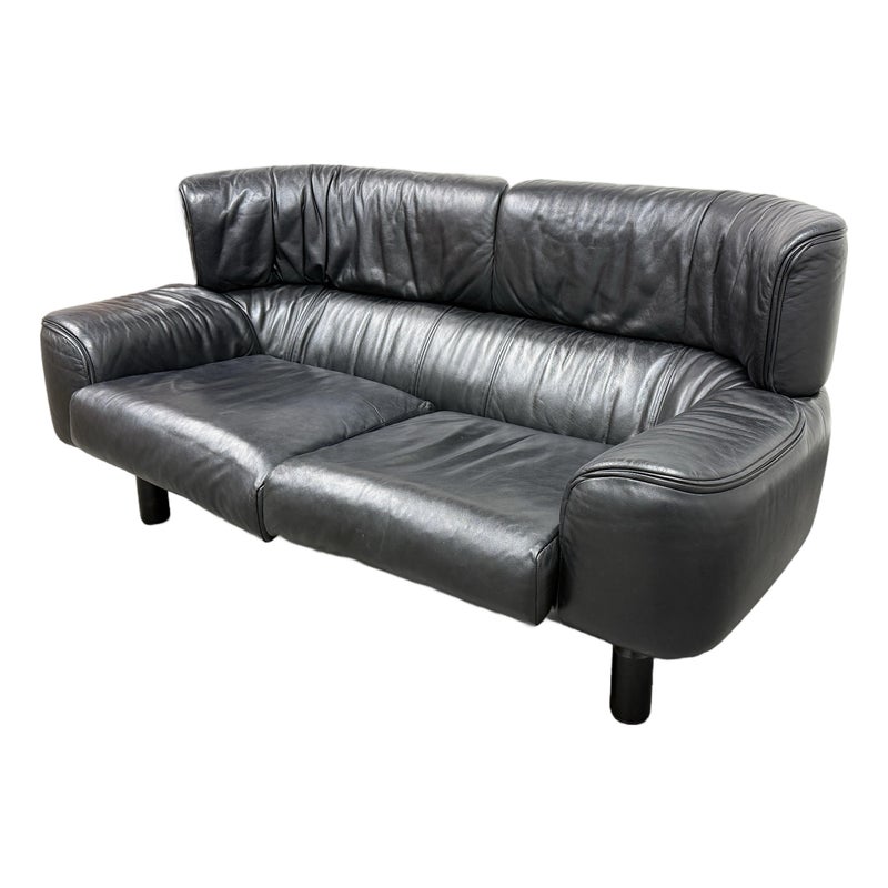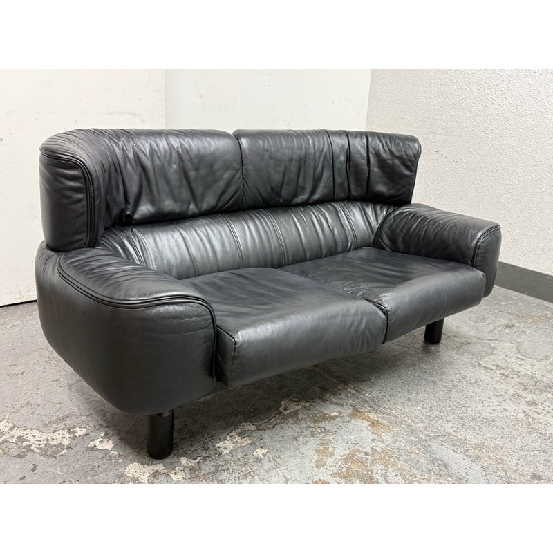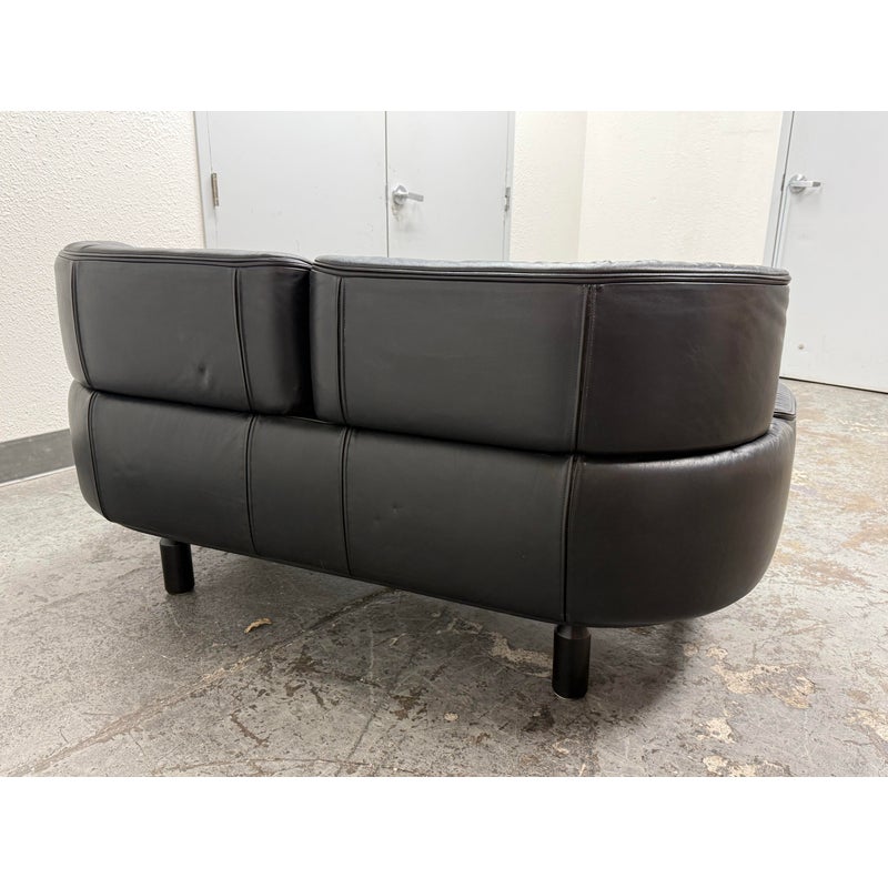 Design Plus Gallery presents a RARE Circa 1987 Bull Loveseat for Cassina. Created by Italian designer Gianfranco Frattini for Cassina. A refined Frattini’s celebrated “Bull” collection, his final project produced by Cassina for just one year in 1987. Upholstered in supple black leather, the loveseat exudes both luxury and comfort. The seat and back present plush cushion support, while the low, wide arms offer a contemporary sensibility that adapts easily to modern interiors. Displays minimal and visible wear consistent with age and careful use, enhancing its authentic character. This piece is a striking homage to Italian mid-century design and would make a sophisticated addition to any curated living space. In good condition, visible and minimal wear. Made in Italy.