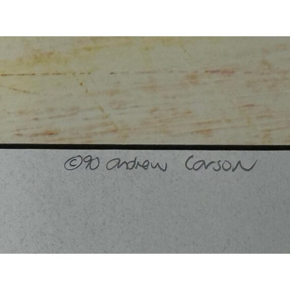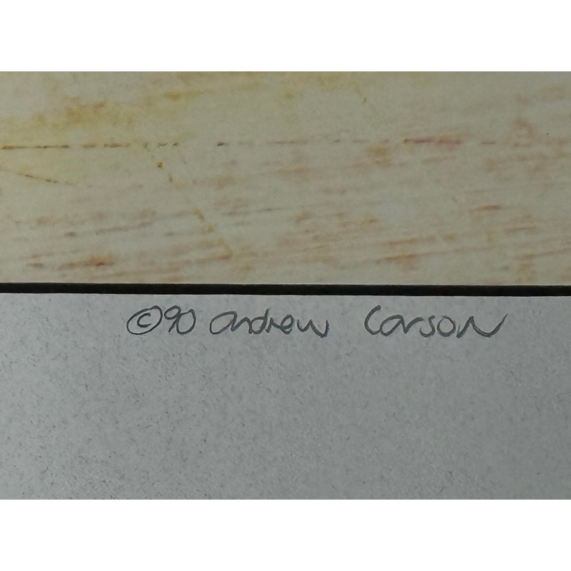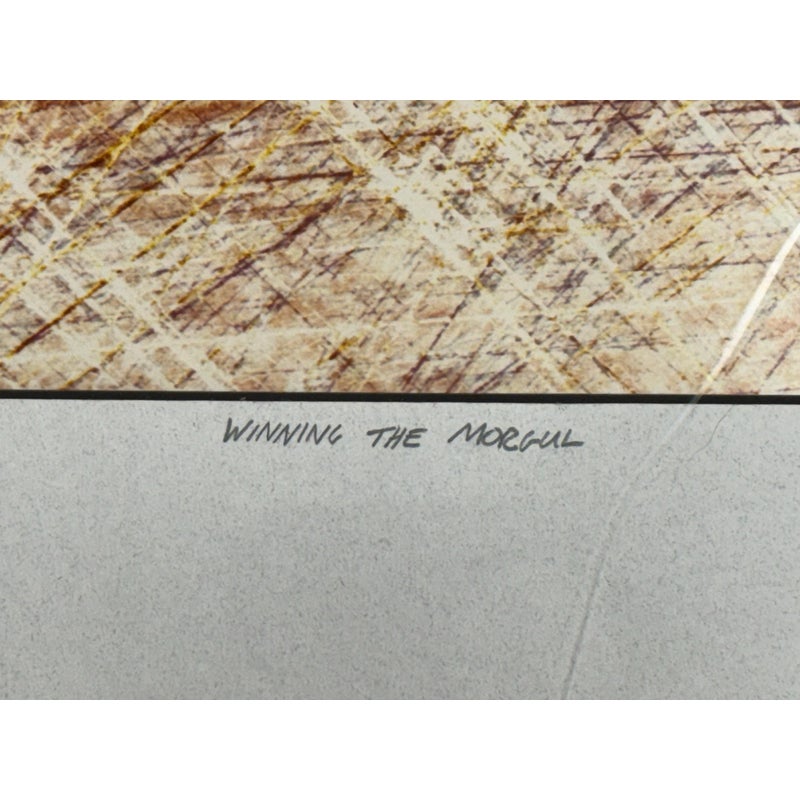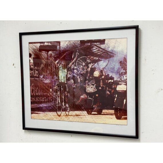 Design Plus Gallery presents a Limited Print by Artist Andrew Carson entitled “Winning the Morgul” from 1990. The print is a vivid account of cyclists vying for the top positions in their road race, in this case as sponsored by Coors. There is a prominent winner right as they capture the title. The print is number 11 of 35 in pencil along with the date, signature and title under the image. It is framed and ready to hand with minimal signs of visible wear.