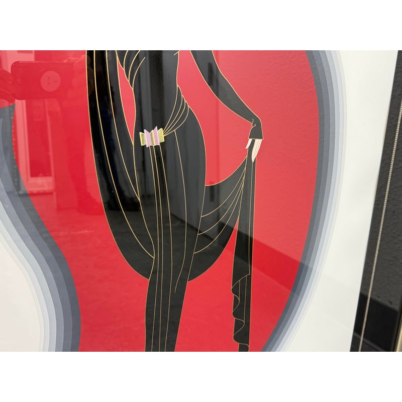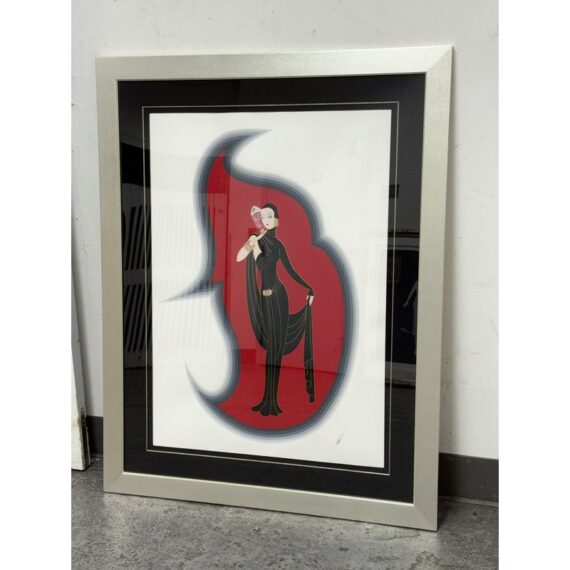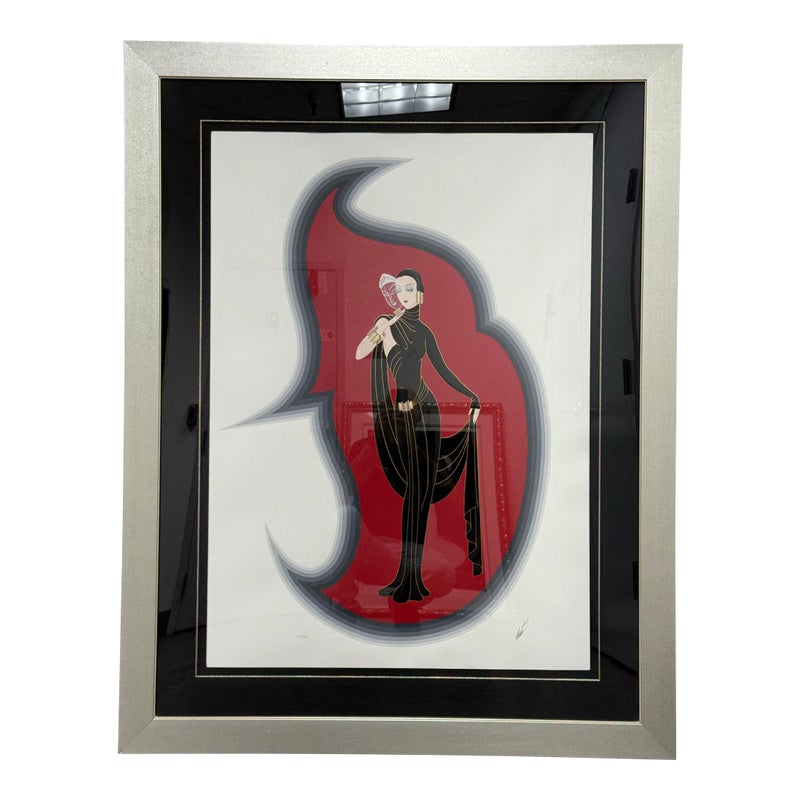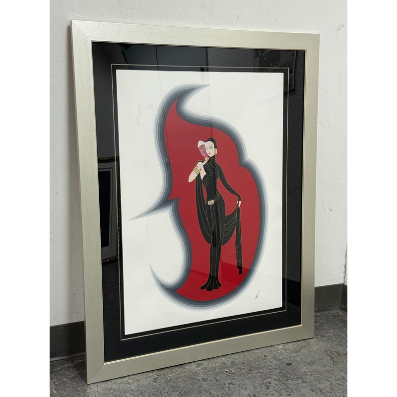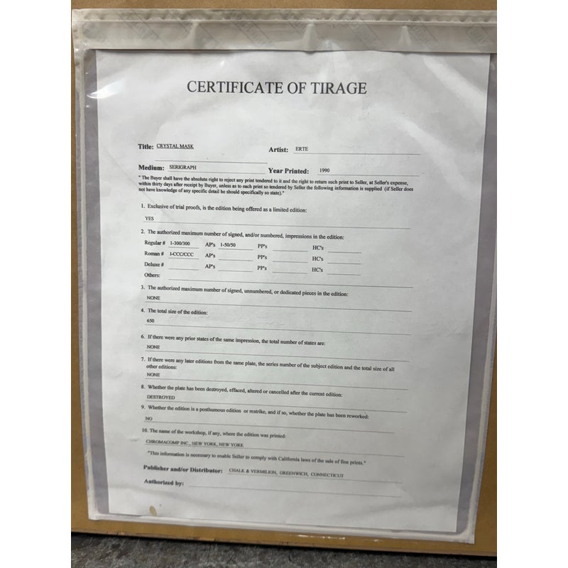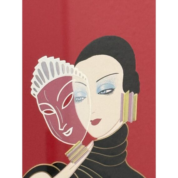 Design Plus Gallery presents a “Crystal Mask” Serigraph by Erté. The artwork epitomizes the essence of the Art Deco movement. This piece, created in the genre of a poster, showcases the signature style of Art Deco with its bold geometric forms and luxurious visual elements. Presented within the silver frame and black matte is a woman, centrally positioned, wearing an adorned costume and headpiece. Of significant highlight you see a mask made of crystal giving the art piece its name. The costume has an elaborate design with sharp angles set in black, that contrasts against the blood red background. The detailing is precise, with every aspect of the attire reflecting the high fashion and elegance characteristic of Erté’s work. The backside of the signed piece offers a Certificate of Tirage. The piece is in good condition for its usage.