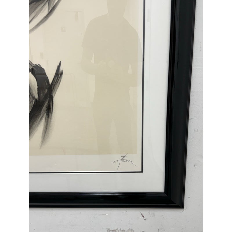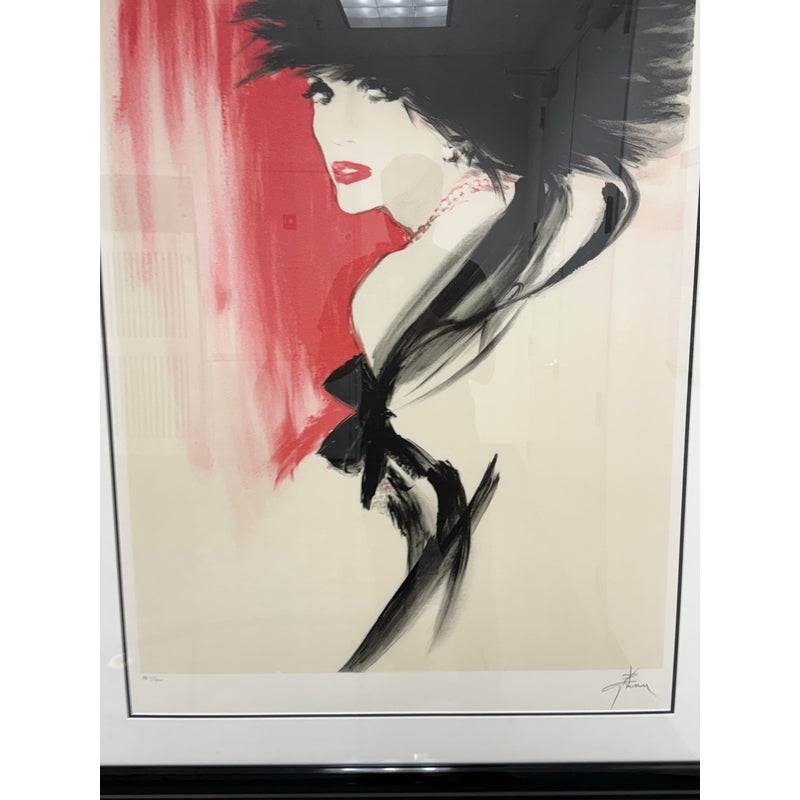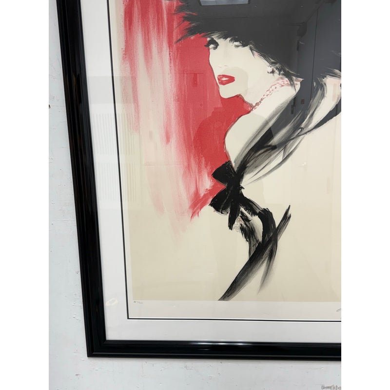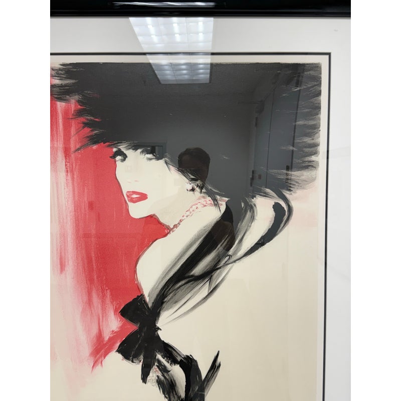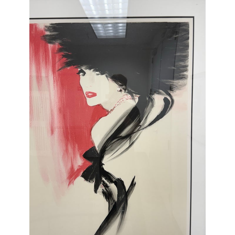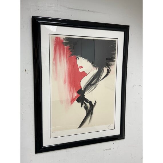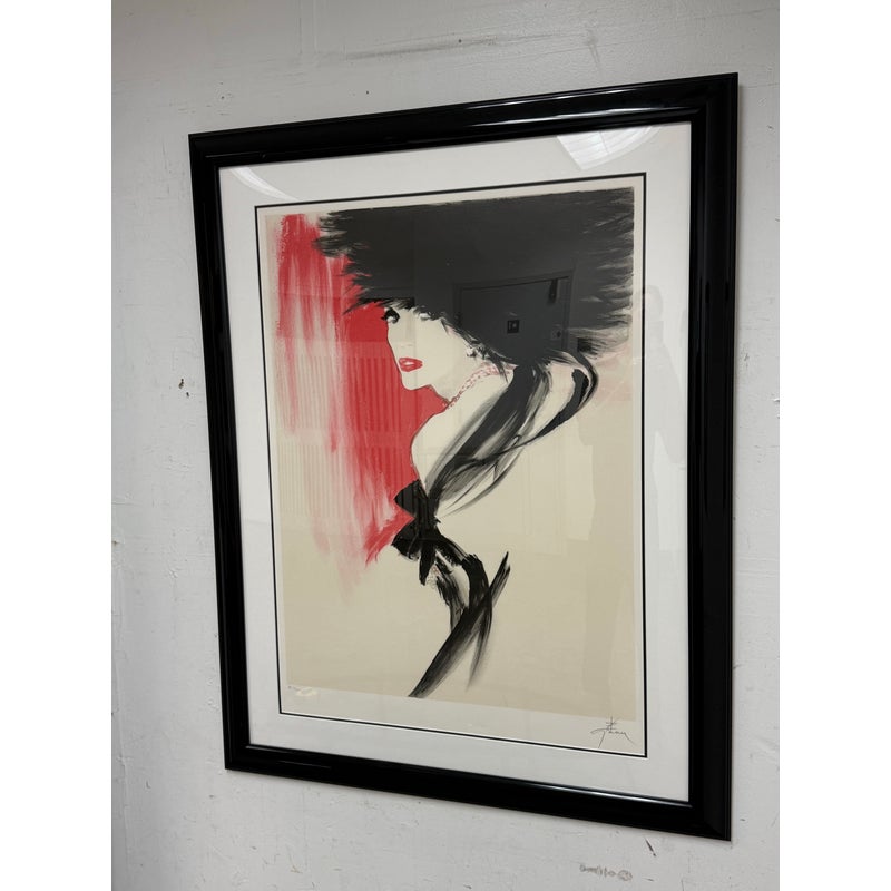 Design Plus Gallery presents “La Belle En Noir” an Artist Proof Print Hand Signed by Fashion Illustrator René Gruau. This piece was created for Fine Circle Arts, a U.S. gallery chain that sold art and related products, including posters and limited-edition prints. This is an artist proof a striking woman in a fashionable spread; black furry hat on with a flowing black scarf and red paint. Very post modern and of that time. It is signed by the artist with title and A/P. It is in good condition for its usage.