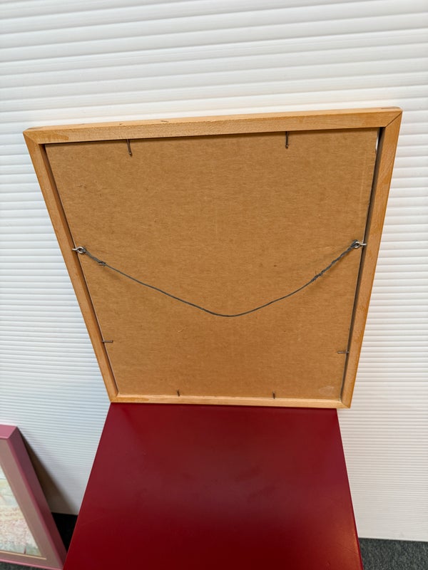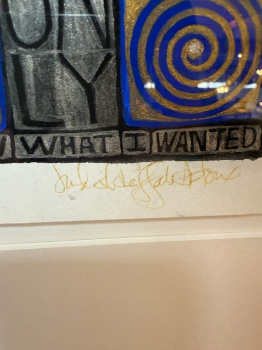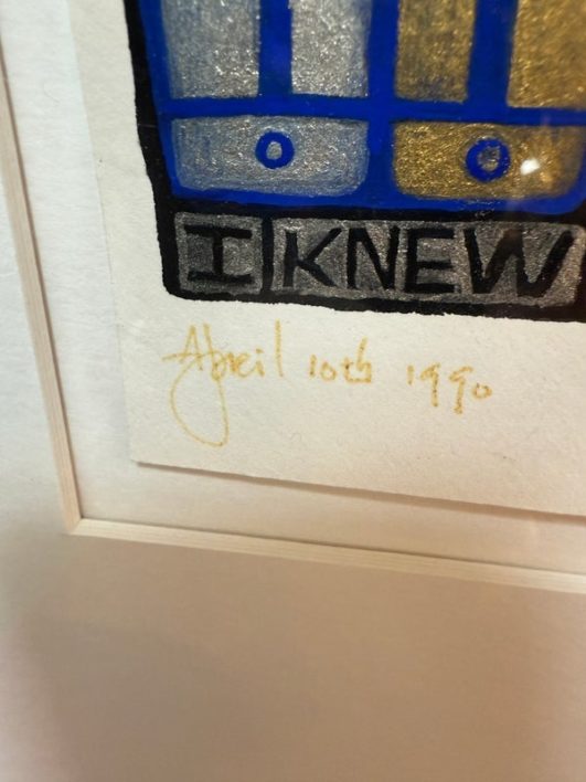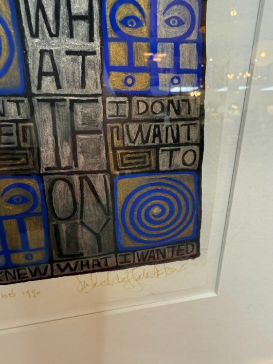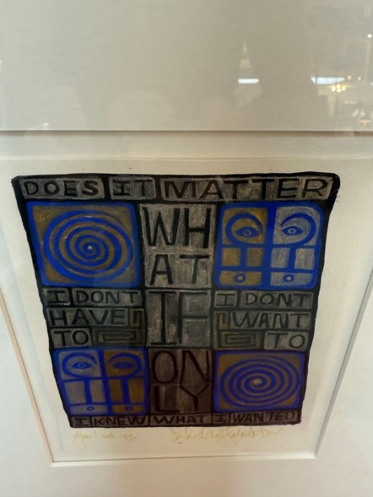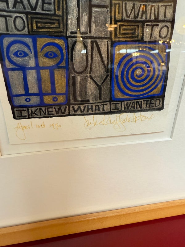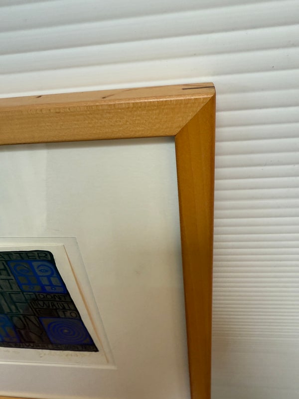 Design Plus Gallery presents a Post Modern Collage Type Art Work, Signed by Artist + Dated 1990. The art releases a powerful message about self of self. It has colors of bright blue with gray and black. Set in a white double matte with maple toned frame. Is in good condition with wear that is consistent with usage.