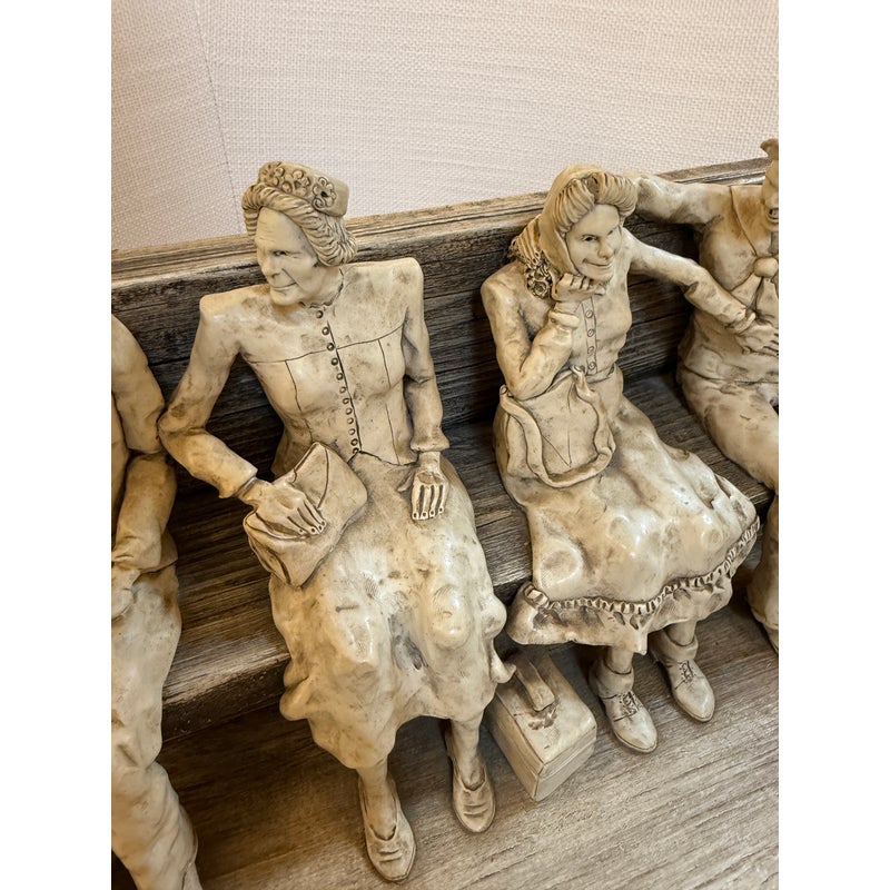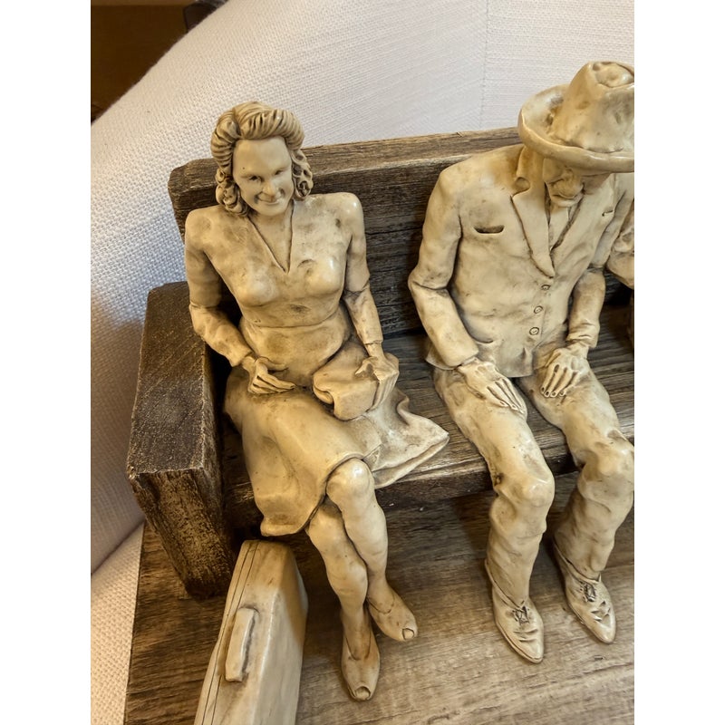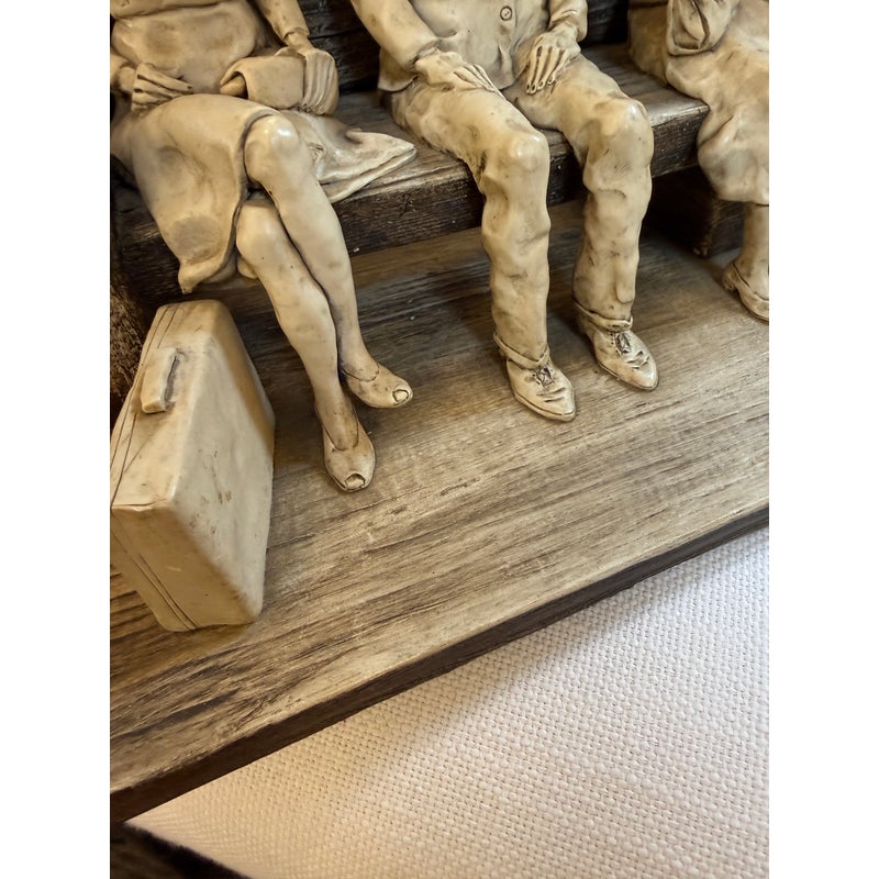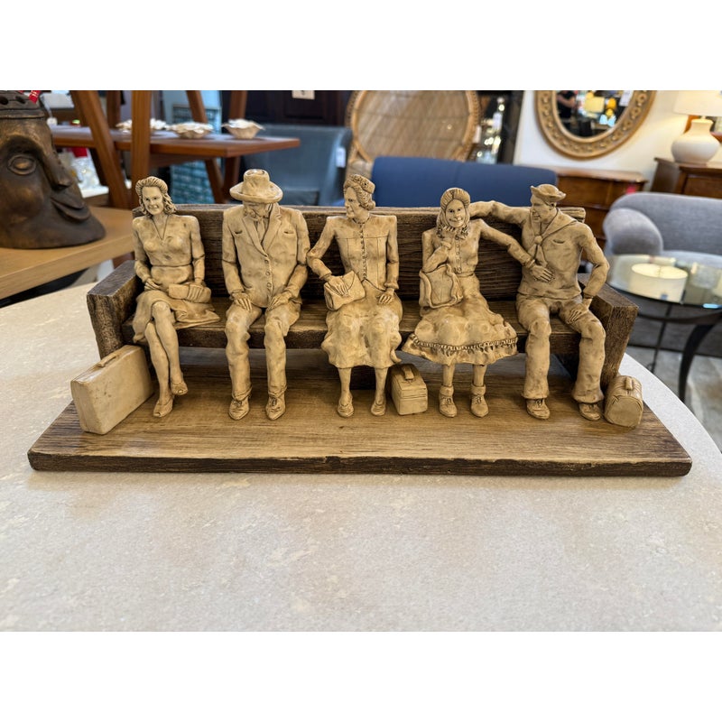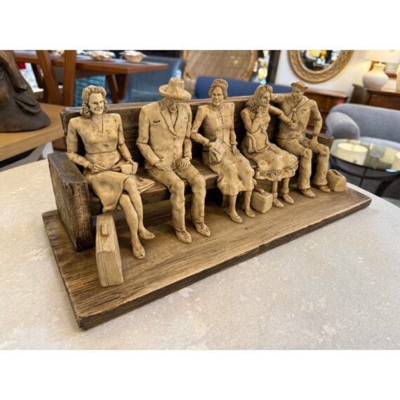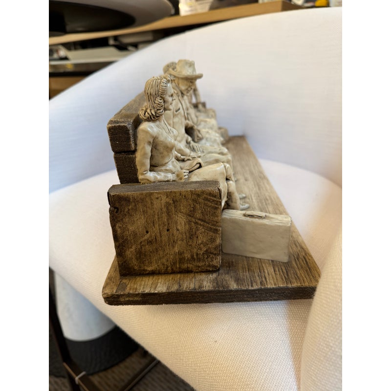 Design Plus Gallery presents a “The Waiting” Sculpture from Artist Betty Defuntorum. A figurative, expressive sculpture portraying five seated travelers on a bench, their bodies angled inward and outward in quiet anticipation. Luggage clustered beside several figures and their reserved postures suggest a station setting—perhaps a train or bus depot—where time is measured in departures and delays. The work is marked “DIFUNTORUM” on the reverse. Modeled with an emphasis on gesture over fine facial detail, the figures wear vintage coats, hats, and dresses that evoke a mid-20th-century era (circa 1930s–1950s). The bench and base carry a carved wood grain that grounds the scene in a specific place. Balancing individuality and anonymity, Difuntorum composes a shared moment of stillness: five lives briefly aligned on a single bench. The sculpture quietly explores themes of travel, migration, patience, and the fragile community formed by strangers who wait together. In good condition, visible and minimal wear, repairs were done. Crafted in California, USA.