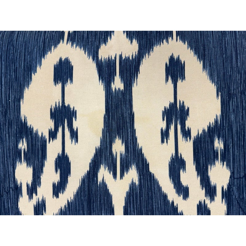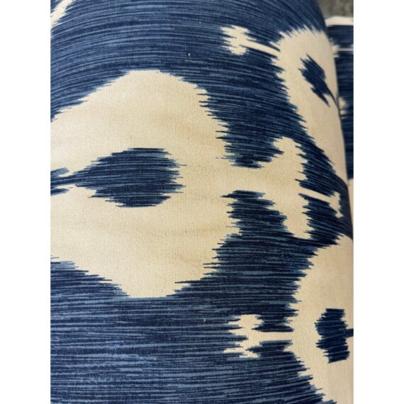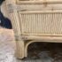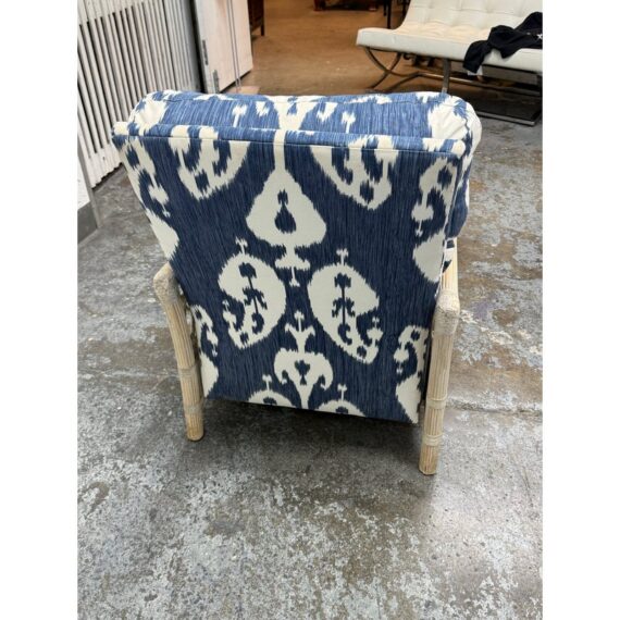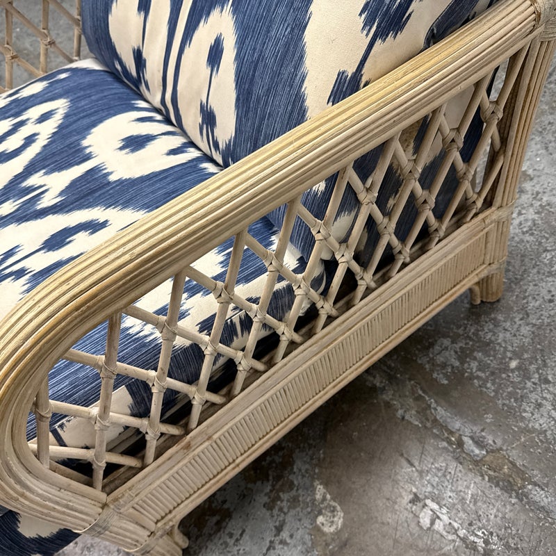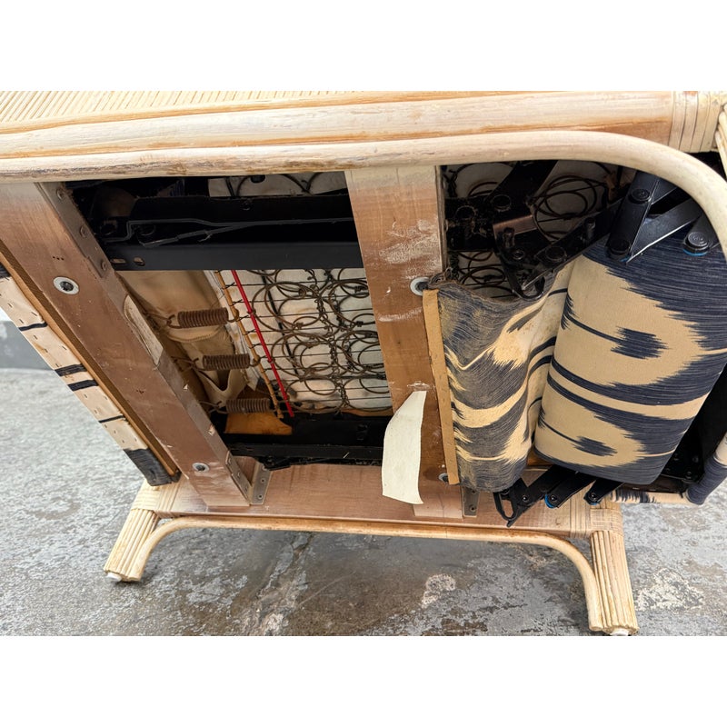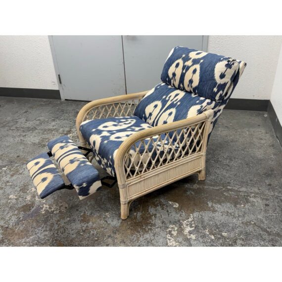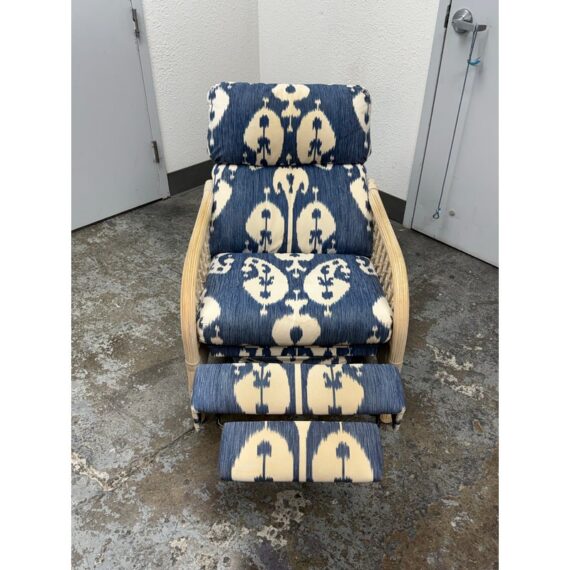Design Plus Gallery presents a Circa 1990’s 4147 High-Lounger Recliner from Bradington Young. The chair has a rattan-style frame with wrapped joints, lattice side panels, and a tailored loose seat and back cushion set. The reclining mechanism extends a padded footrest. Would benefit with new upholstery or a professional deep cleaning, the frame shows heavy weathered surface wear consistent with age, it is in fair condition with visible and minimal wear from usage.