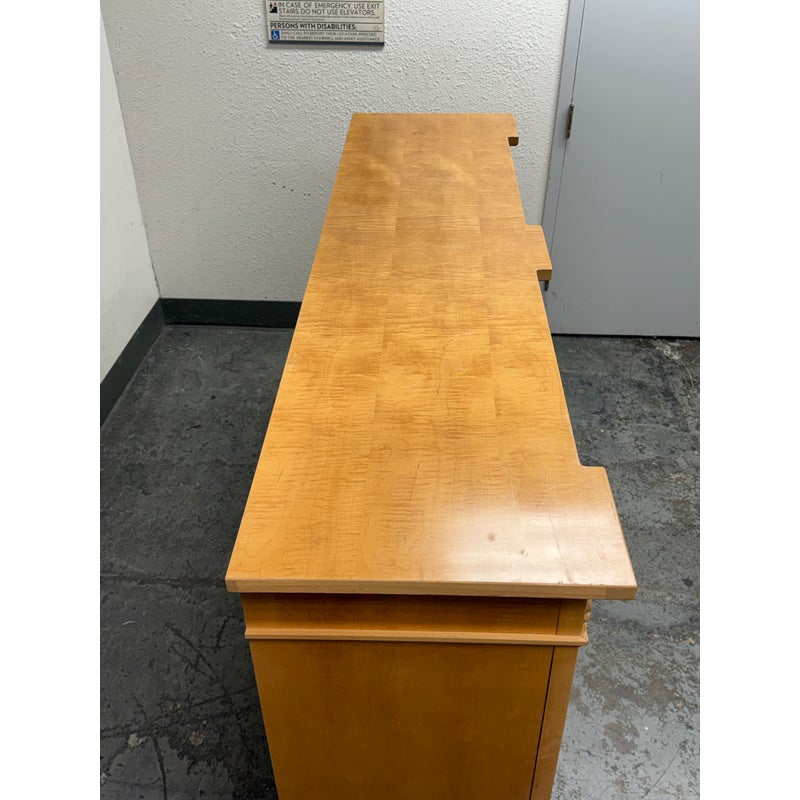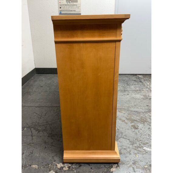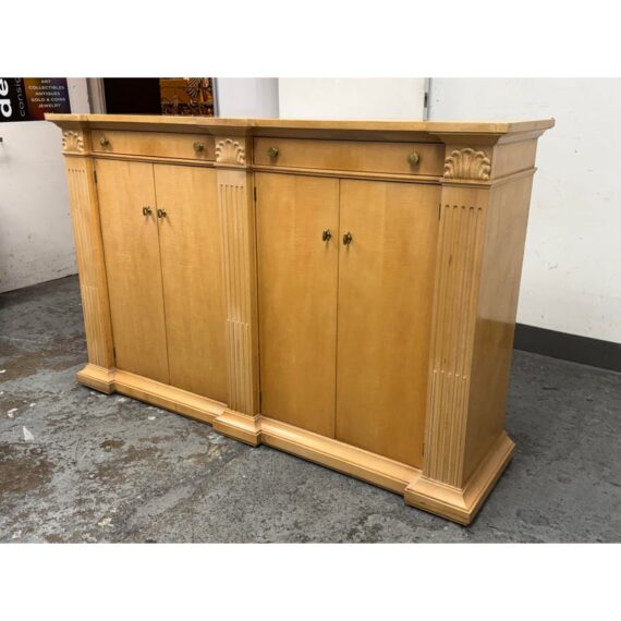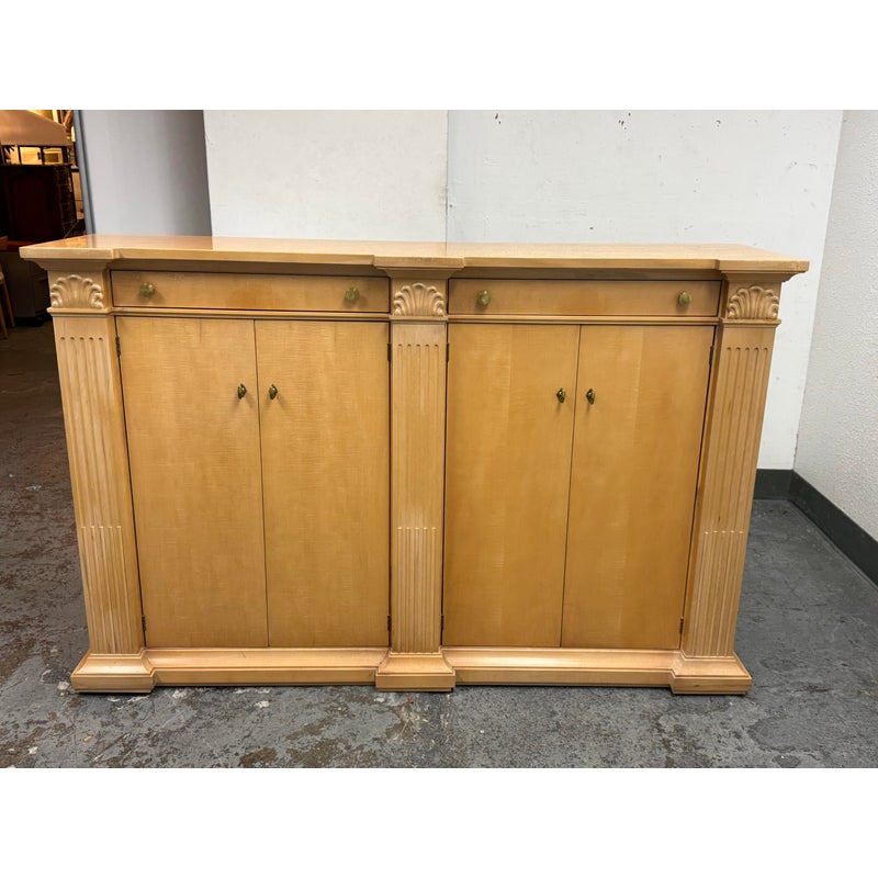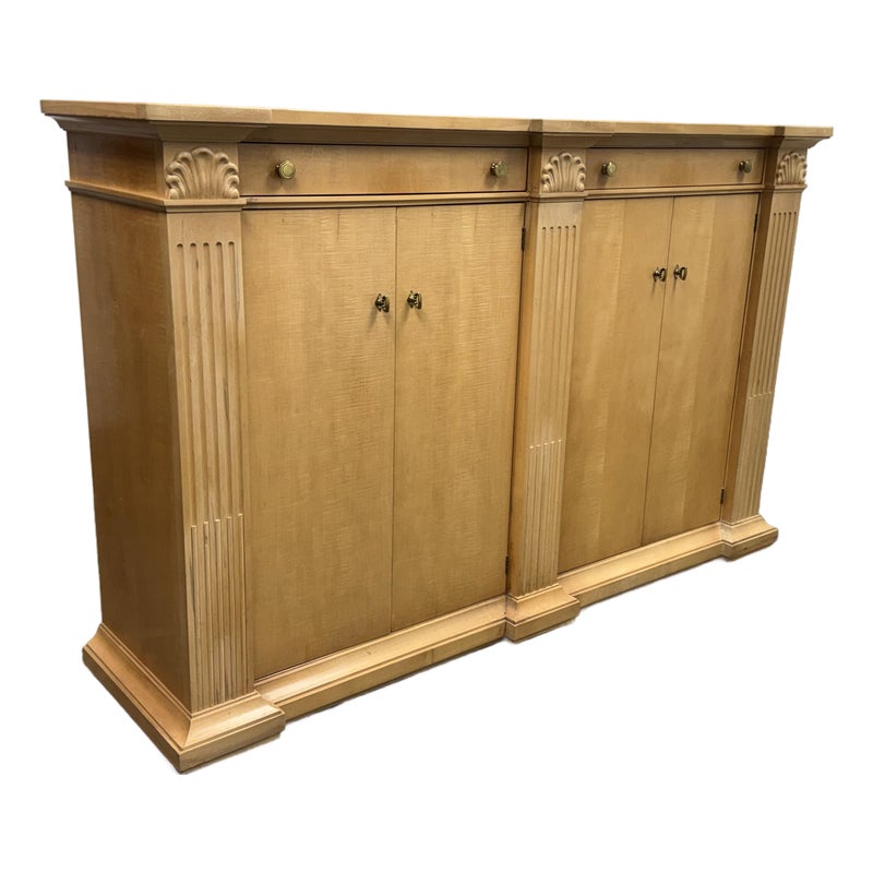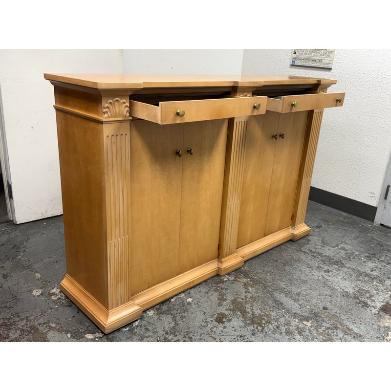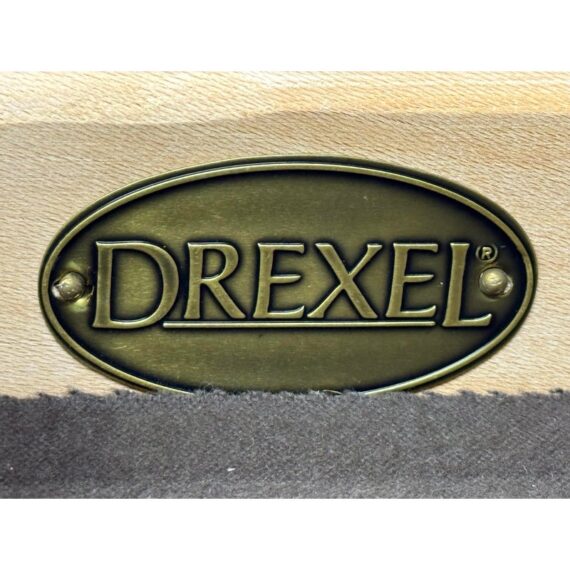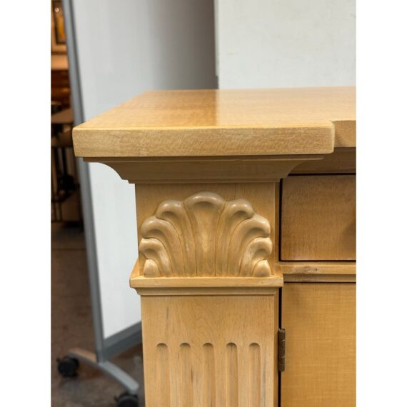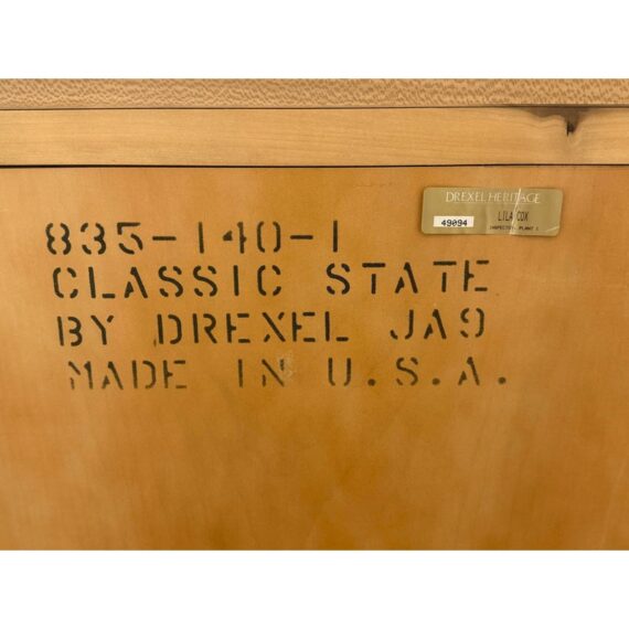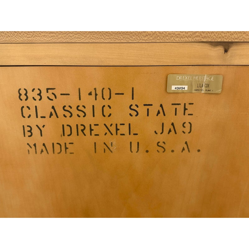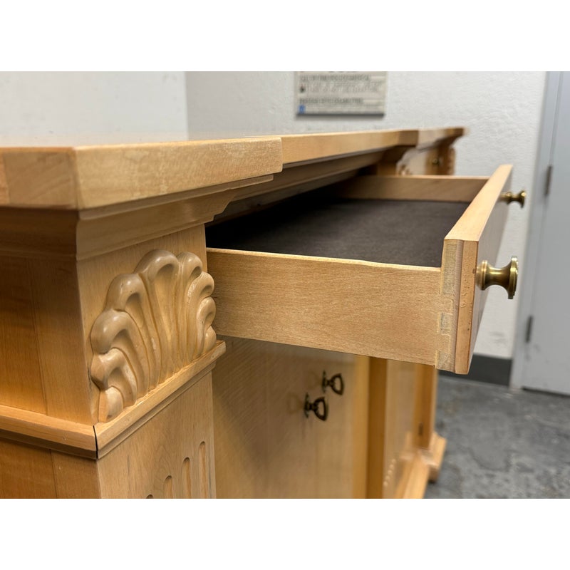 Design Plus Gallery presents a Circa 1990’s Classic State Collection Sideboard from Drexel Heritage. Crafted from solid maple woods. Tall and slender in profile, this elegant piece showcases four paneled doors framed by three column-carved pilasters, each crowned with a carved shell motif—timeless details that highlight Drexel’s traditional American craftsmanship. The top features two narrow drawers for linens and serving pieces, while the original solid antique gold-finish hardware adds a refined, enduring touch. Behind the doors are two separate cabinet compartments. Each cabinet includes two shelves for flexible storage; the lower shelves are concave-cut, accommodating larger platters and oversized serveware with ease. Thoughtfully scaled for dining rooms, entries, or living spaces, this discontinued model blends heirloom quality with practical organization. In good condition, visible areas of distress and minimal wear form usage. Made in USA.