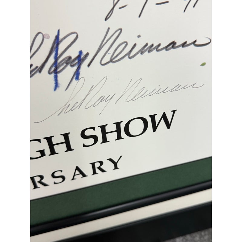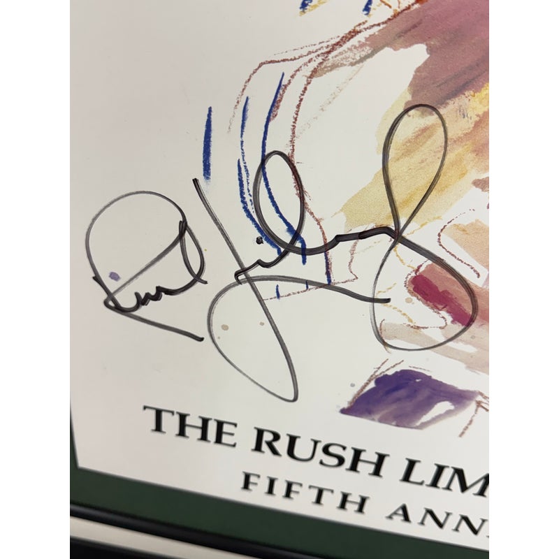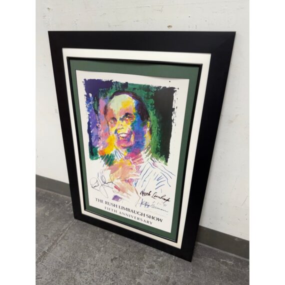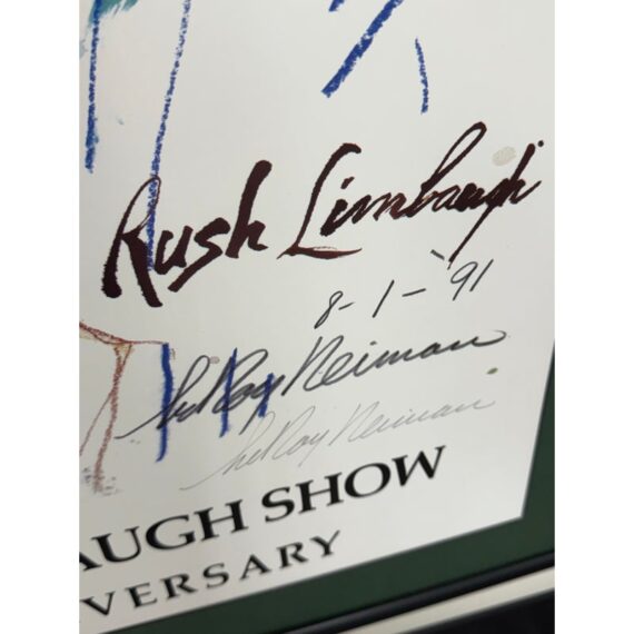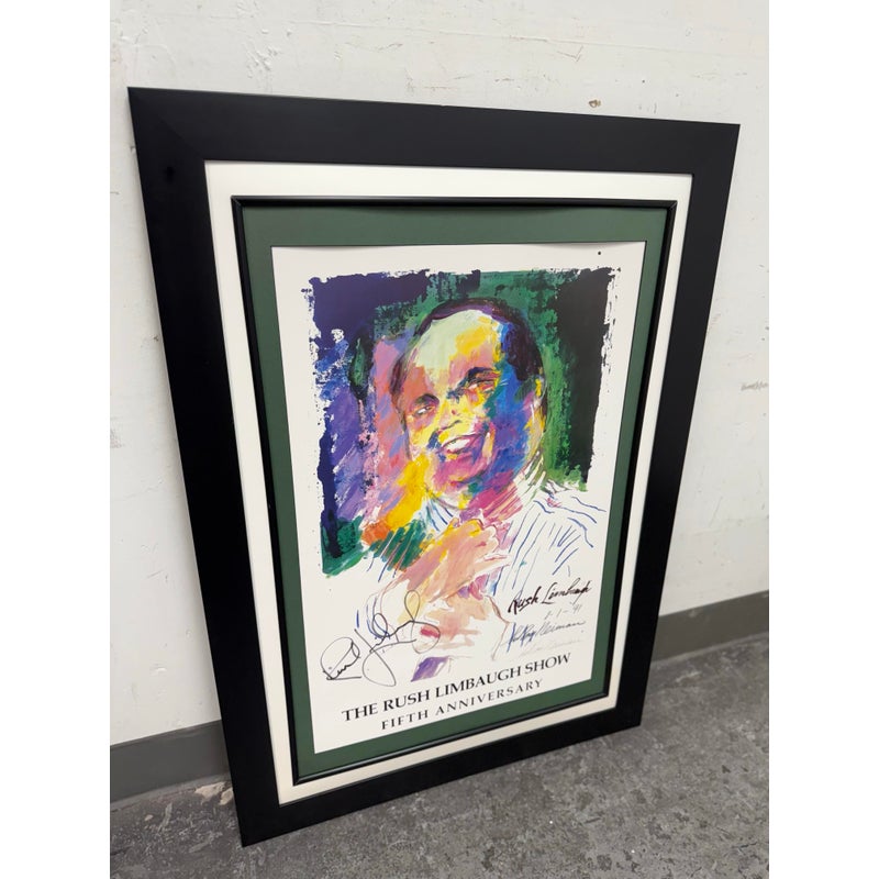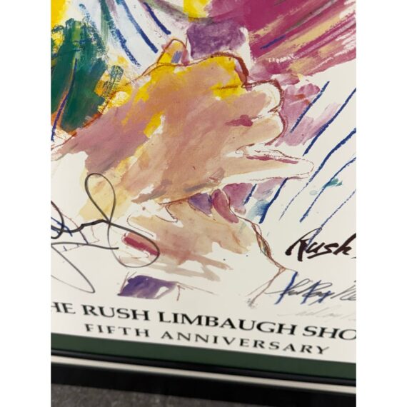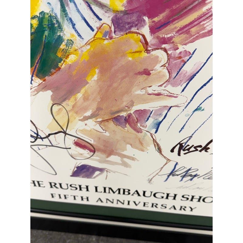 Design Plus Gallery presents a Rare 5th Anniversary Poster for The Rush Limbaugh show by LeRoy Neiman. The poster is signed by the host of the station + the artist, Neiman. The poster was in celebration of the five year mark to the show. The poster in its frame is in good condition with wear to the matte + frame itself, and there is no glass to protect the poster.