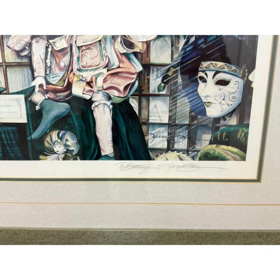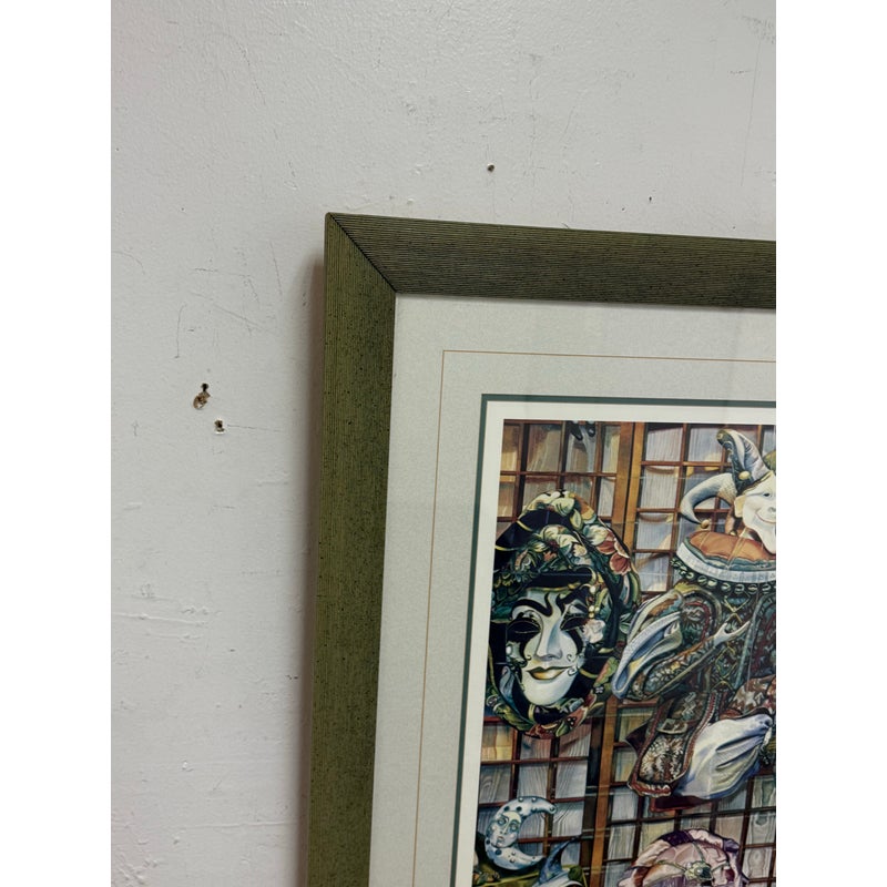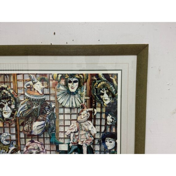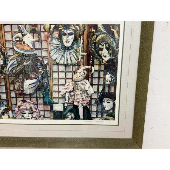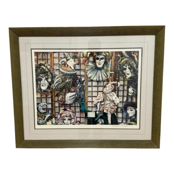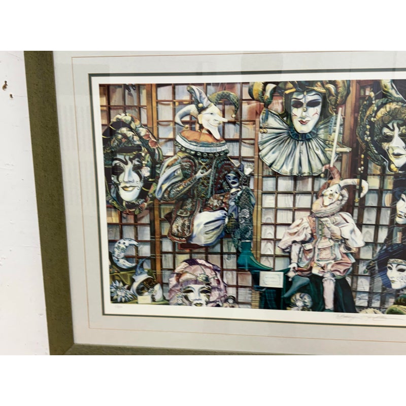 Design Plus Gallery presents Venetian Masks Lithograph by Karen Salee. Custom framed and matted with signature from the artist to a person named Bethany. Edition 2/850. In good condition, minimal wear from usage.