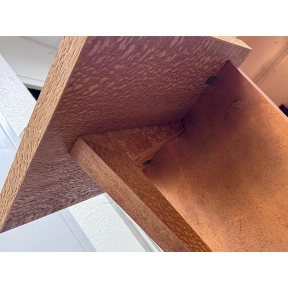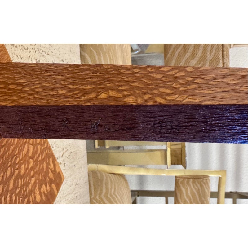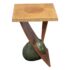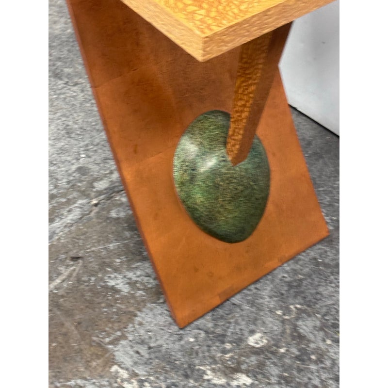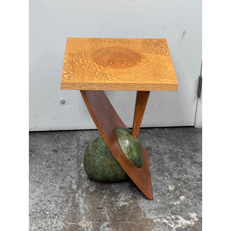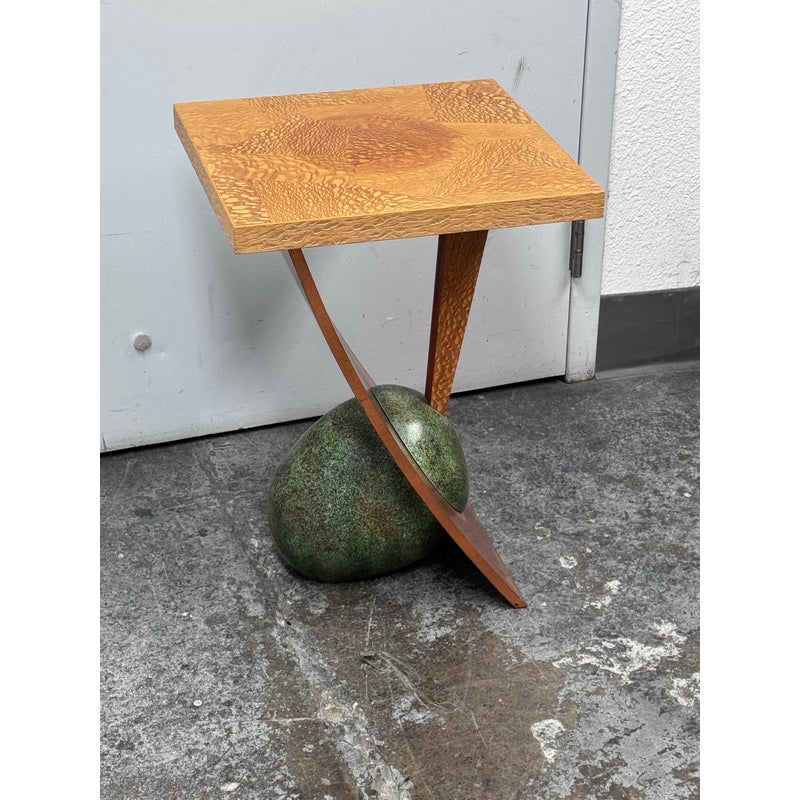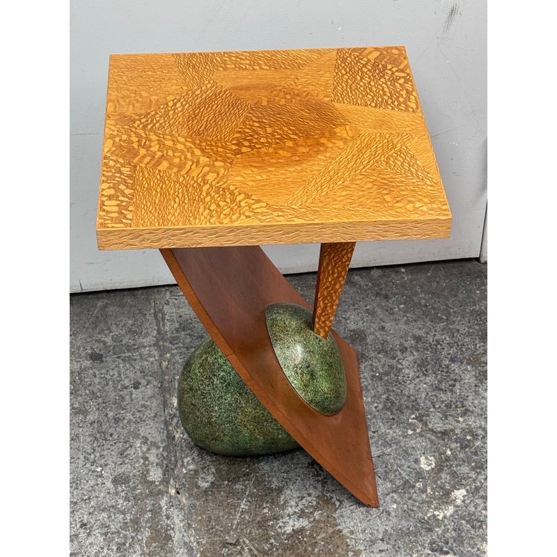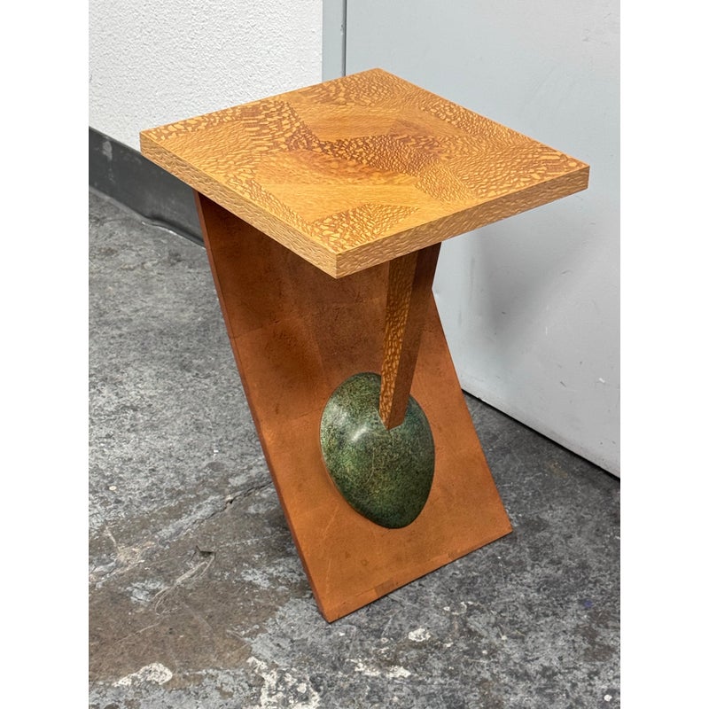 Design Plus Gallery presents a Circa 1992 Side Table with a Post Modern Style. The side table is funky with a sophisticated twist that remarkably commands attention. The surface and its connecting base are two tones of wood with the surface being slightly lighter than the connecting wood pieces, aka legs. These pieces join each other in asymmetry and there is a green egg shape faux stone piece anchoring the table to the ground. The table has a signature with year of make on the base. It shows some patina to the wood but overall it is in good condition for its overall age + use.