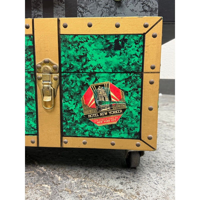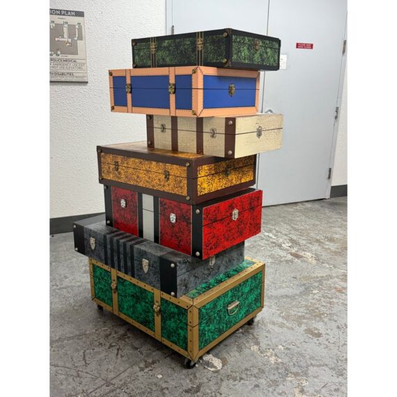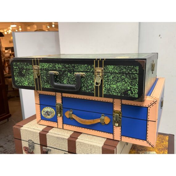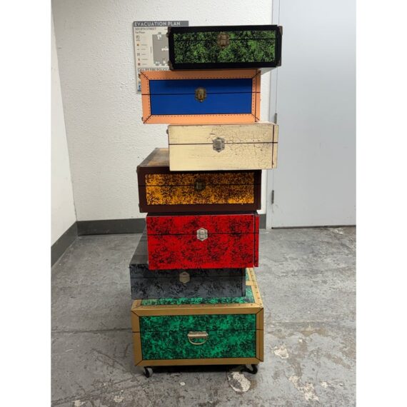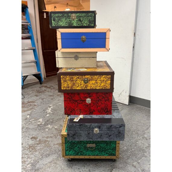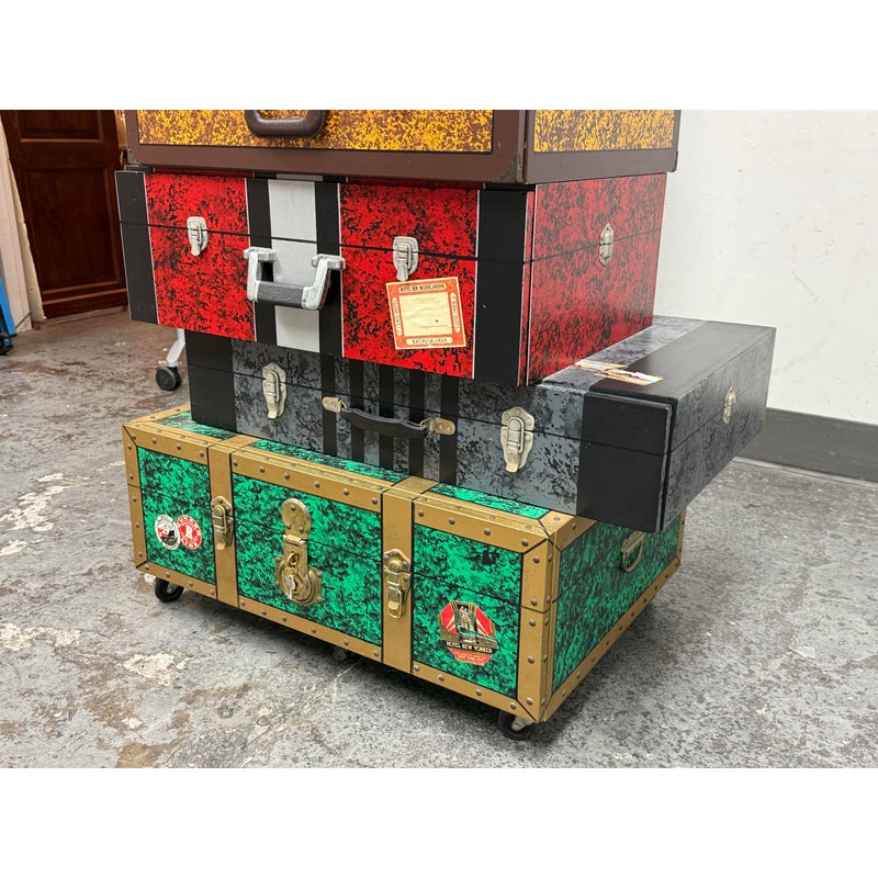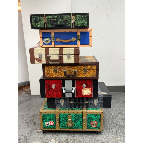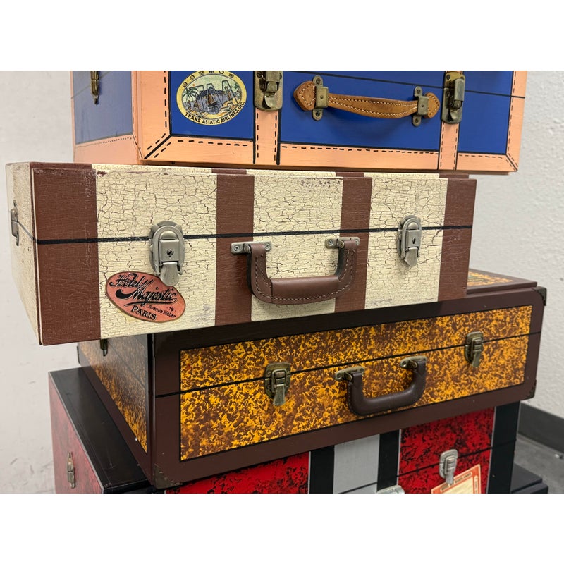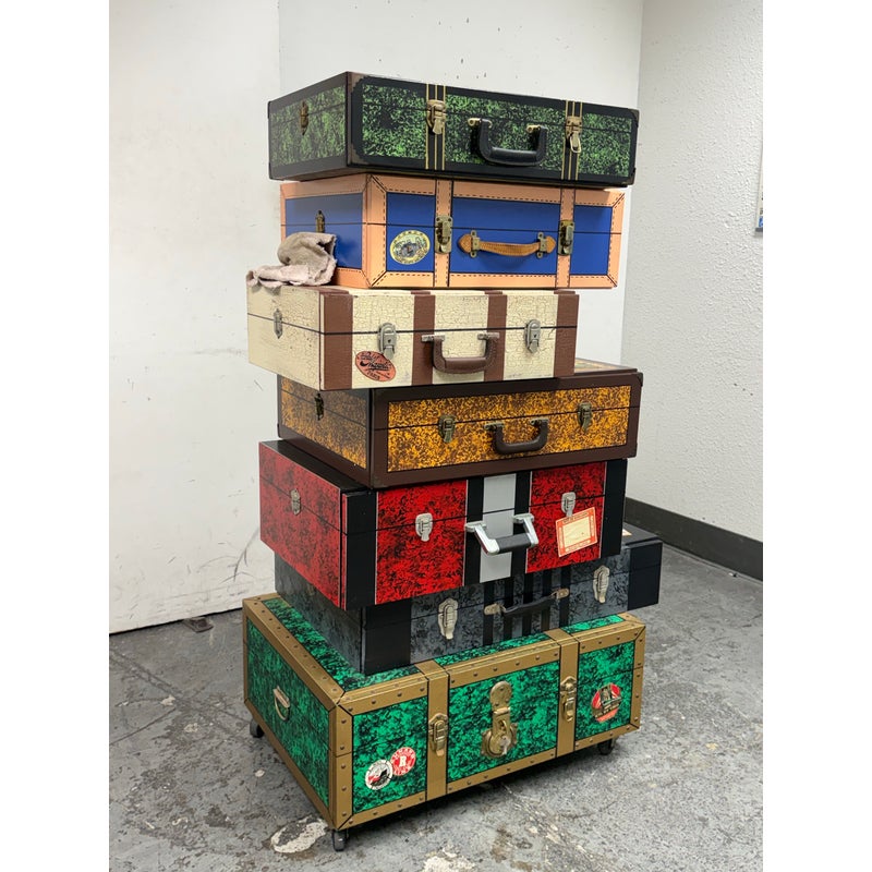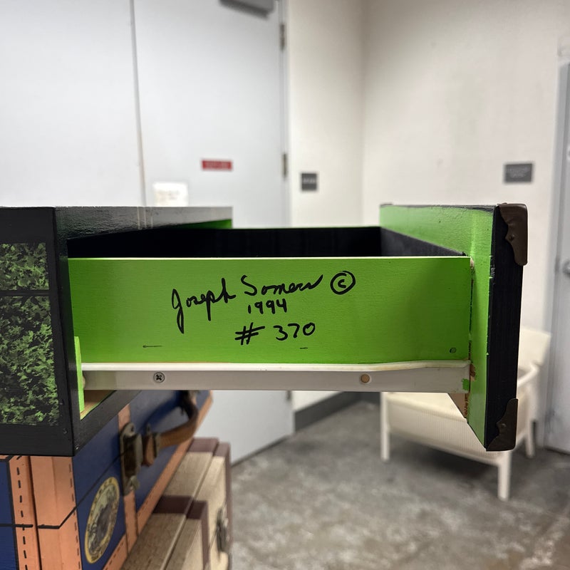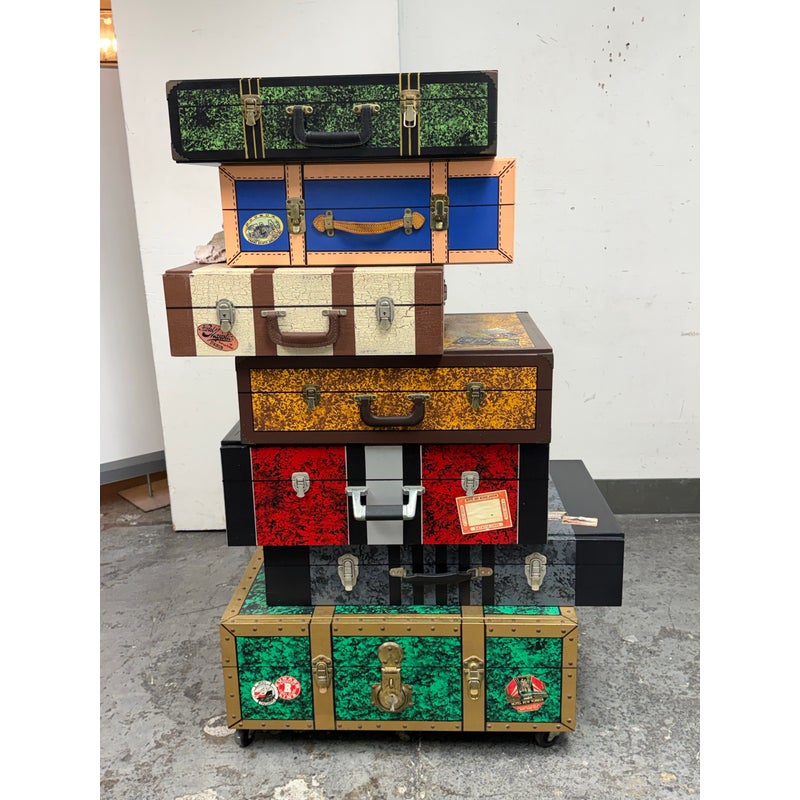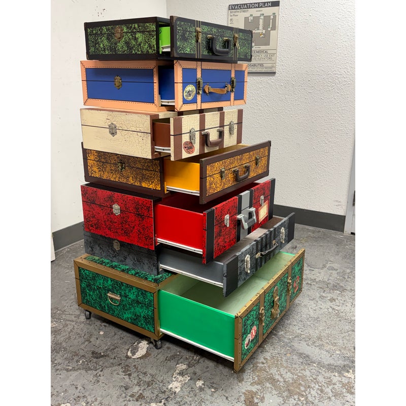 Design Plus Gallery presents the Luggature Chest of Drawers Signed by Joseph Somers in 1994. A true whimsical relic to add to your funky home or lodge for traveling guests. There are seven diffferent drawers that all look like by gone era luggage, complete with travel stamps. The chest is drawers is fun, well made and always going to be a functioning art piece to garner admiration from. It is in good condition with visible and minimal wear that is consistent with usage.