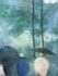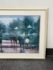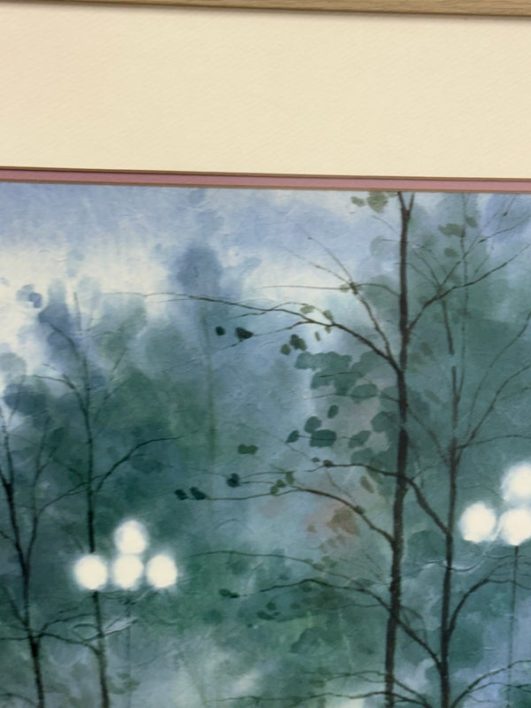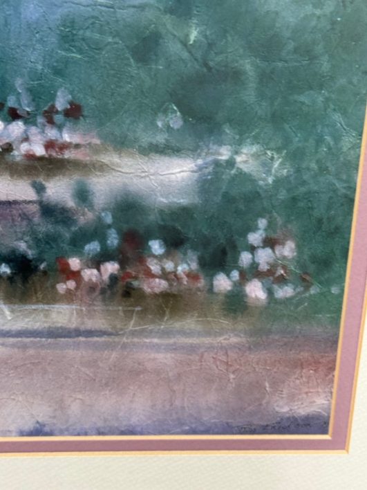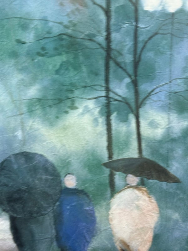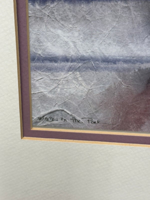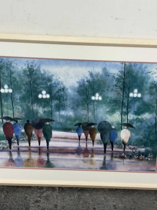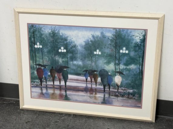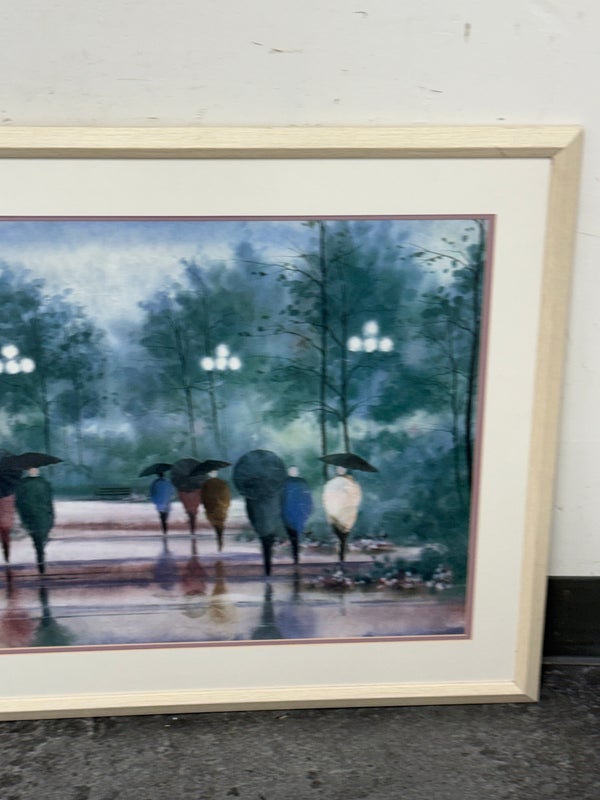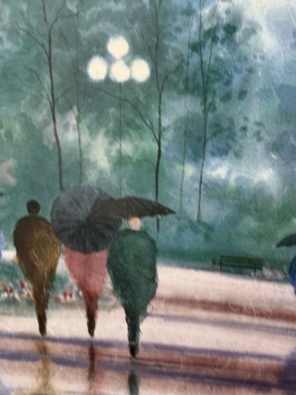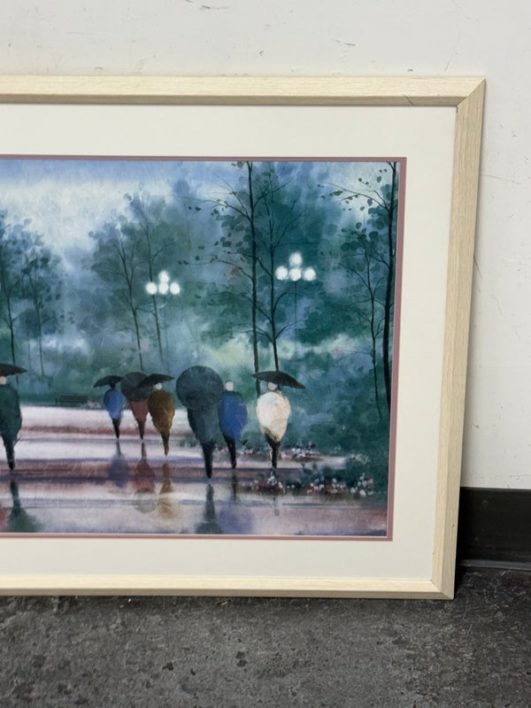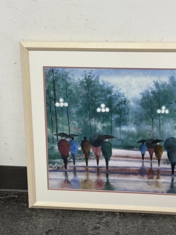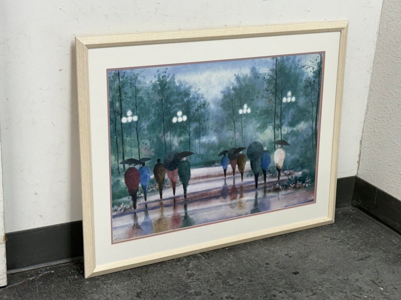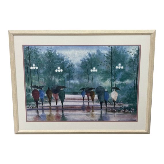 Design Plus Gallery presents “A Walk in the Park” Print by Russ Erickson, 1995. A delightful achievement of foliage while out on a rainy stroll through a park. The teal green background has light blue + white as well. Figures walking on a paved walk with their umbrellas and shape reflecting off the walkway brings a sense of calm and peace to the viewer. You can almost feel yourself in their conversation. Is in good condition for its usage. Signature is on lower right with the title on lower left.