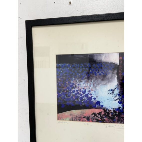 Design Plus Gallery presents “Autumn”, Signed Artist Proof by David Z. Wang. A lithograph captures an expressive abstract landscape through layered color and texture. This composition blends gestural movement with rhythmic patterning, creating a sense of depth and atmosphere that shifts across the surface. Rendered in a palette of blues, charcoal tones, and muted earth hues, the artwork reflects Wang’s contemporary approach to abstraction during the mid-1990s. The piece is marked as an artist proof and hand signed by the artist, adding to its significance. It is professionally matted and housed in a black frame, ready for wall display. In good condition, visible and minimal wear from usage.