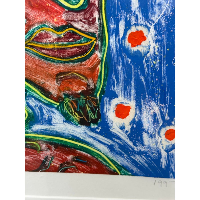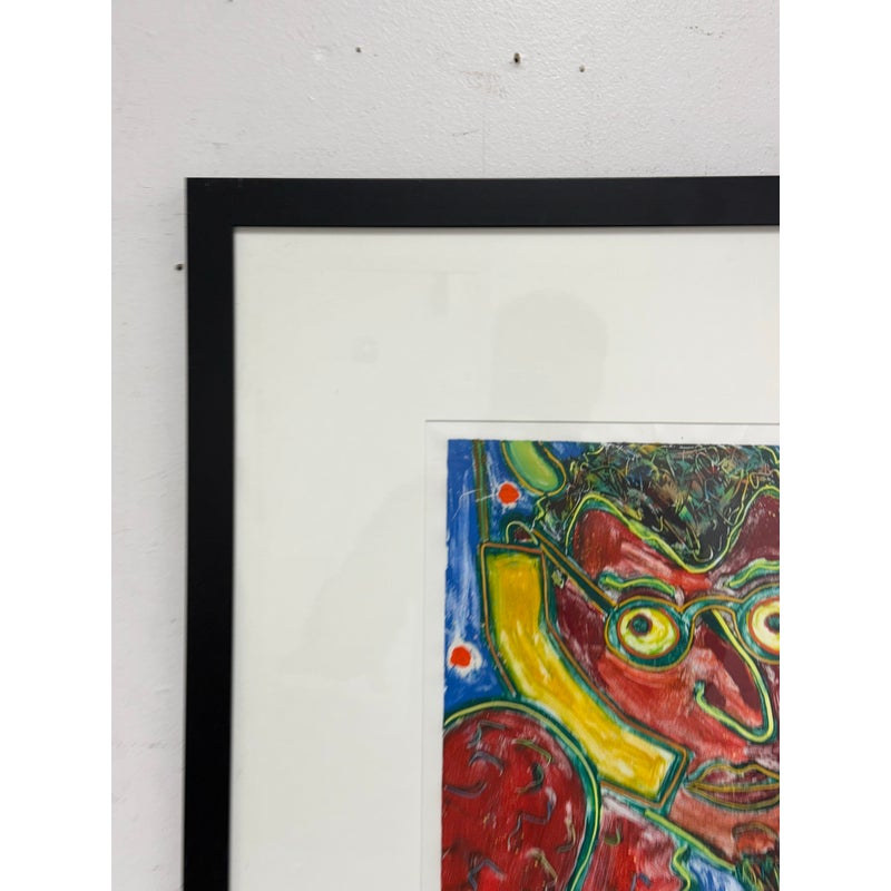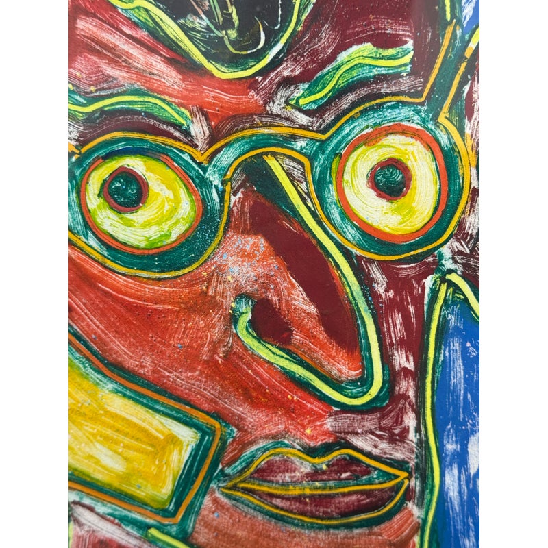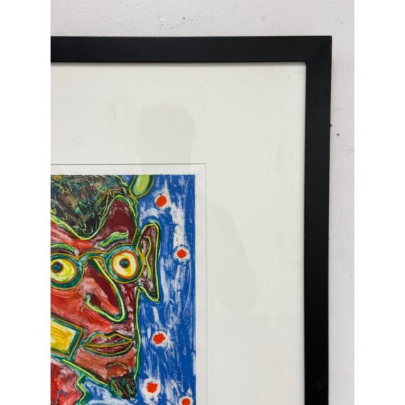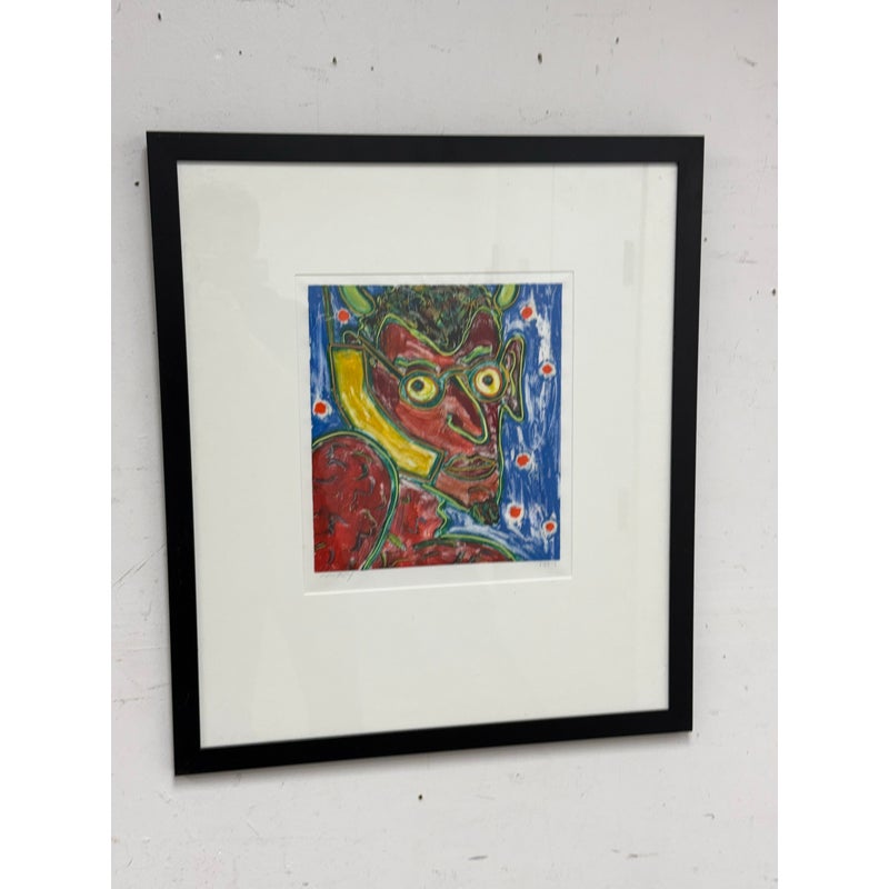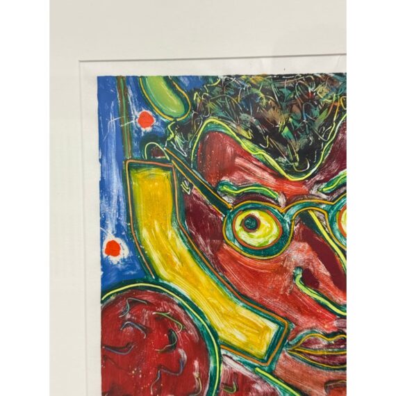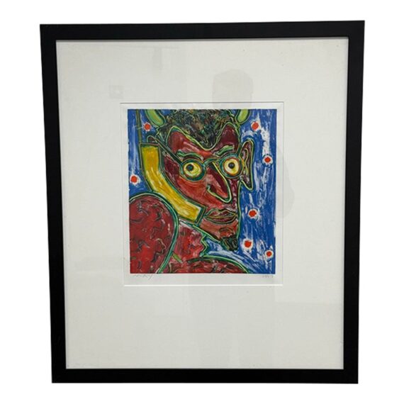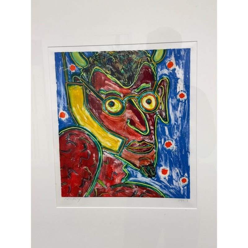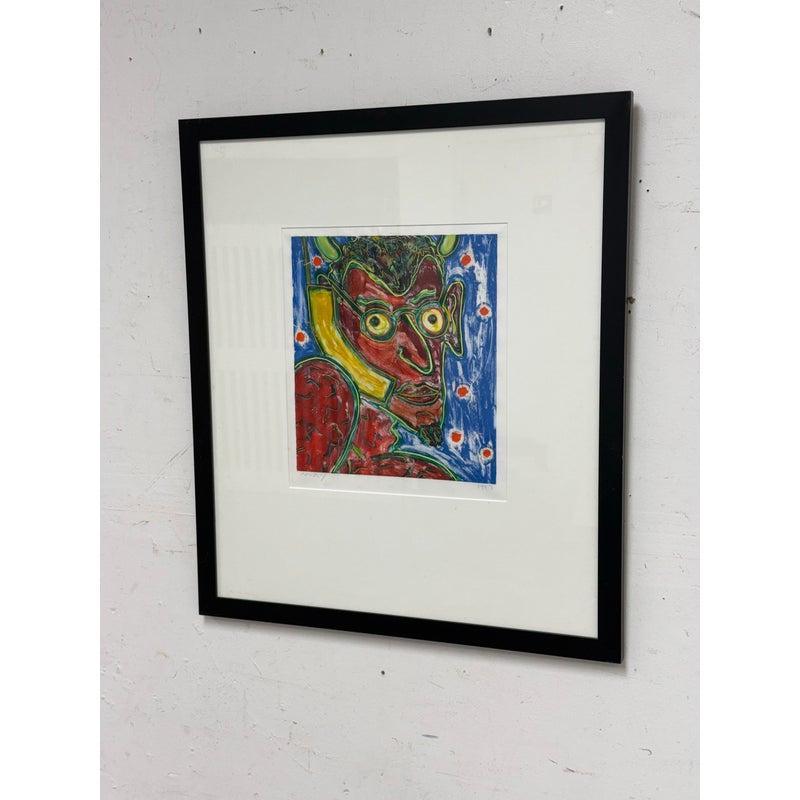 Design Plus Gallery presents “The Devil” an Original Screen Print by Artist Dan May, Dated 1997. The red faced deacon of demons appears to be taking a call with a yellow phone to his ear. Striking primary colors encapsulate this art piece. Is in good condition for its usage.