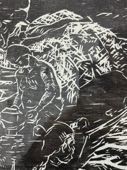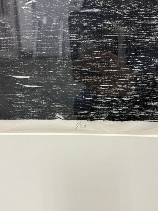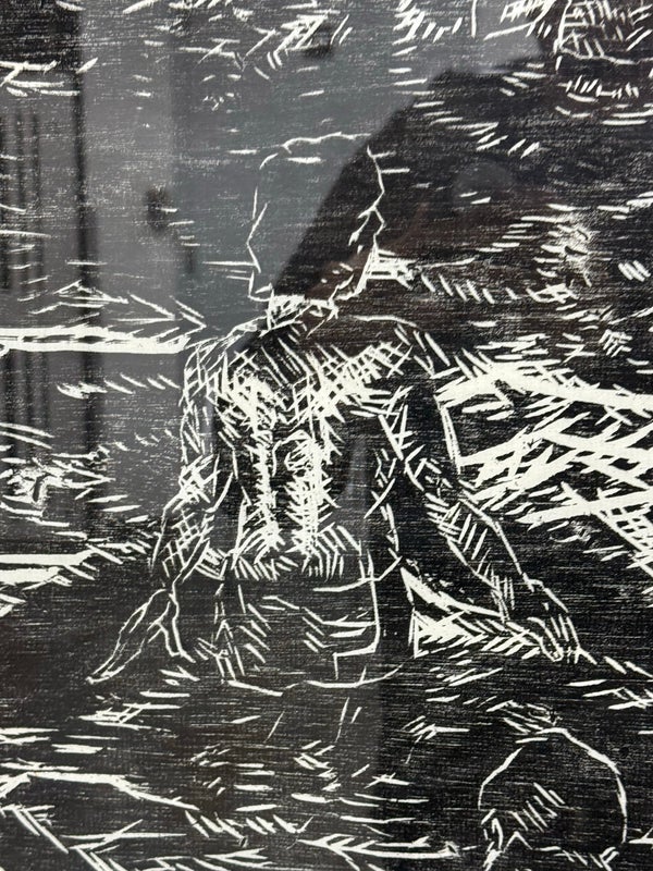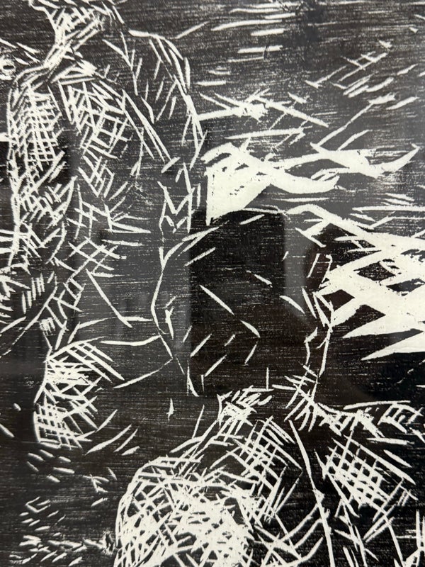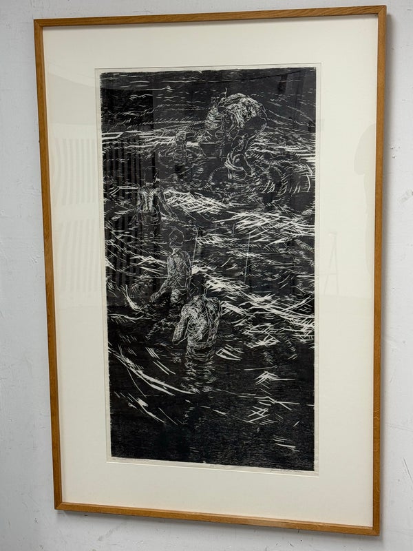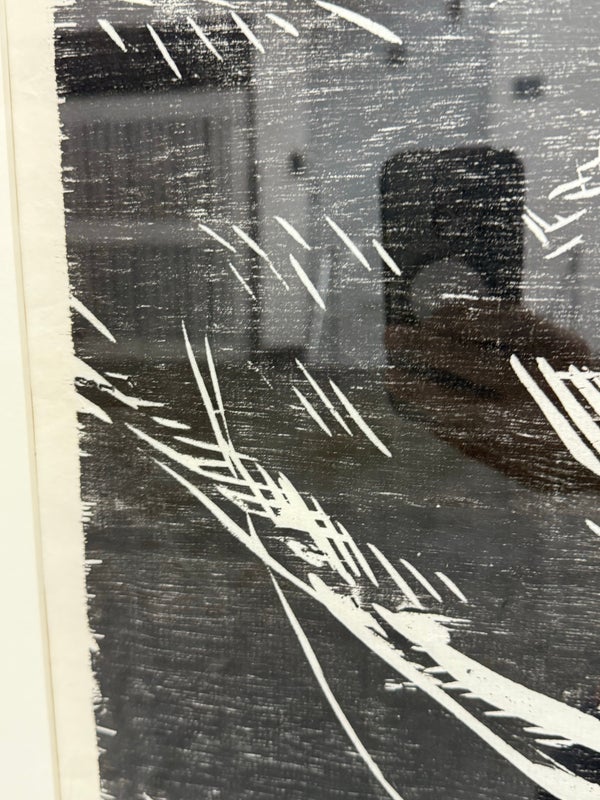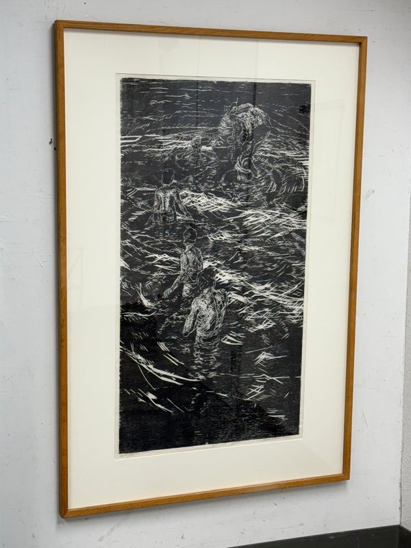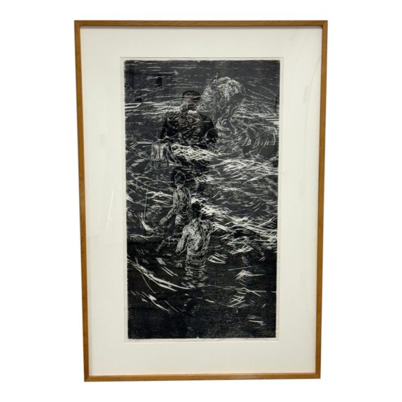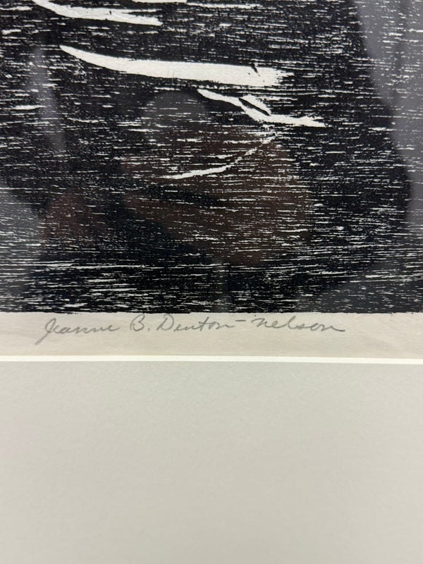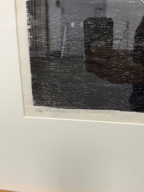 Design Plus Gallery presents a Framed Original Woodcut by Jeanne B. Denton-Nelson. Number 1 in edition of 20, Created 1998. Purchased in Lahaina Maui Gallery in 1998. Hand-printed on Kozo Galen handmade paper. Na Lawaia “the fishermen” from a series depicting contemporary Hawaiian life. In good condition, minimal wear. Made in Hawaii, USA.