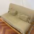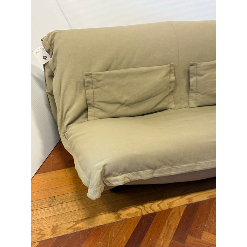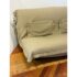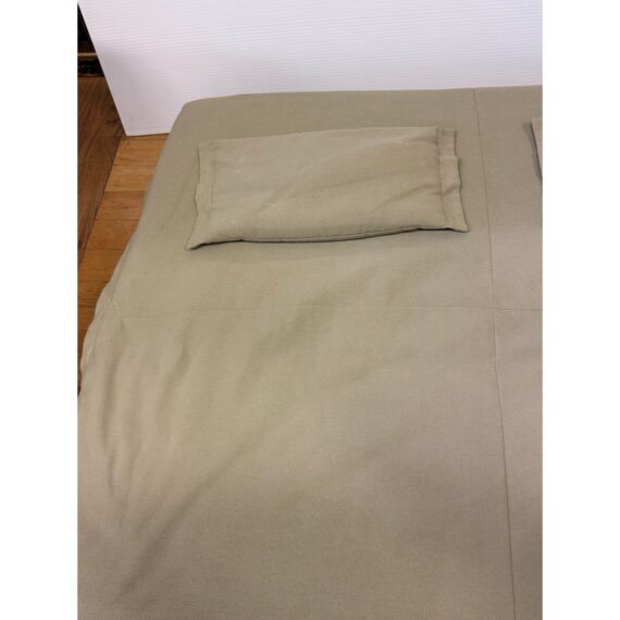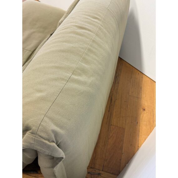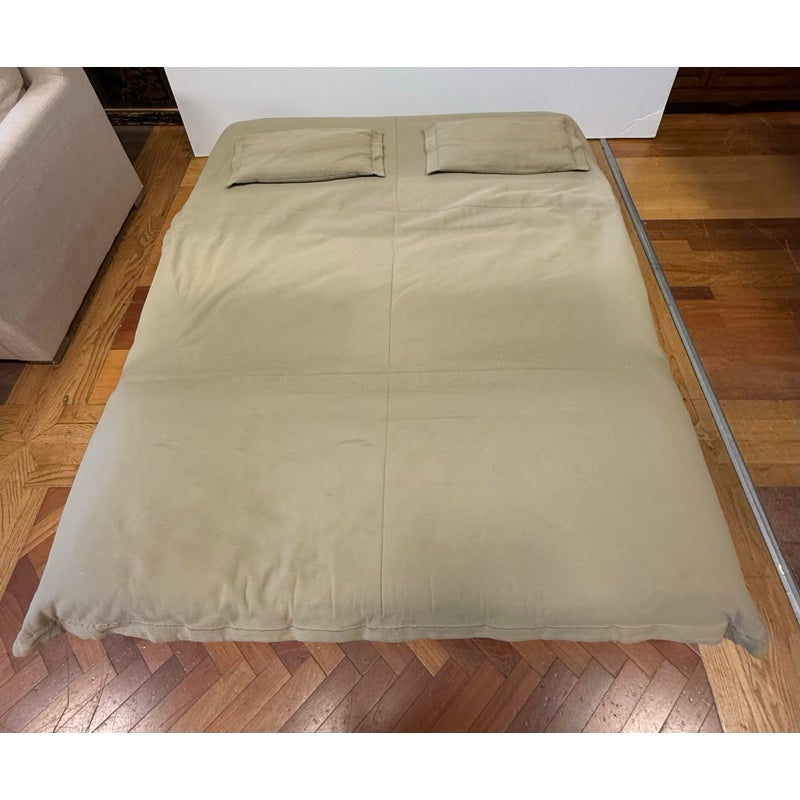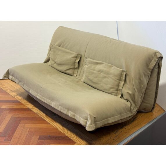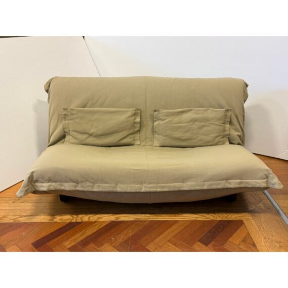 Design Plus Gallery presents the Calin Queen Sleeper Sofa from Ligne Roset. This convertible design has a low profile, arm less silhouette with a sand-toned textile. The generously padded seat and back create a relaxed contour, and two matching lumbar cushions are included for added support. The sofa converts smoothly into a flat sleeping surface, and the discreet base keeps the look streamlined from every angle. This is a discontinued model with the brand and is in good condition with visible sun damage. and minimal wear from usage. Made in France.
