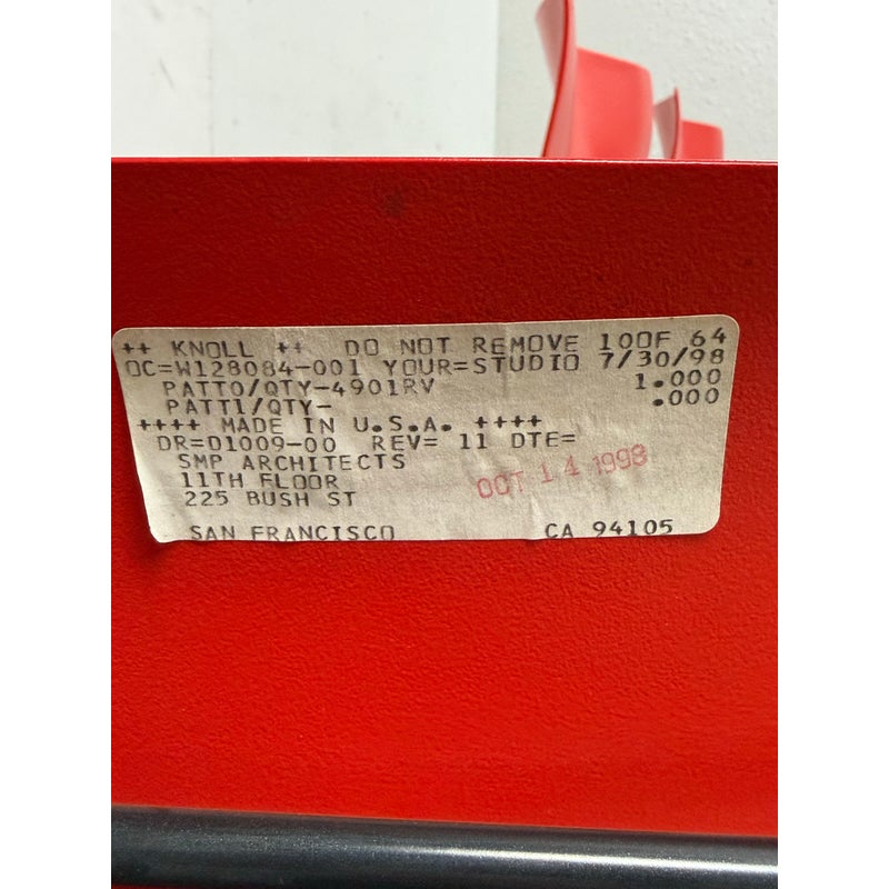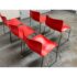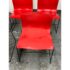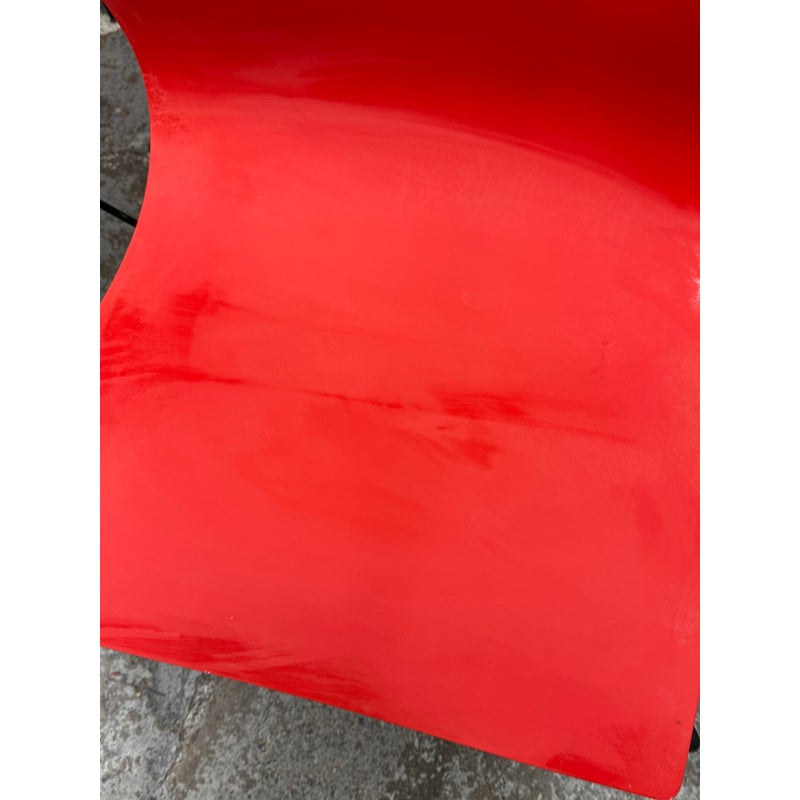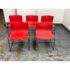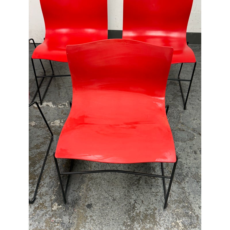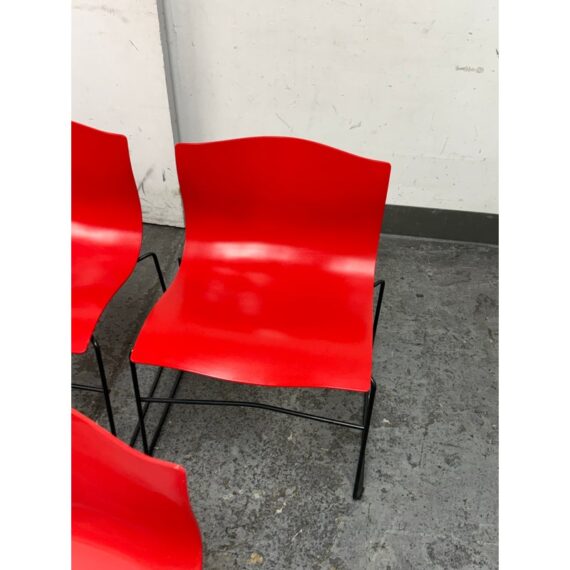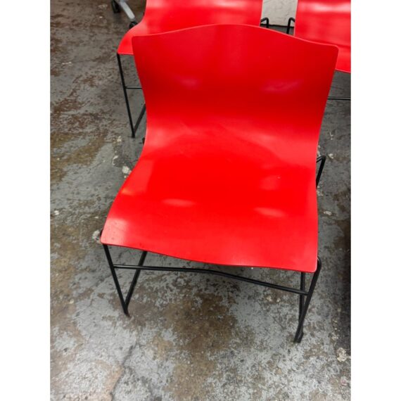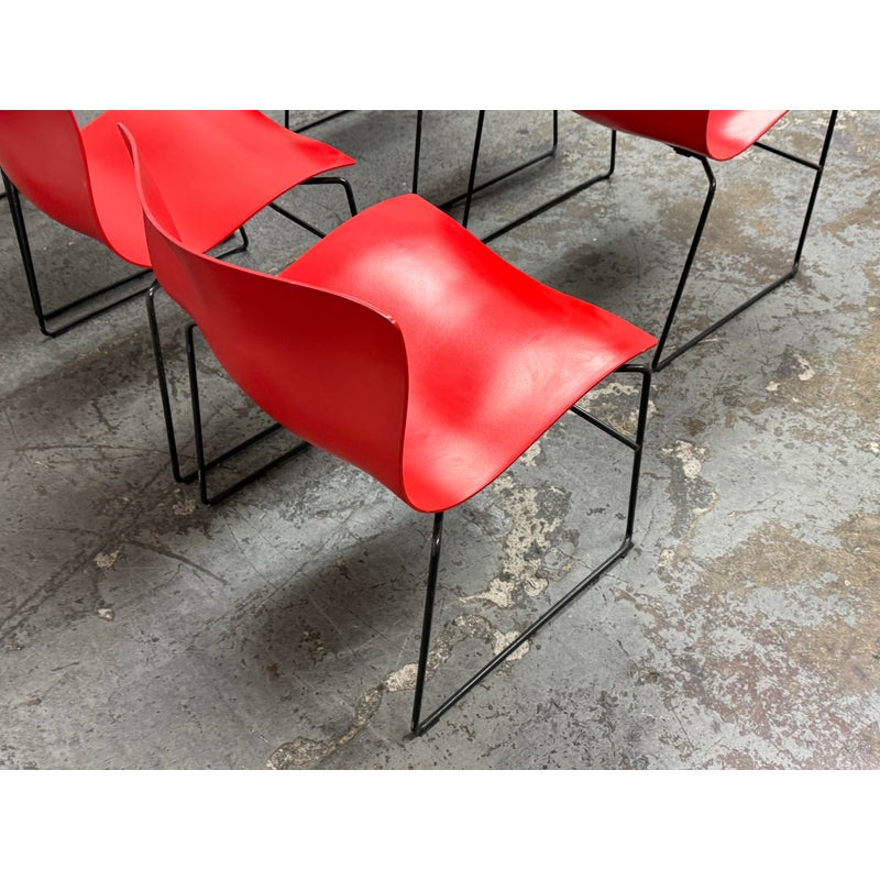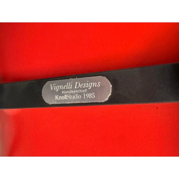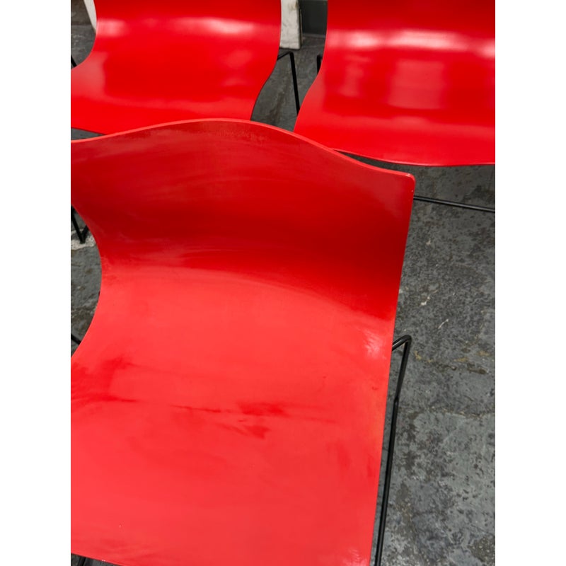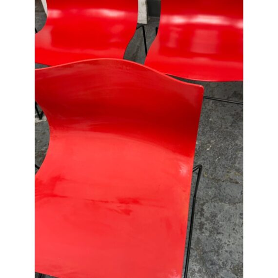 Design Plus Gallery presents a Circa 1998 Set of Five Red Handerkerchief Chairs from Knoll International for Massimo Vignelli. Originally designed in 1985. The chairs were designed by Vignelli in 1985 and there is a brand plate with authenticity on each chair. They are made of a red compression molded fiberglass seat + back plus black steel wire sled legs. The chairs are stylish with durable materials, allowing them to be in good use for many more decades to come. Have fun with color and amp up your bistro, dining area, or just for extra seating as these chairs are stackable. The use of materials would also allow for outdoor dining which would impose conditions sooner rather than later. One chair’s glossy finish has been removed. Made in the USA.
