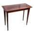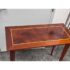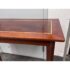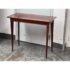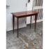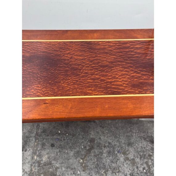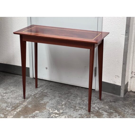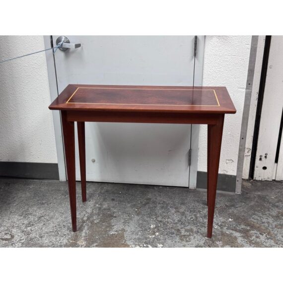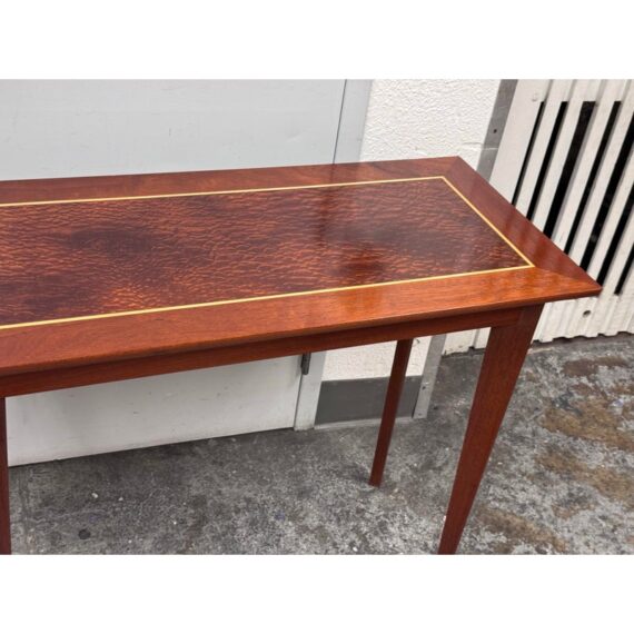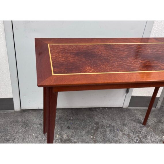 Design Plus Gallery presents a Custom Console Table from Trumblewood. This rectangular console balances warmth and refinement. Its clean-lined frame is finished in rich mahogany and set on four gracefully tapered legs for a light, elevated stance. The top showcases a maple rectangular inlay bordered outlining a Birds Eye veneer. The interplay of straight-grain and the delicate, pebbled pattern of Birds Eye adds depth and quiet detail, making this piece a sophisticated anchor for an entryway, hallway, or behind a sofa. In good condition, visible and minimal wear from usage. Made in USA.