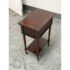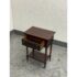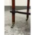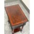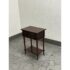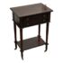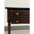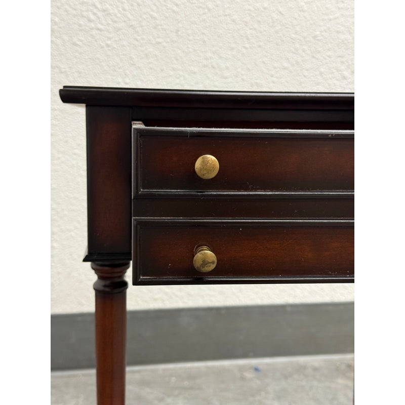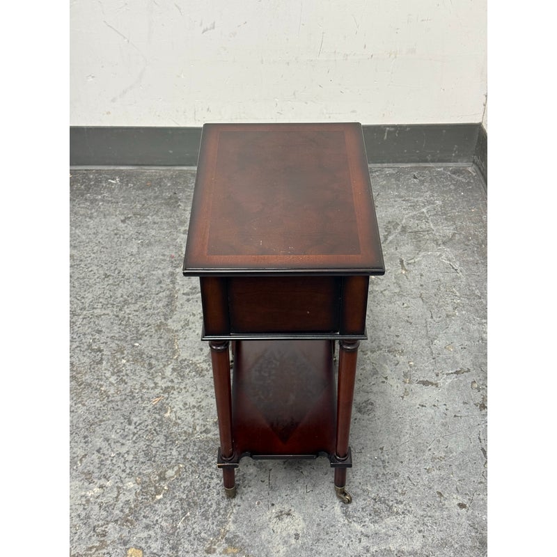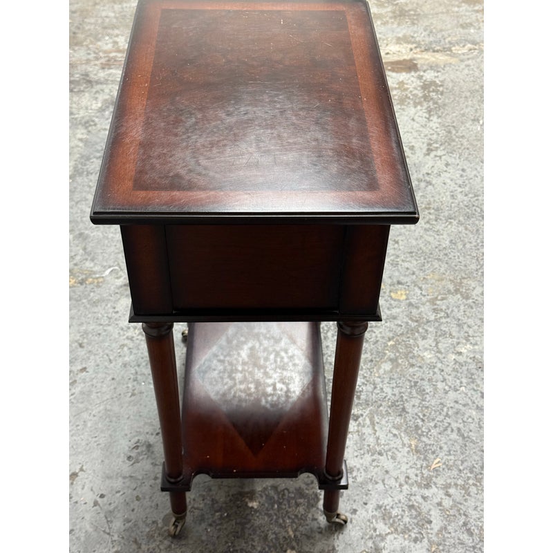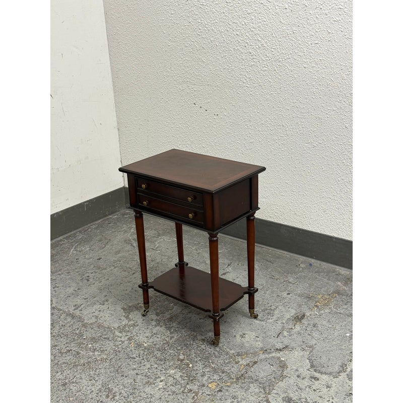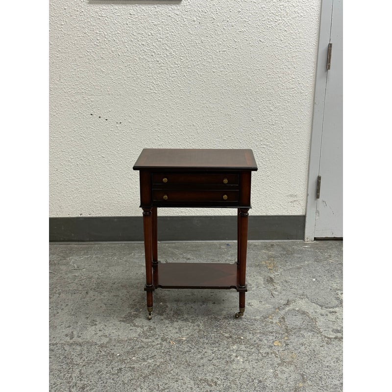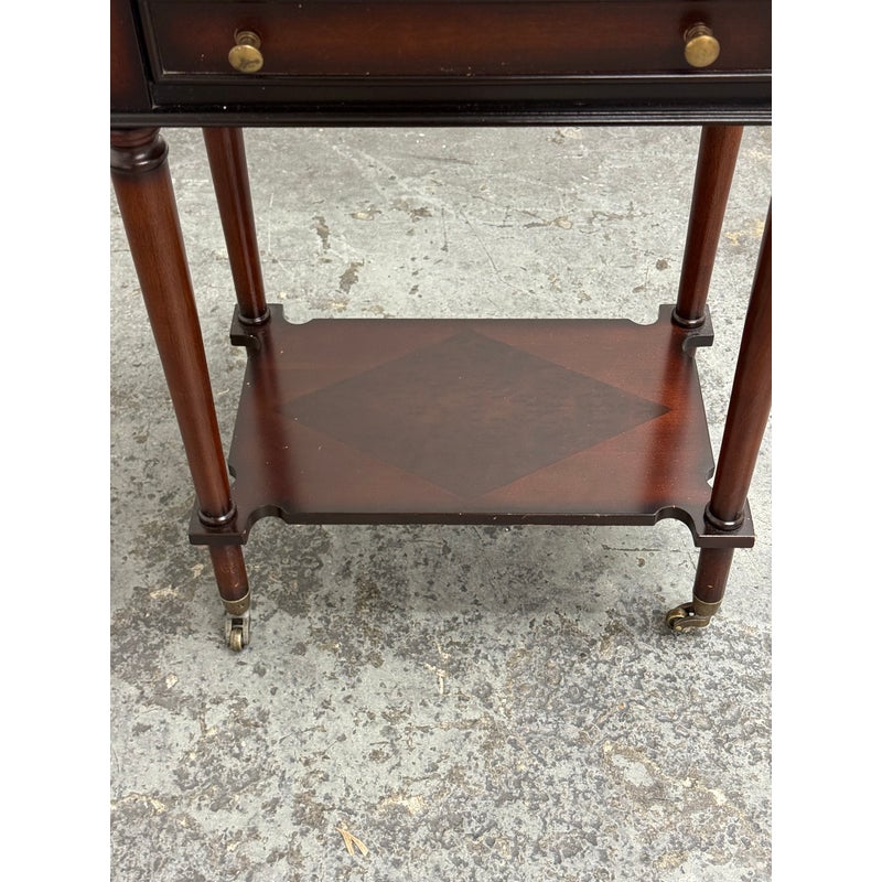Design Plus Gallery presents a Two Drawer Occasional Table on Casters from Bombay Company. This compact wood table has a rectangular top with an inlaid border and a patterned center panel. A single drawers sit beneath the top and are fitted with round brass pulls. Four turned legs are joined by a shaped lower shelf, and brass casters complete the base. This is a discontinued model with the brand and is in good condition with visible and minimal wear from usage. Made in Taiwan.