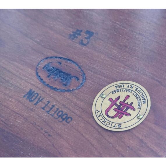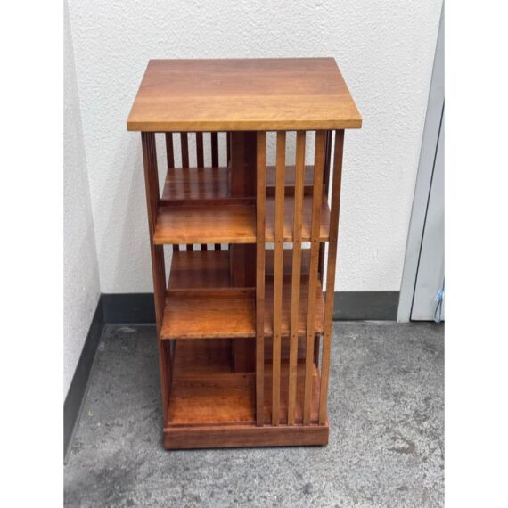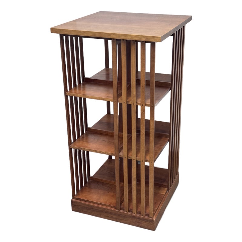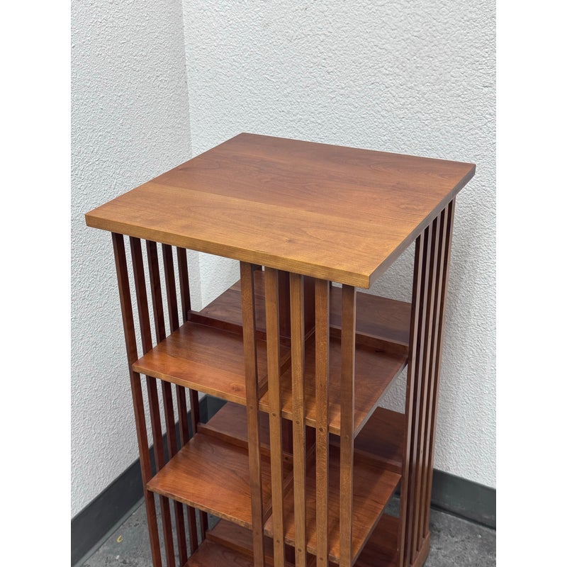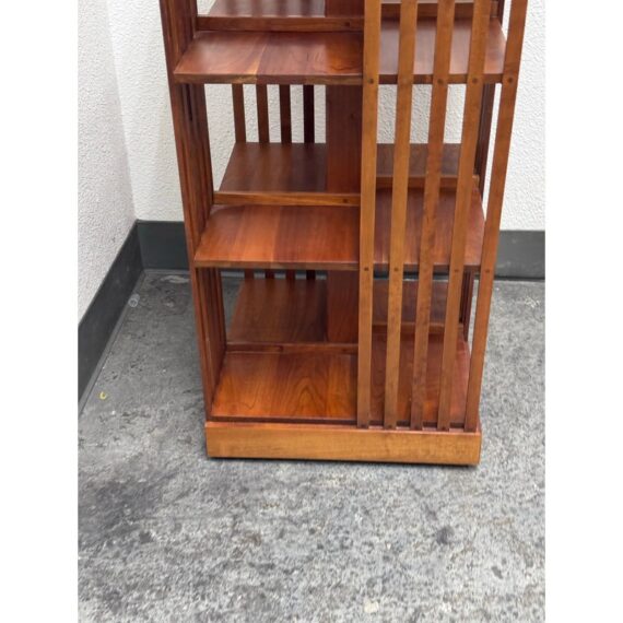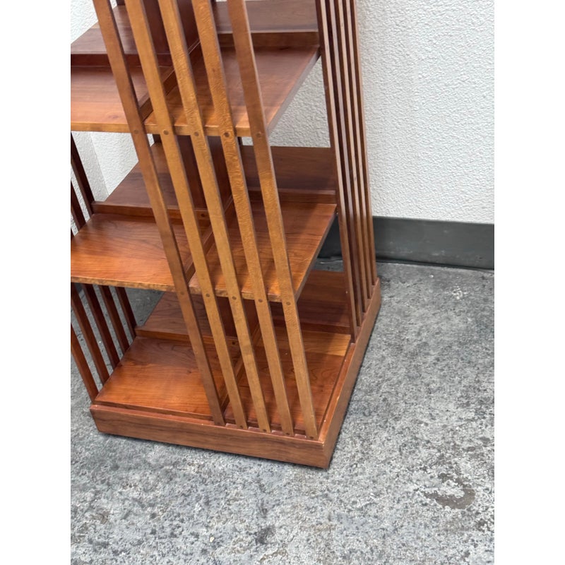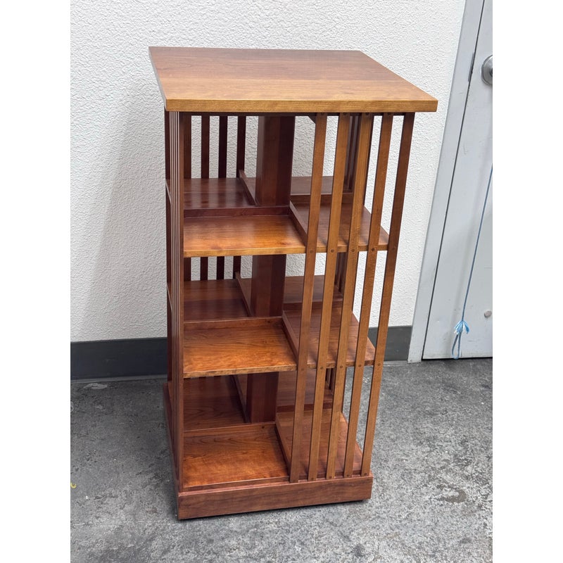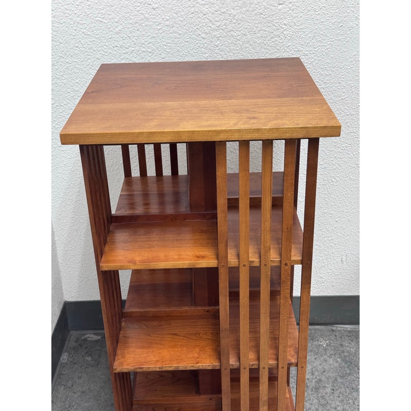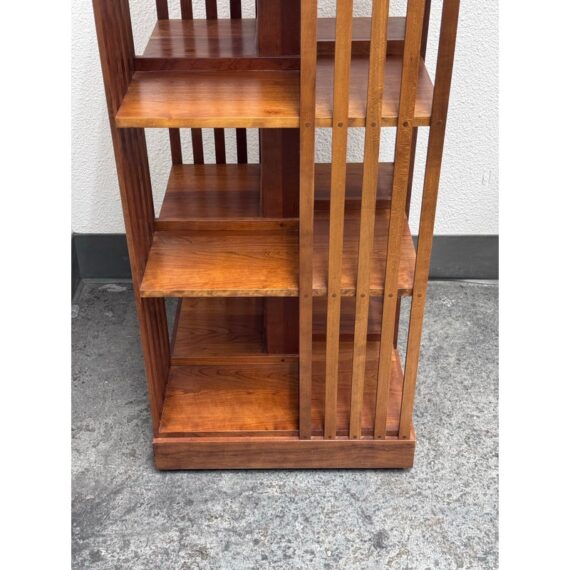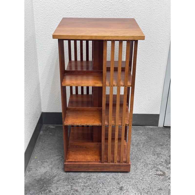 Design Plus Gallery presents a Rotating Bookcase from the Mission Collection from Stickley. The timeless Arts & Crafts style oak wood bookcase sits on a revolving base to allow you spinning access to all your favorite books at a simple turn. Crafted by renowned Stickley brand in the 1990s, this heirloom-quality piece gives you multiple placements for sorting and storing. The base of the case has the brands sticker with stamps giving you their finish number and date of production, year 1999. It shows sun fade with surface wear but overall in good condition for its usage.