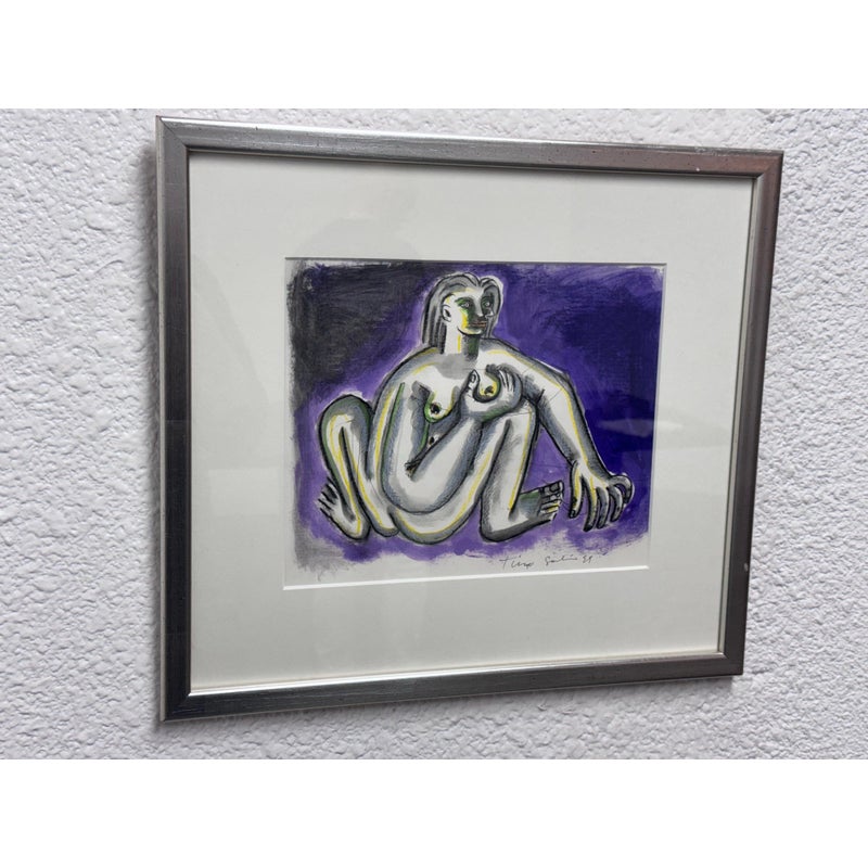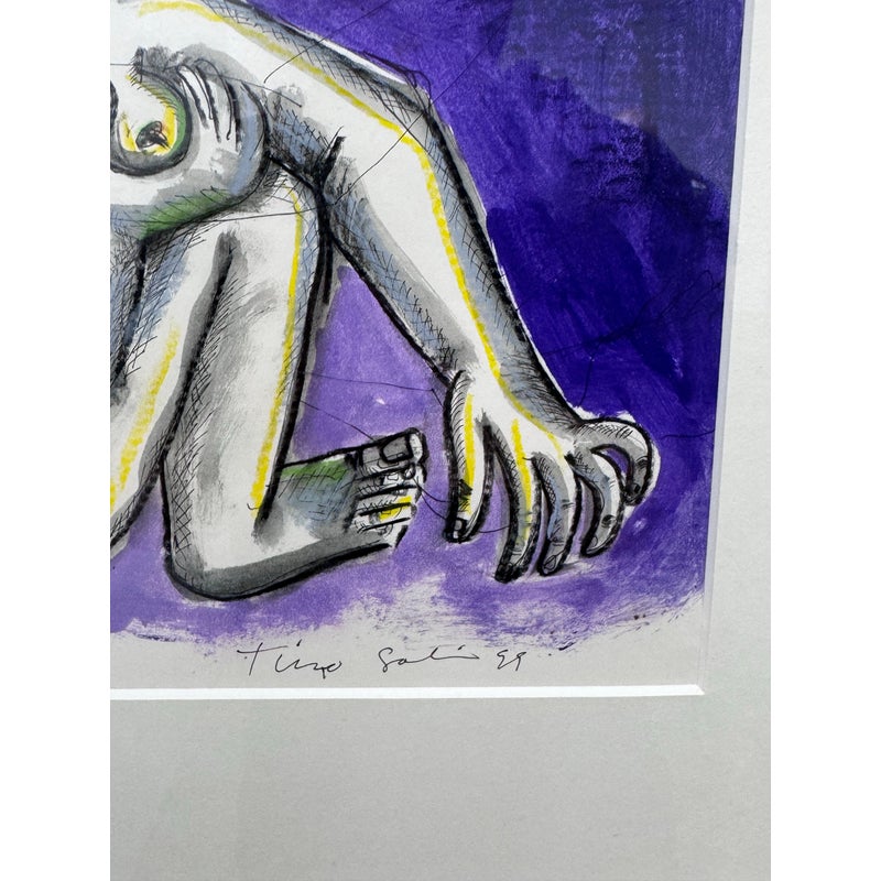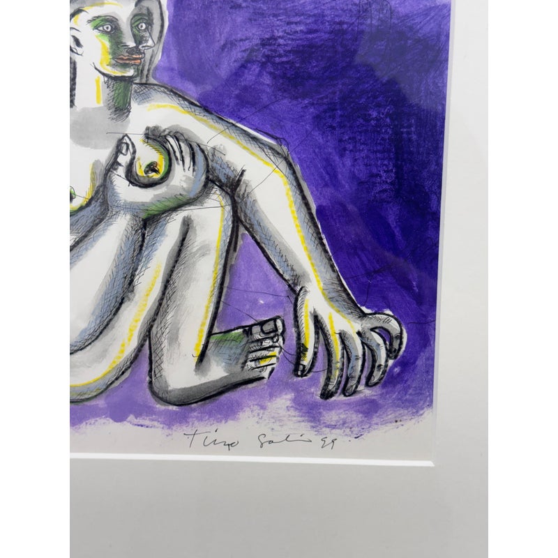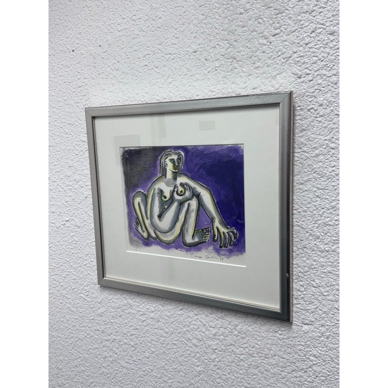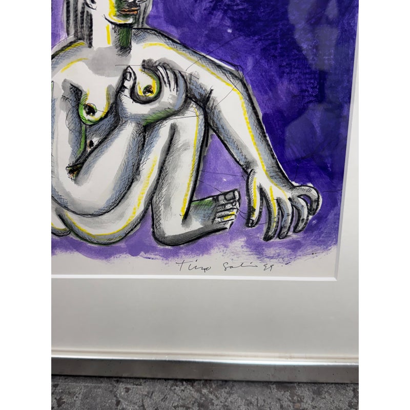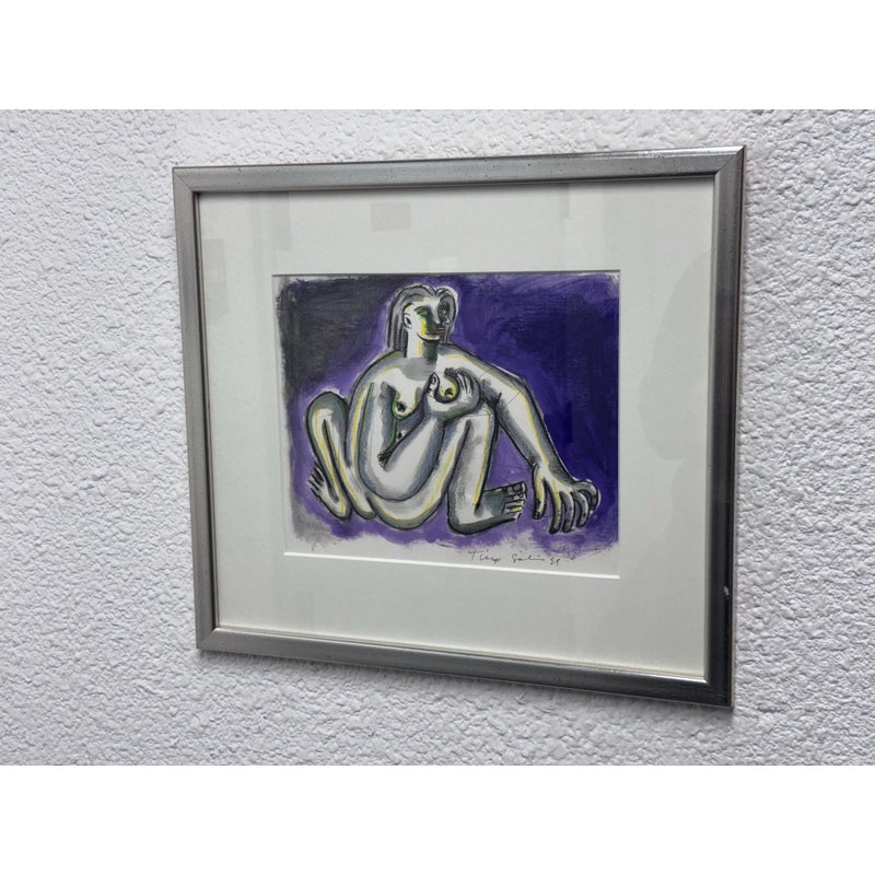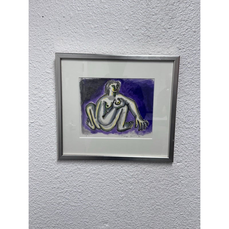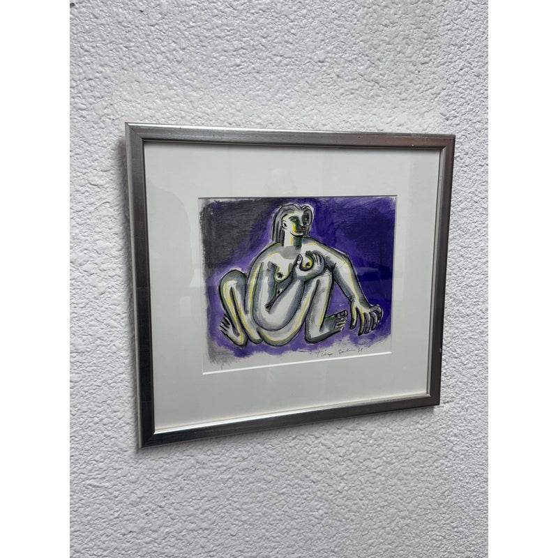Design Plus Gallery presents a Circa 1999 Framed Ink Wash/ Water Color by Timo Solin. The artwork depicts a seated nude figure against a dark purple and gray background. The figure is outlined with bold, contrasting lines, primarily in shades of gray, white, and yellow, emphasizing the form and contours. The signature “Timo Solin -99” is visible in the lower right corner of the artwork, confirming its authorship and date. The piece is framed in a simple, silver-colored frame, which provides a clean border and enhances the presentation of the artwork. The style is reminiscent of expressionism, with its focus on bold lines and simplified forms to convey emotion and movement. In good condition, minimal wear.
