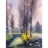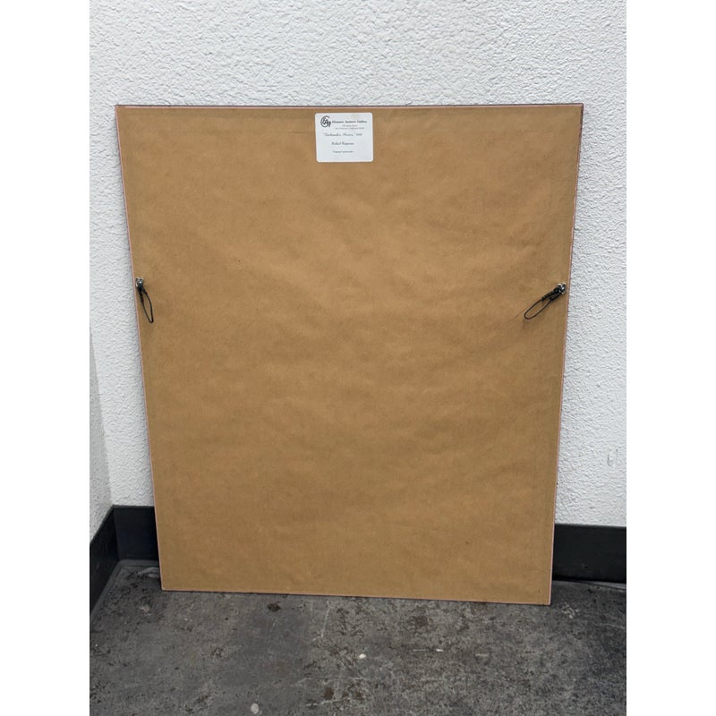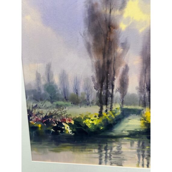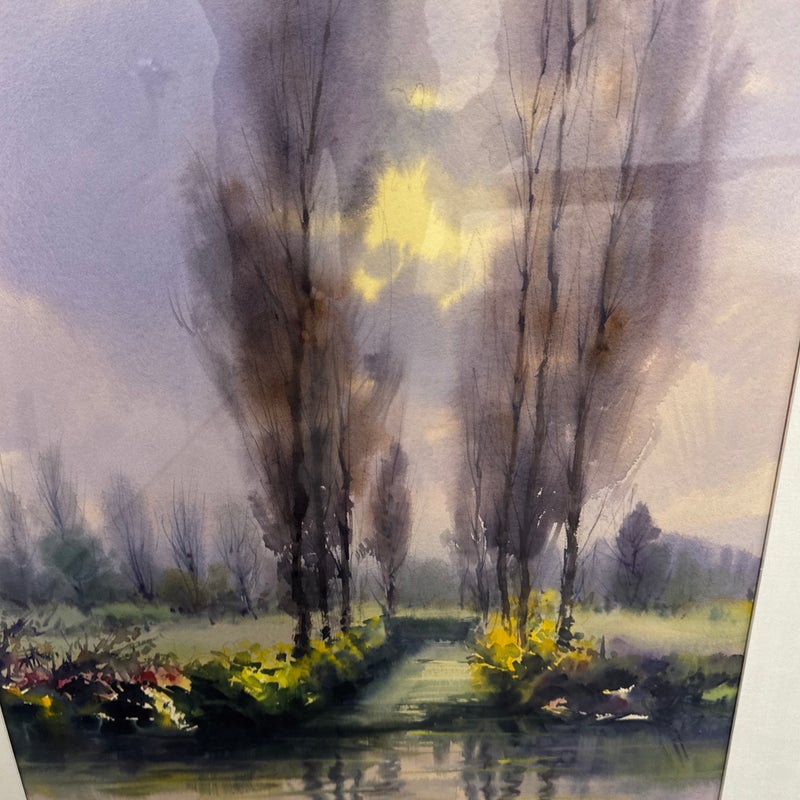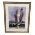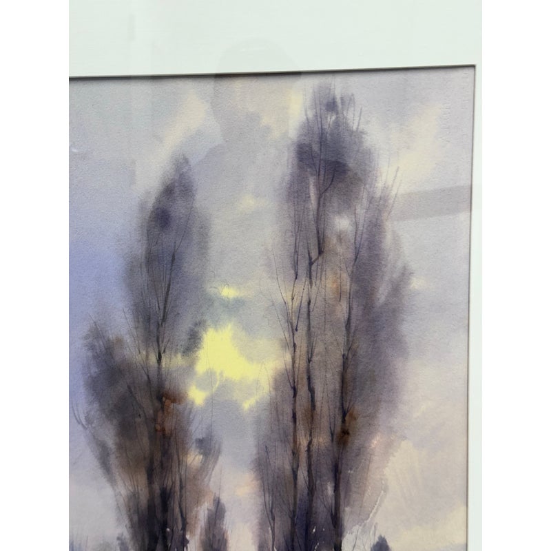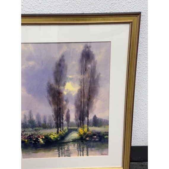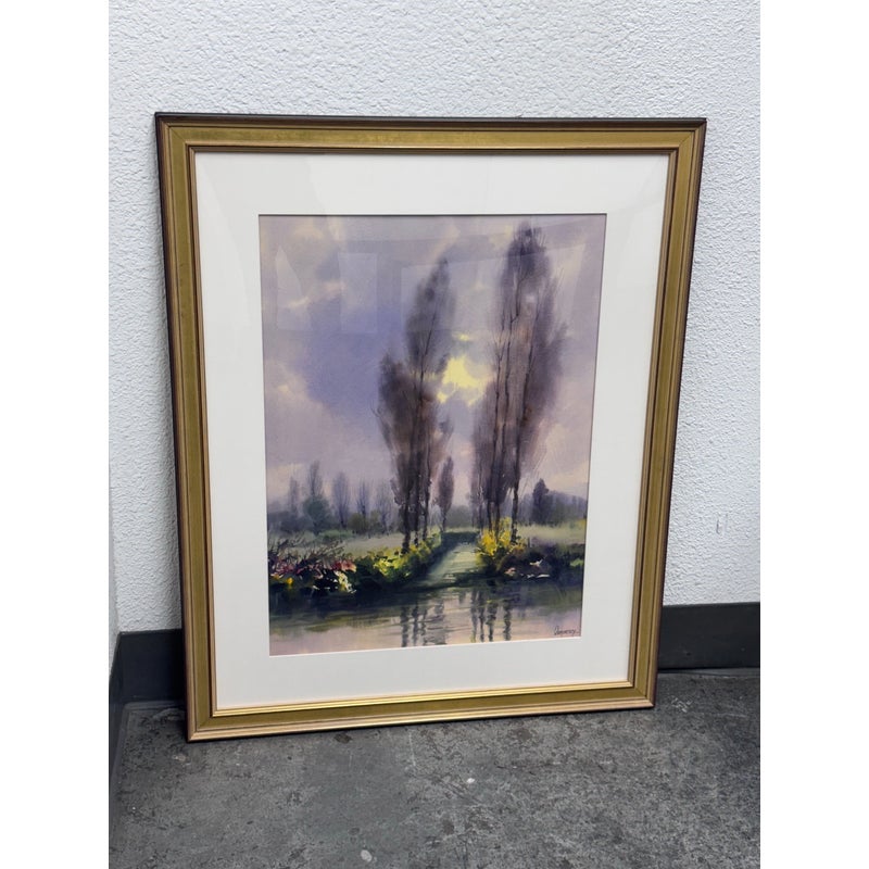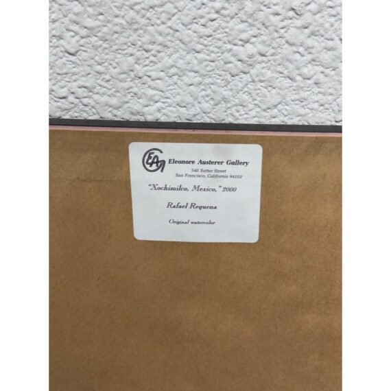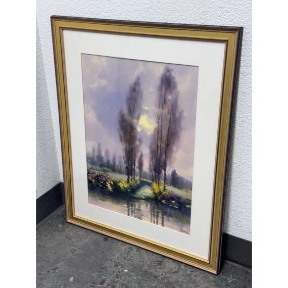 Design Plus Gallery presents a Circa 2000 “Xochimilco, Mexico” Framed Watercolor by artist Rafael Requena (1932 – 2003). The painting depicts a landscape scene with trees reflected in a body of water. The color palette is dominated by soft, muted tones of purples, greens, and yellows, creating a tranquil and atmospheric effect. Requena was known for his masterful use of light and color in watercolor, often capturing the beauty of nature. This artwork appears consistent with his style, showcasing a blend of realism and romanticism. The painting is framed with a gold finish border and a white mat, which enhances its presentation. In good condition, minimal wear.