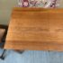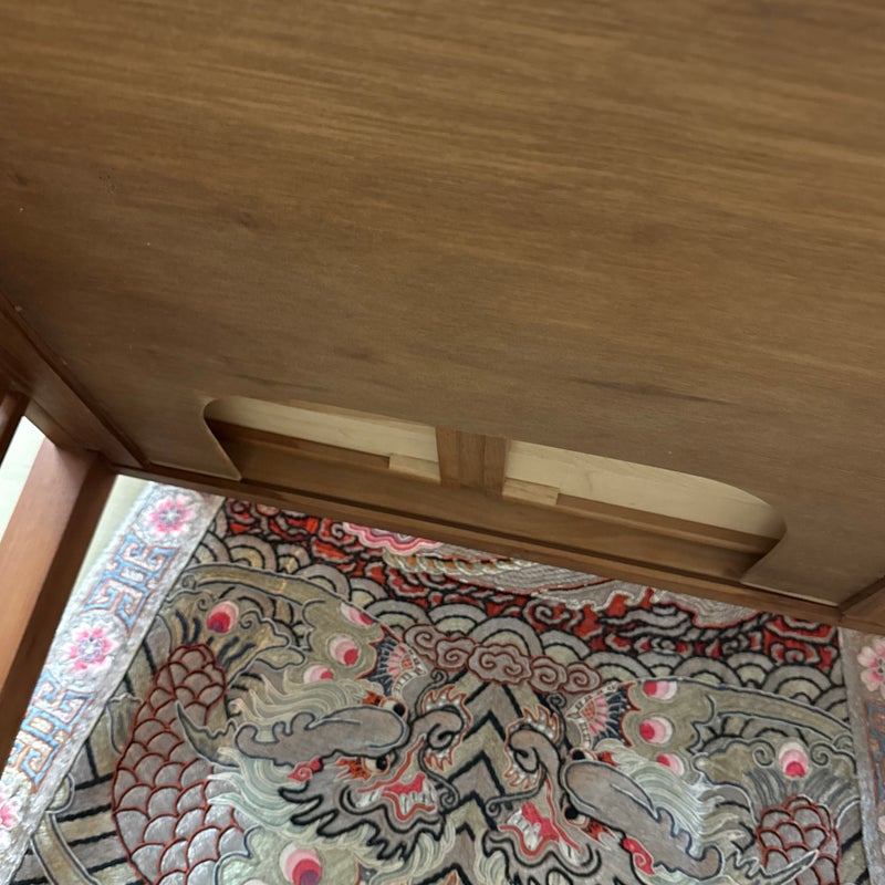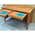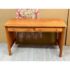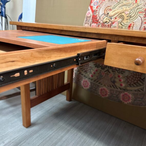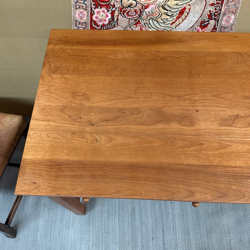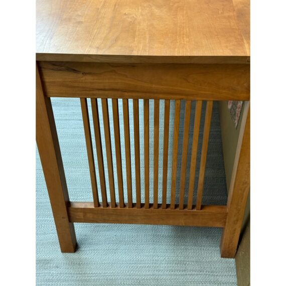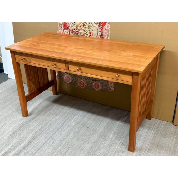 Design Plus Gallery presents a Cherry Wood Desk from Stickley. A true arts & craftsman piece from celebrated brand Stickley is a vintage desk made from cherry wood. The desk has two drawers that are of equal size that live under the table top surface. The sides have slats on each for a design style that will enamor you and your guests. The table could use a new stain to the surface as general wear from sun exposure and use is present. Overall it is in good condition for its usage. Made in the USA.