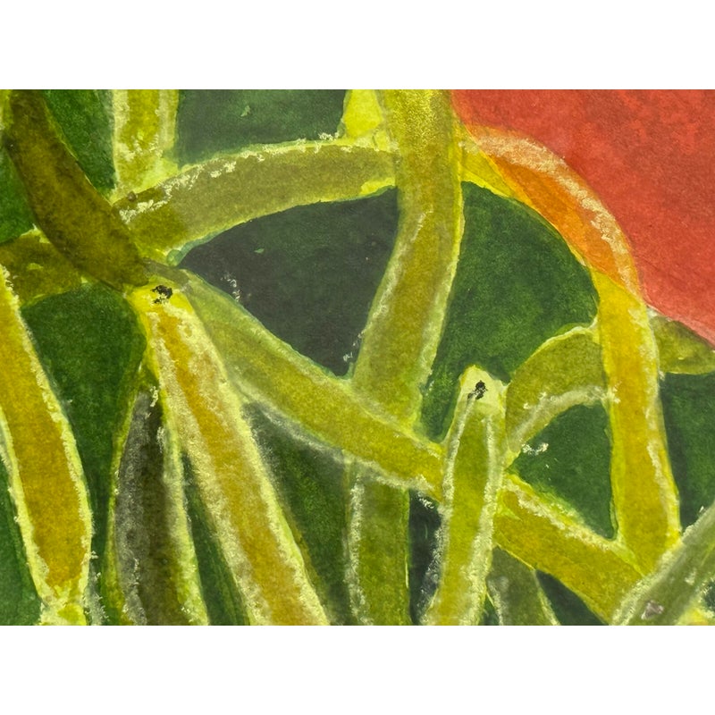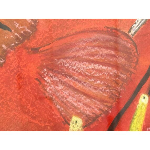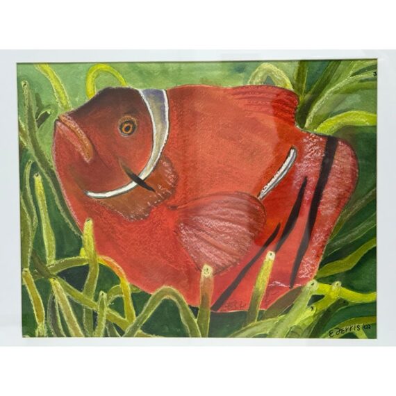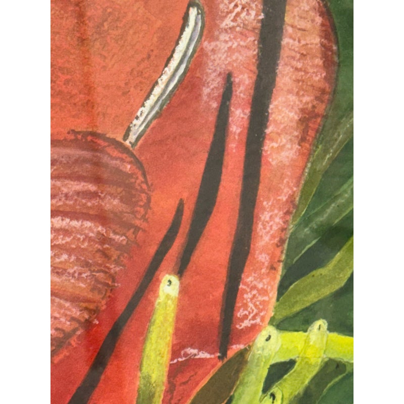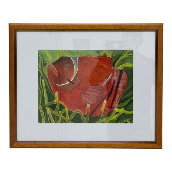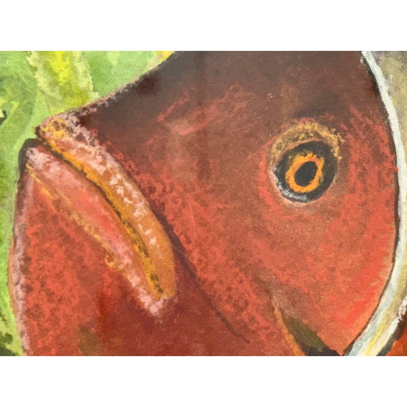 Design Plus Gallery presents a Circa 2002 Custom Framed Artwork by Artist Ederris. Custom-framed in a warm wood frame with a white mat, this striking artwork showcases a vibrant red fish nestled among lush green aquatic plants. The bold contrast of color and the graceful flow of the composition capture the natural beauty of marine life with an emphasis on color and form. Signed by the artist, Ederris, with the signature visible in the lower right corner, the piece blends artistic elegance with organic tranquility. The clean matting and refined frame elevate the artwork, drawing the eye to the luminous reds and verdant greens while offering a polished, gallery-quality presentation. A versatile statement for coastal, contemporary, or nature-inspired interiors, this framed piece brings a refreshing, serene energy to any space. In good condition, minimal wear from usage.