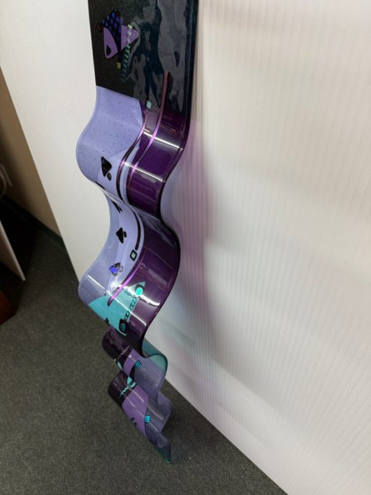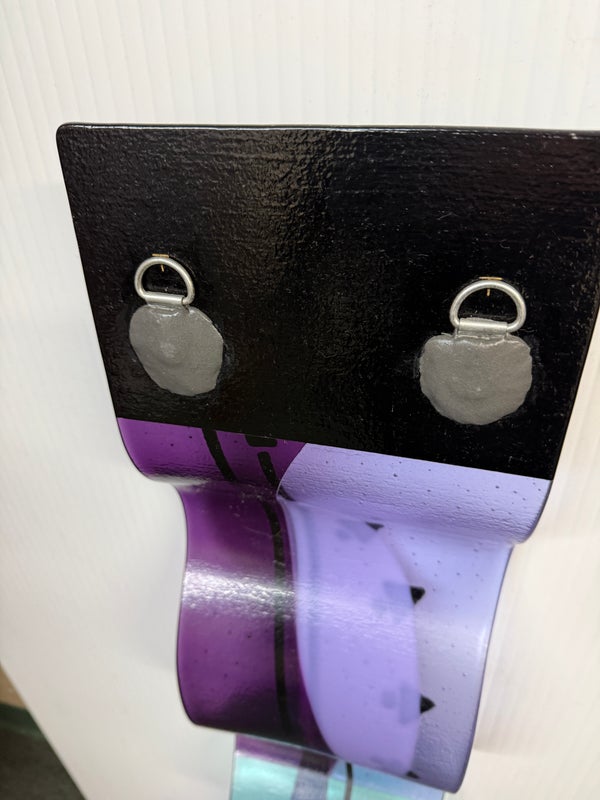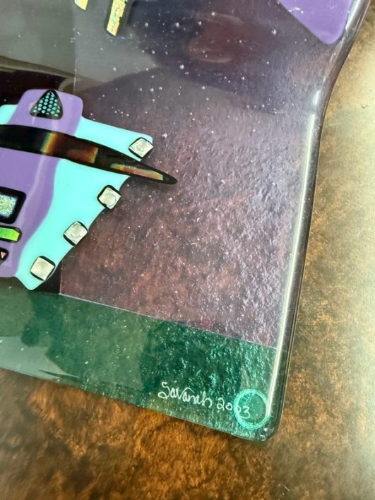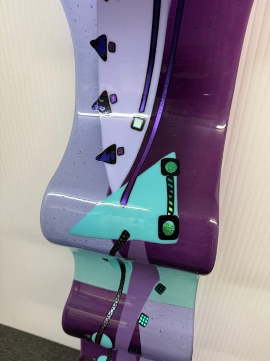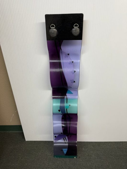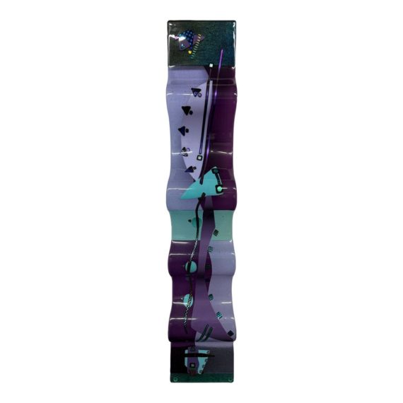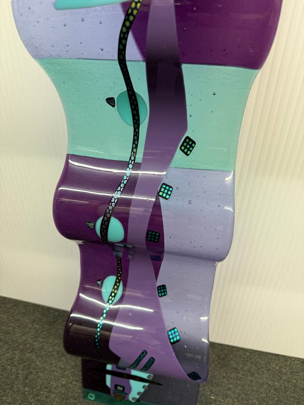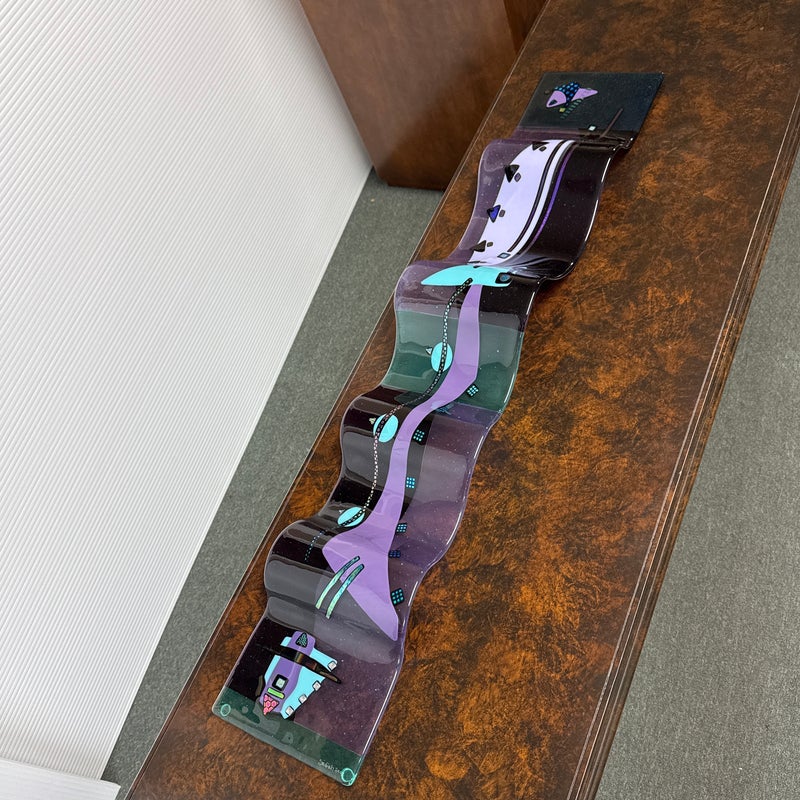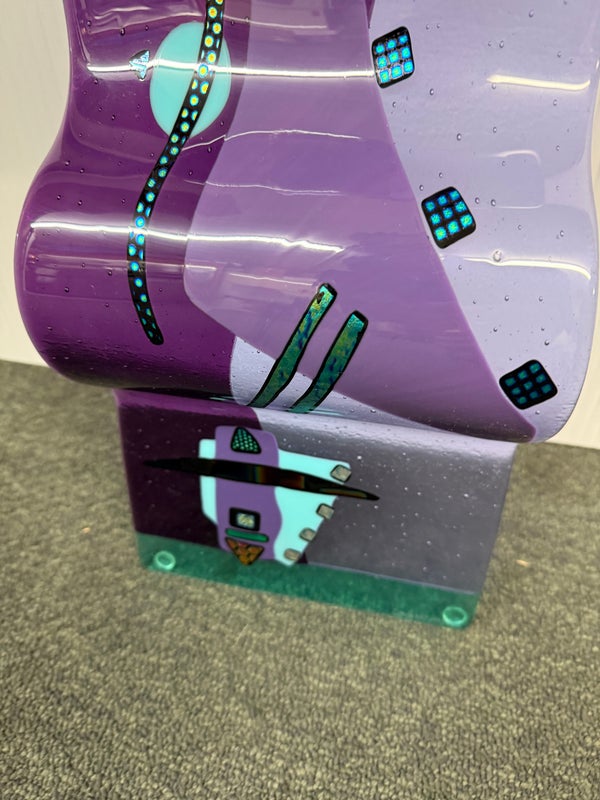 Design Plus Gallery presents the One-of-a-Kind Glass Sculpture Created by Laura & Michael Thompson from Illinois, USA. The sculpture is a large dimensional sculpture that features otherworldly shapes in a turquoise and purple art glass. The glass fusing technique was used to create this contemporary art piece in 2003 at Savanah’s Glass Studio. The postmodern designed piece is in good condition with minimal wear for its usage. Pair of rings on back for installation.