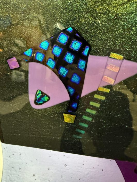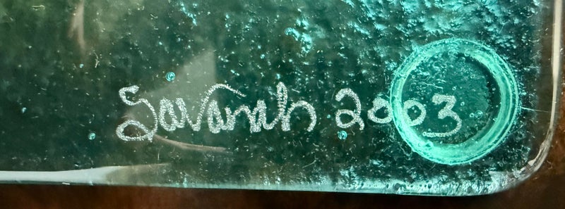 From the artist: The majority of our work requires 2 or more kiln firings. . All of our work is at least 2 layers of glass, with the colored layer on the bottom and a layer of clear on top. Some of our work has surface decoration consisting of diachronic and opaque glasses, which are arranged on top of the clear layer. The kiln is fired to 1480 degrees F., at which point all the pieces and layers of glass melt or fuse together to form a solid. When we have visually determined that the pieces are done, we open the kiln and rapidly drop the temperature inside to flash cool the glass. We then close the kiln and begin the annealing (cooling) process.