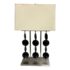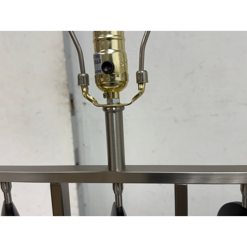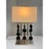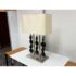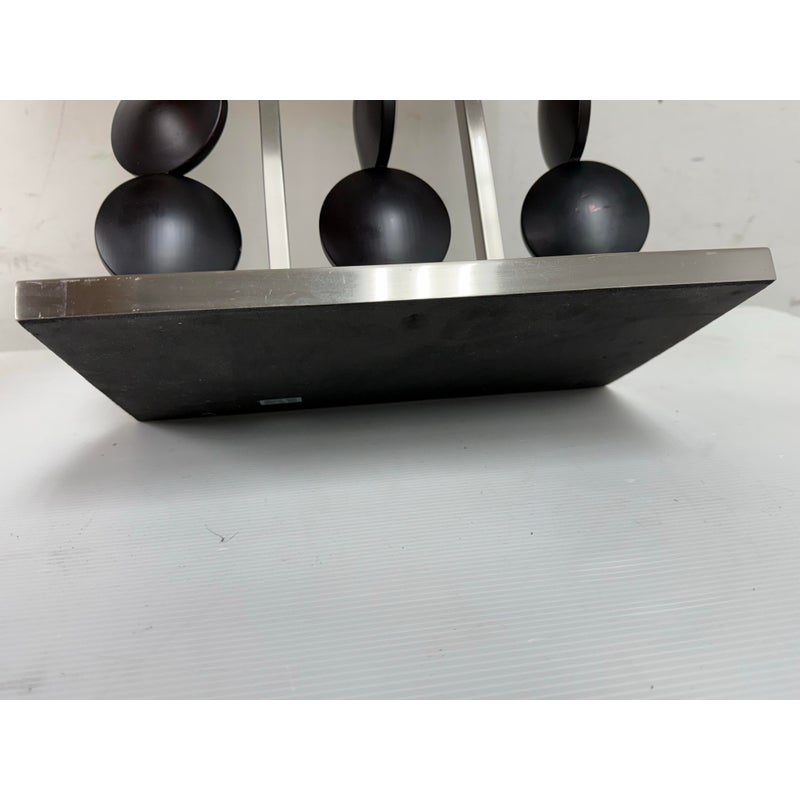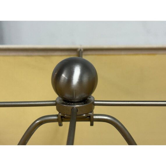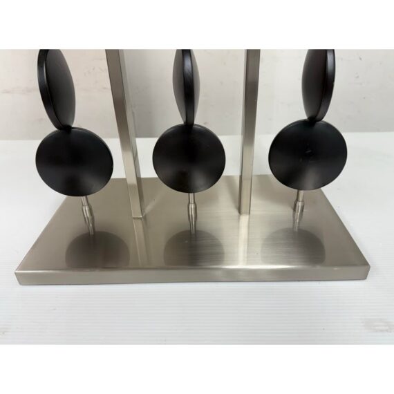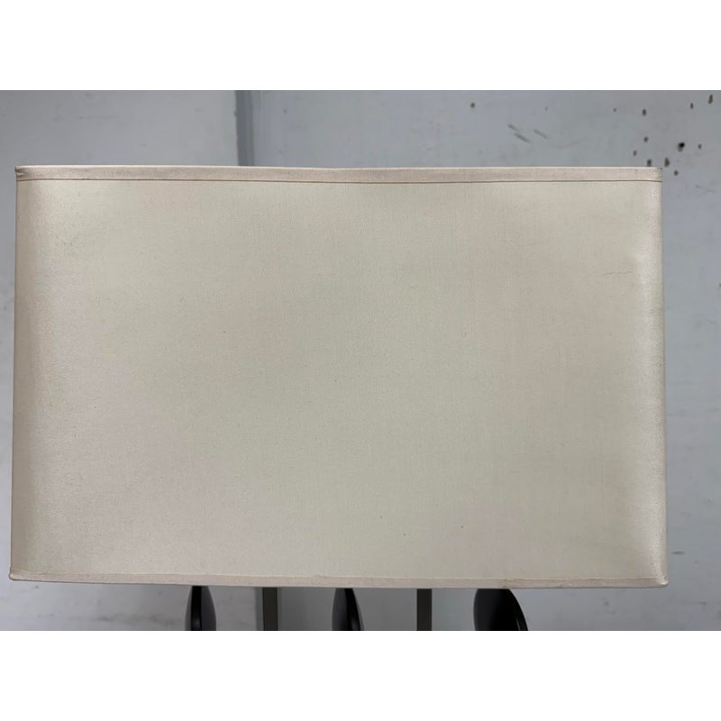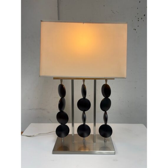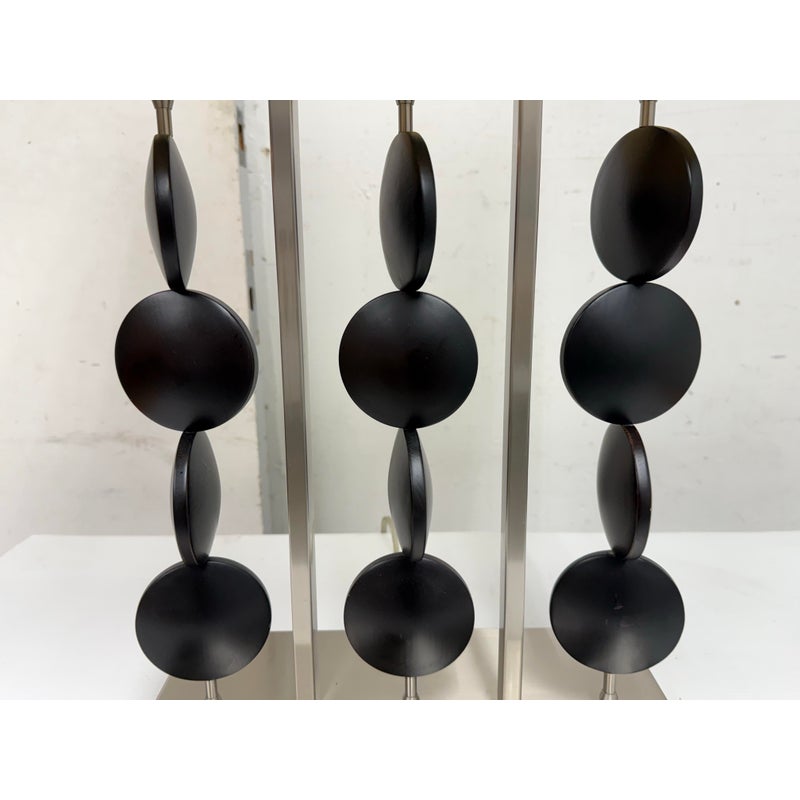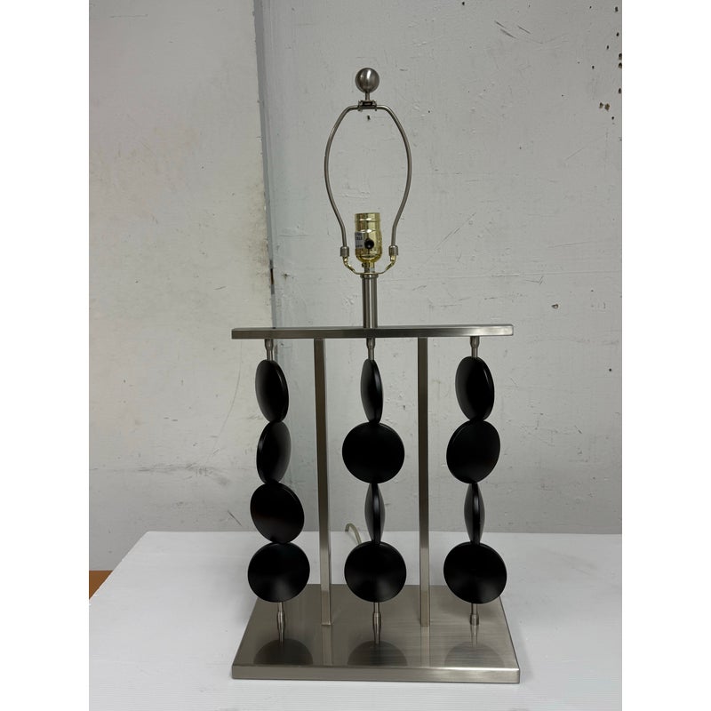 Design Plus Gallery presents a Table Lamp from Robert Abbey. The lamp is showcases a sculptural, architectural presence rooted in early 21st-century modern design. It has a brushed steel frame that anchors the composition as it rising from a square metal base to supporting \ vertical rods fitted with stacked wooden circles. Each circular element is designed to rotate freely on its rod, allowing subtle movement and shifting visual rhythm depending on placement and interaction. The lamp is topped with a rectangular fabric shade that provides balanced illumination while complementing the linear structure below. This is now a discontinued model with the brand and is in good condition with visible and minimal wear from usage.