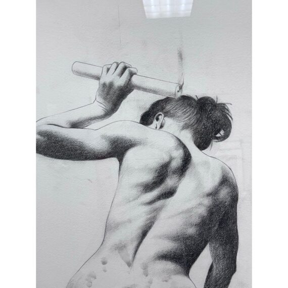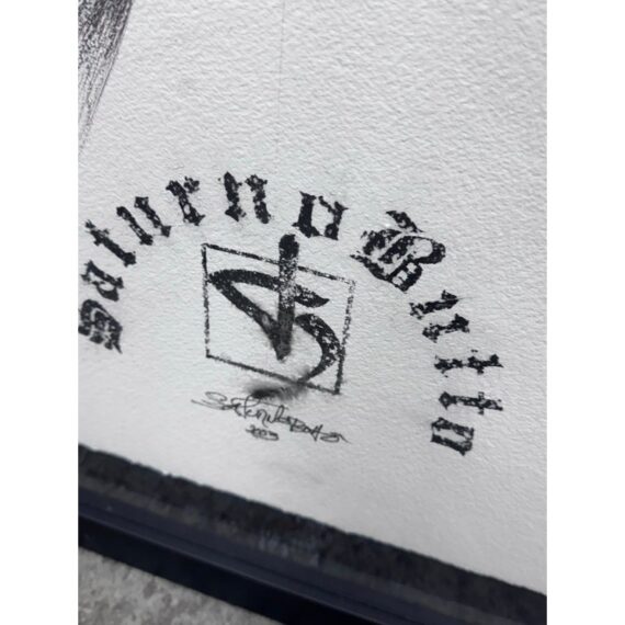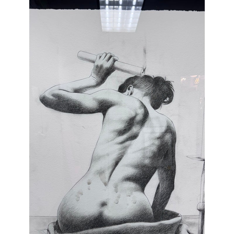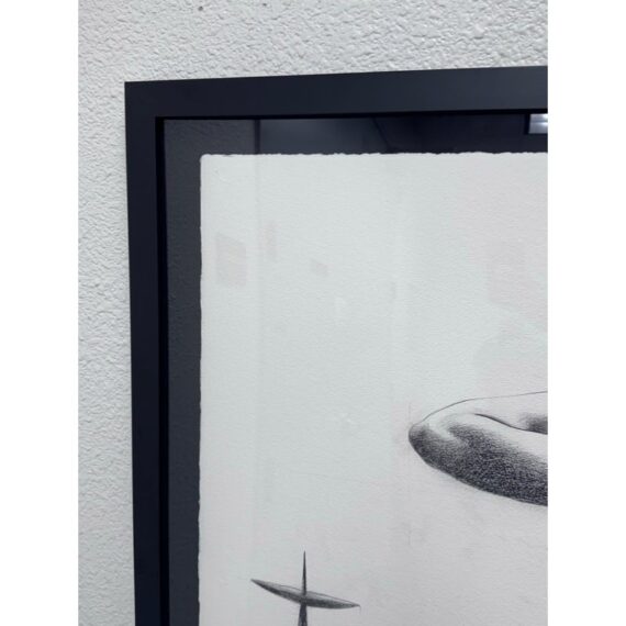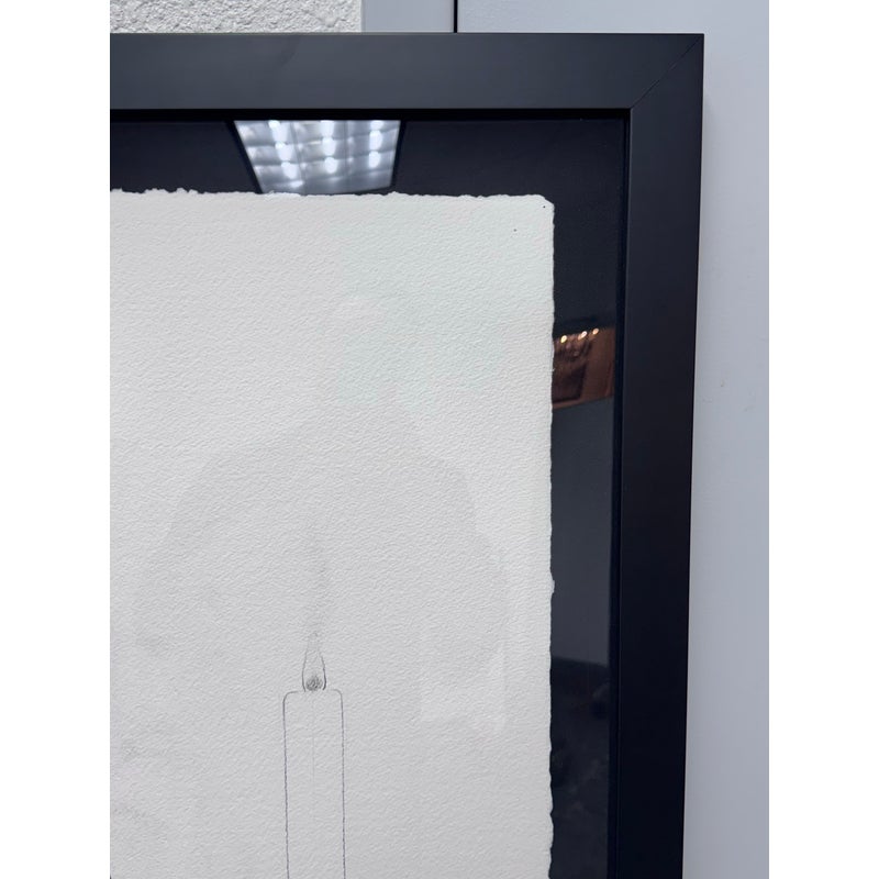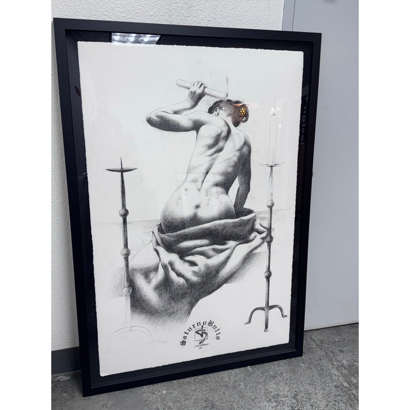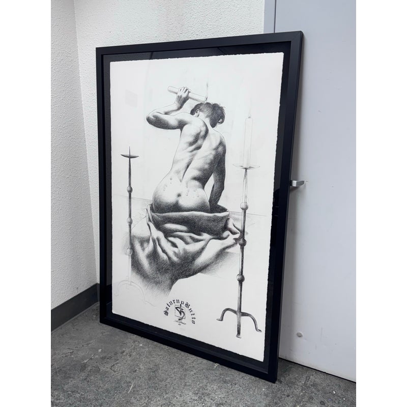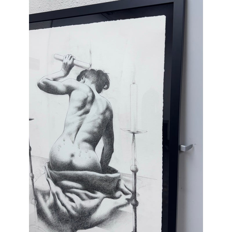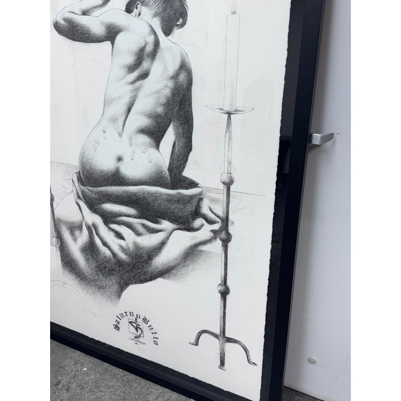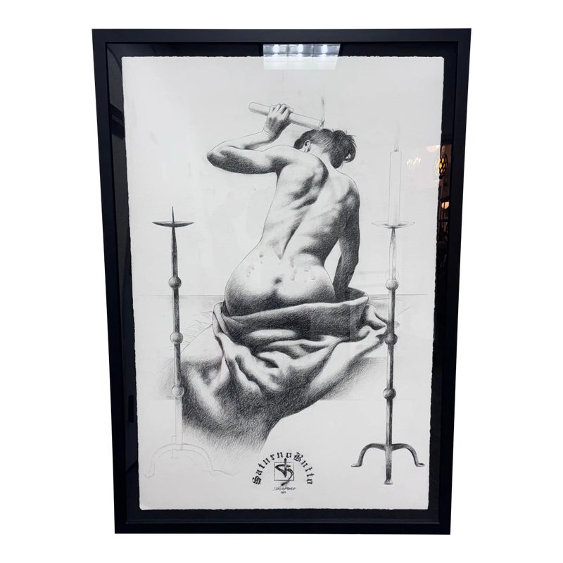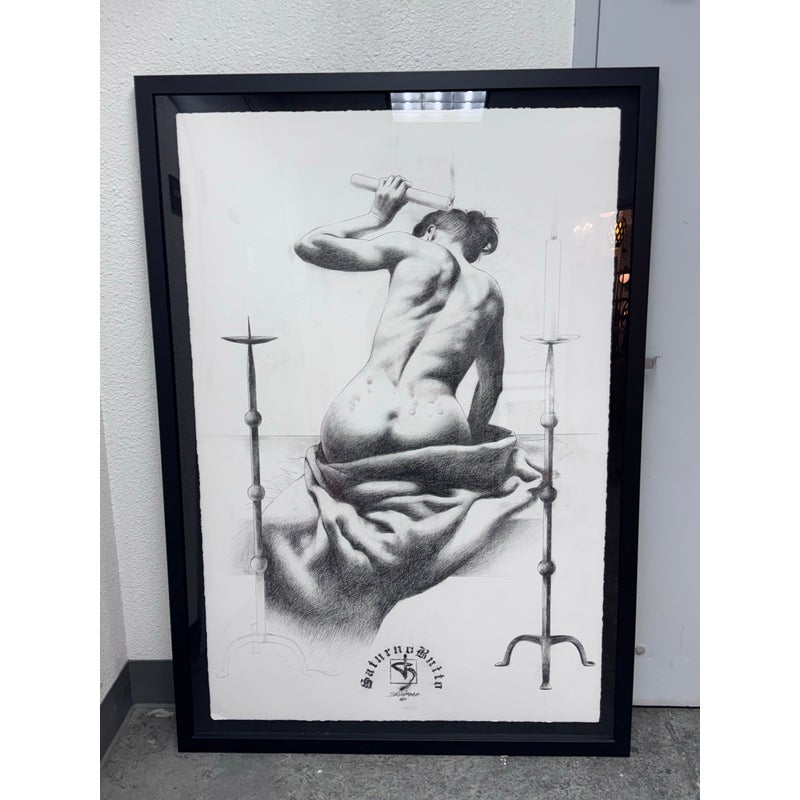Design Plus Gallery presents “Woman With Candle” by Saturno Buttò. Buttò is an Italian artist known for his provocative and darkly sensual paintings. This piece shows a woman with her back towards the audience, in all her natural state of being with a lit candle lifted over her head. The performance is compelling; does she enjoy this and make it a ceremony? One has to wonder. Much like this charcoal drawing, his work often explores themes of eroticism, religion, and mythology, blending classical techniques with contemporary subjects. The piece has been custom framed + is signed in stamp. Buttò made this in 2003 and was originally purchased in 2010 from Mishin Fine Arts, San Francisco. Is in good condition for its age + use.