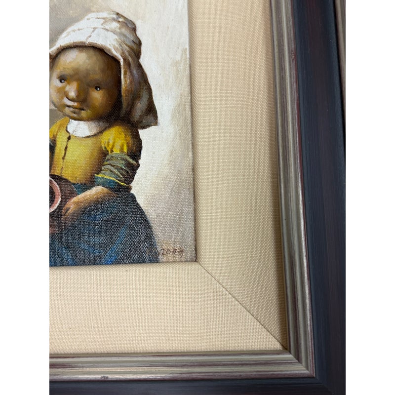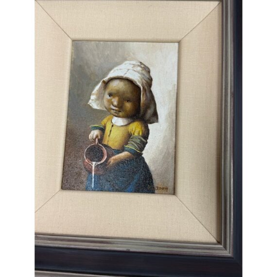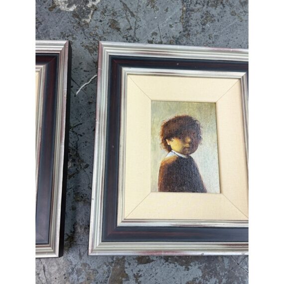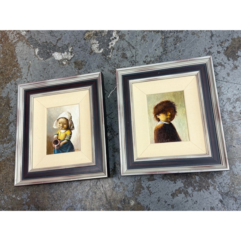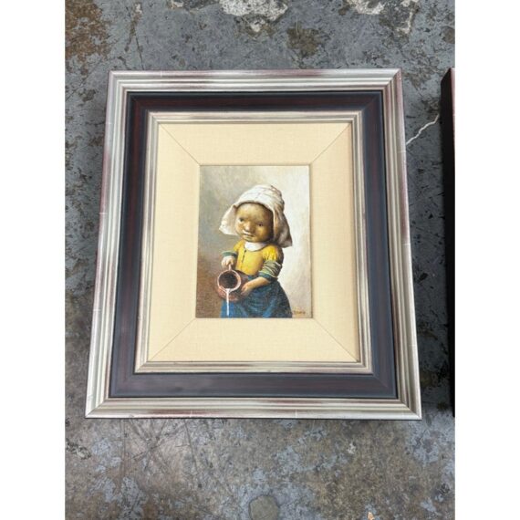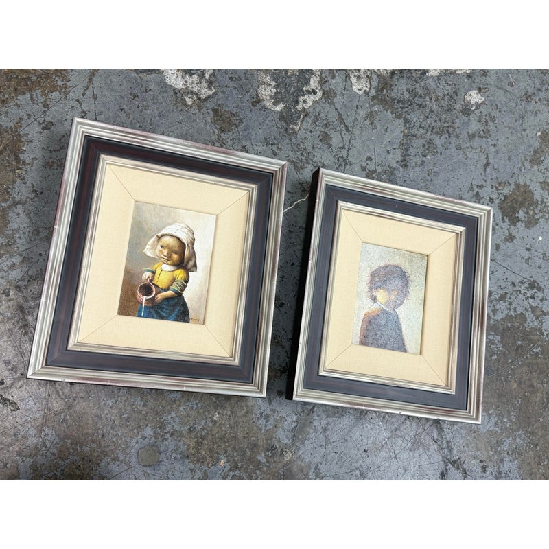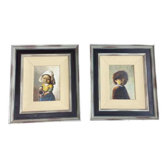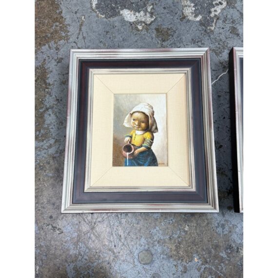 Design Plus Gallery presents a Set of Two “Little Rembrandt” + “Little Milkmaid” Illustrations from Unknown Children’s Book. Both of the images have a signature and date on the right hand side and is framed in a silver frame with multiple edges in silver + auburn colors. Thick linen matte surrounds their art work. The illustrations are in good condition with minimal wear for their age + use. Made in Poland.