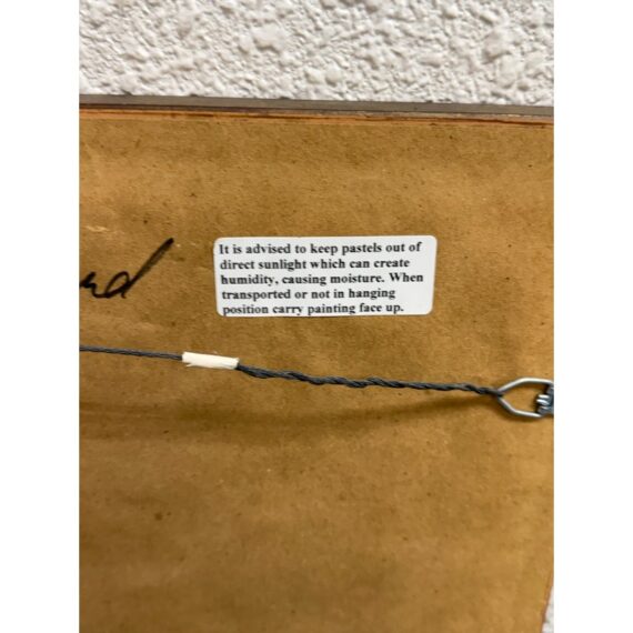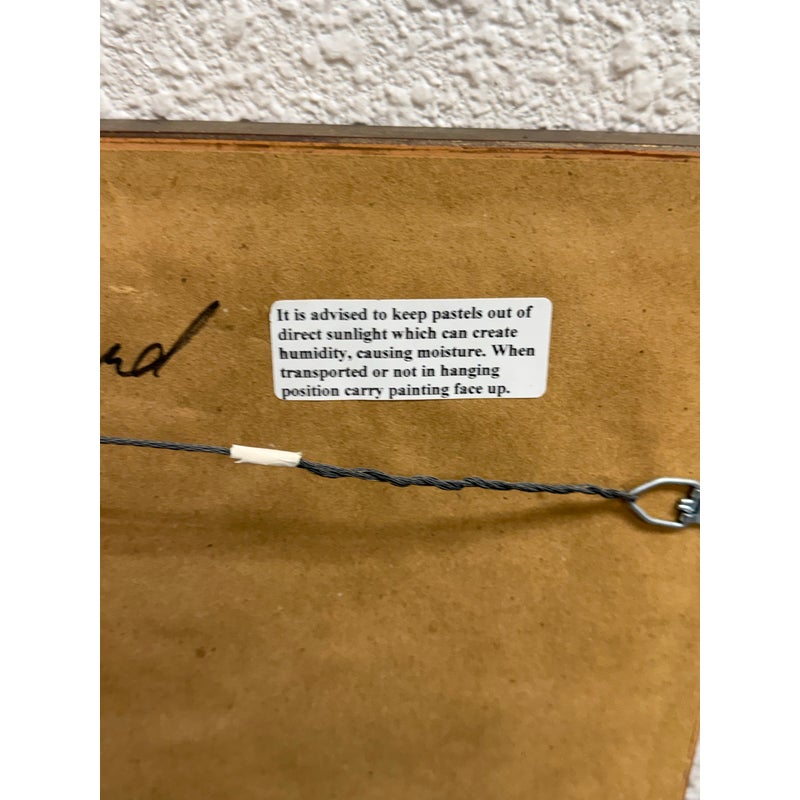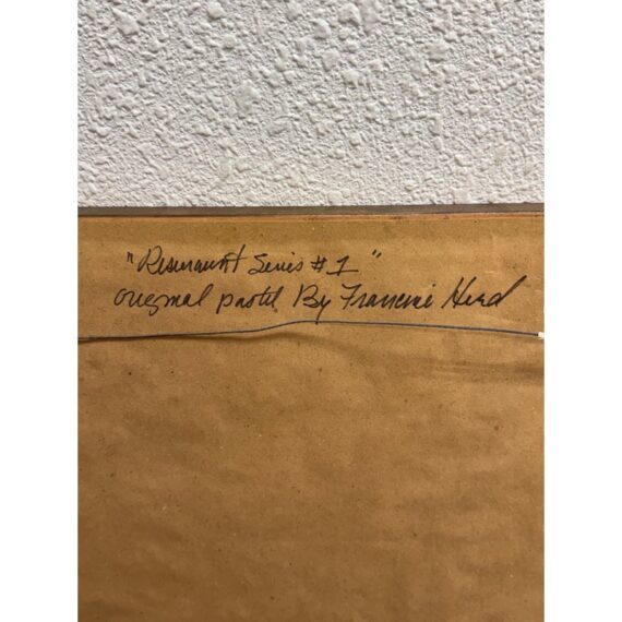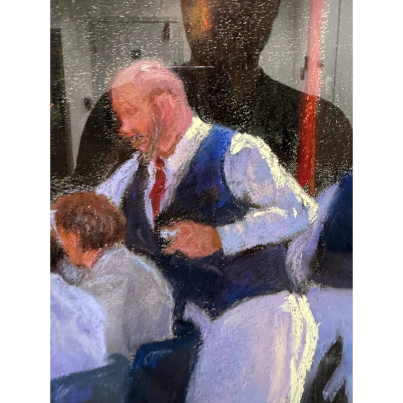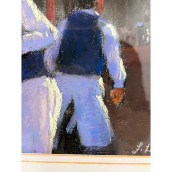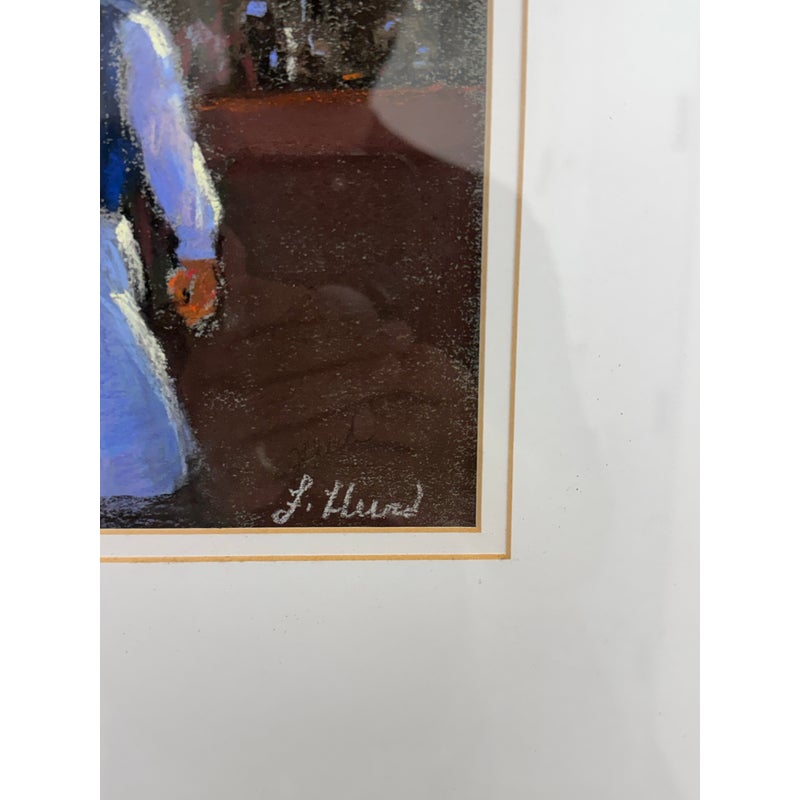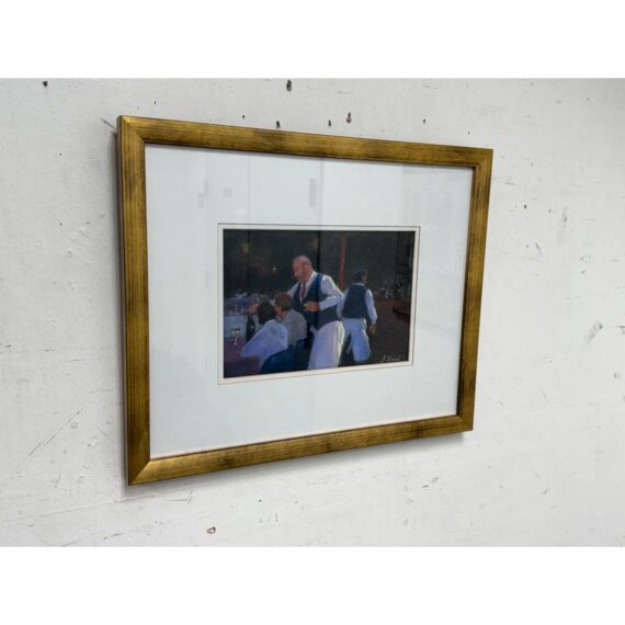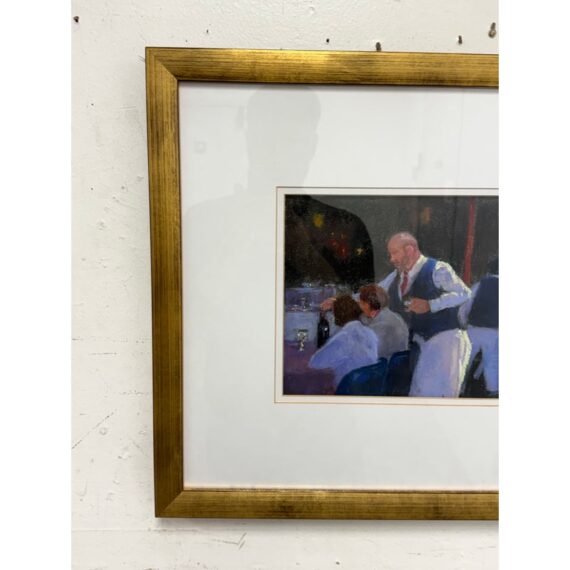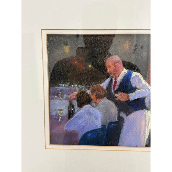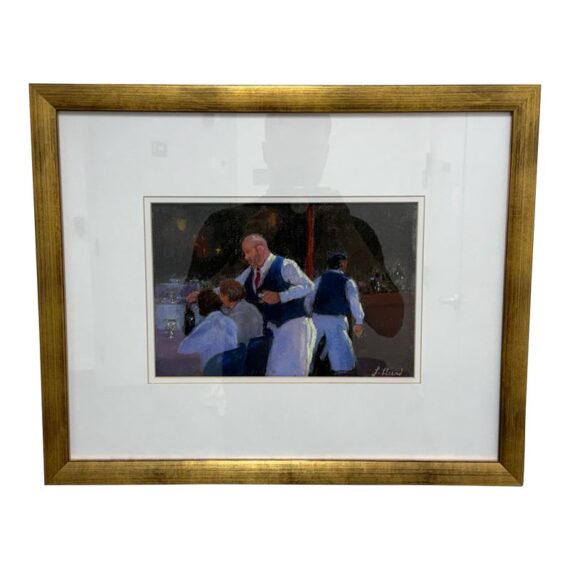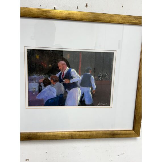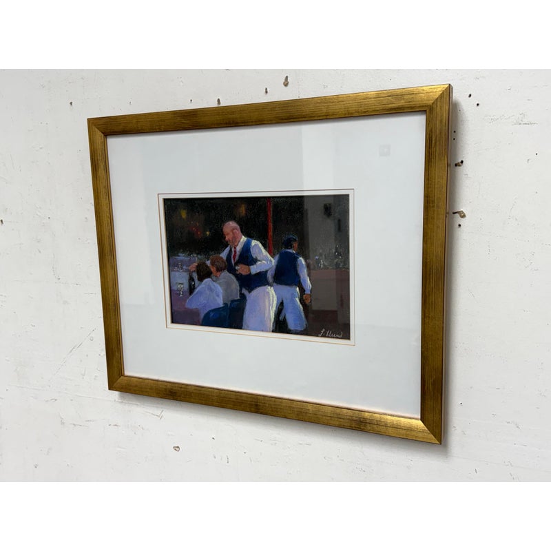 Design Plus Gallery presents “Restaurant Series 1” by Francine Hurd. The work is original and signed by the artist on the backside. Her work is in pastel and shows a servers catering to the needs of the restaurants patron with a busyness in the background. It is in a thick matte with a gold frame. It is in good condition with minimal visible wear for usage.