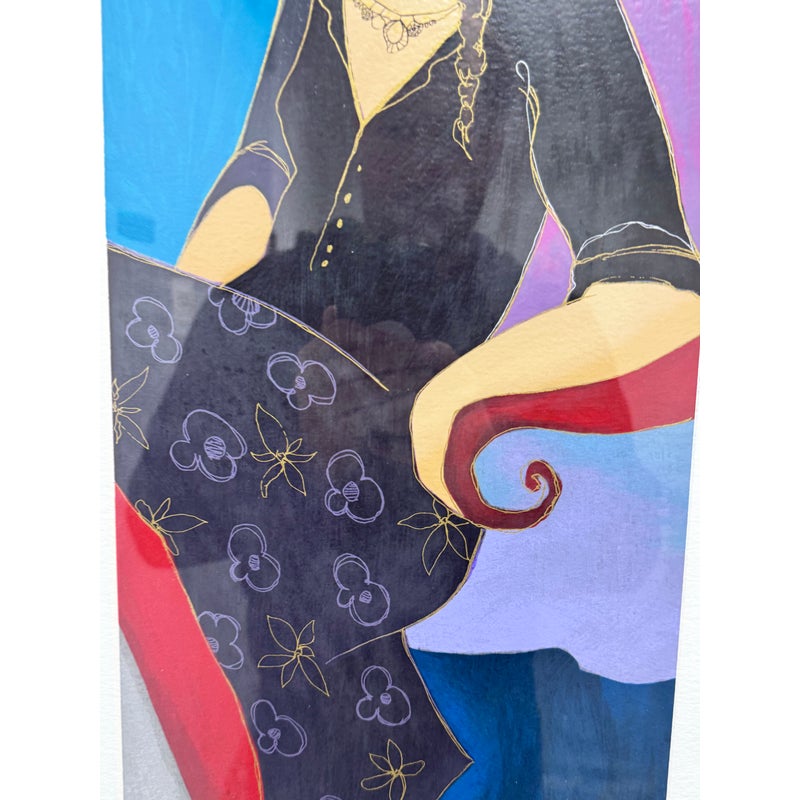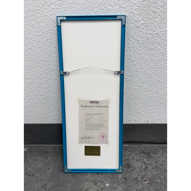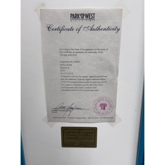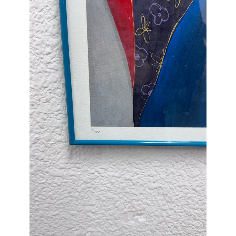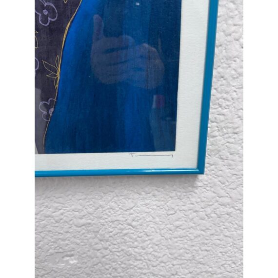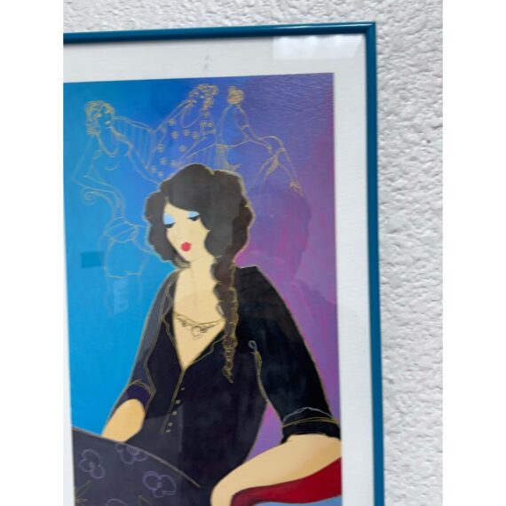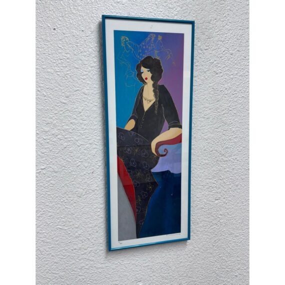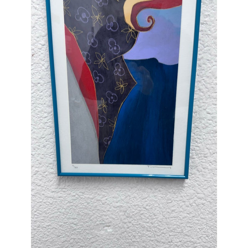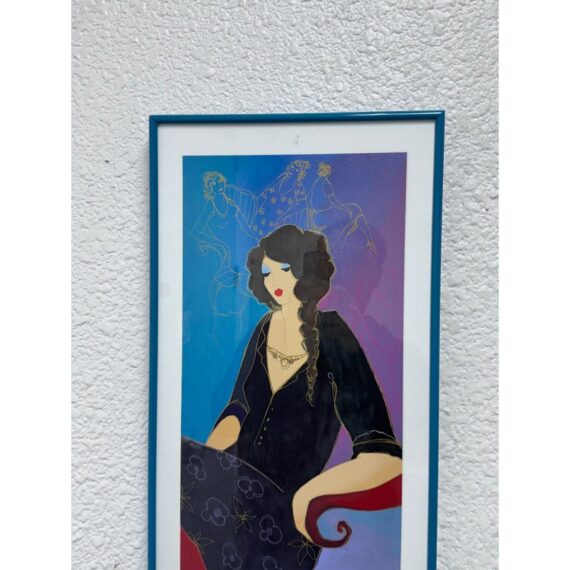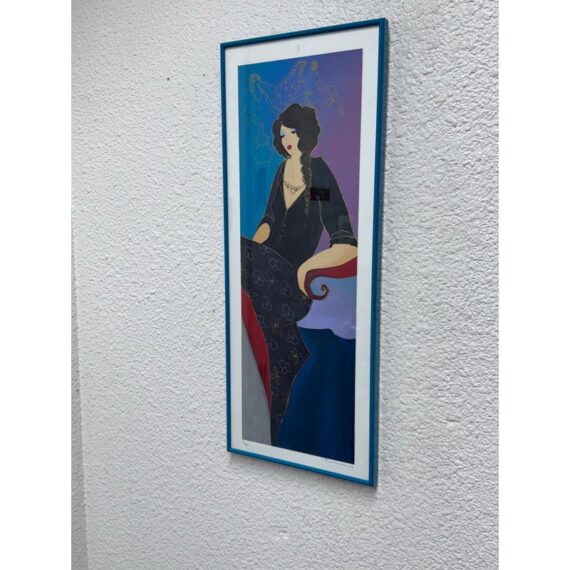 Design Pus Gallery presents a “Elegance II” by Itzchak Tarkey. Reproduced print of a painting and custom framed. Artist’s signature is located in the bottom left. It has been numbered 177 of 350. Frame is complementary to the colorful palette with a unique teal and white matte. The figure dons stylish fashion in front of a small still life setting for a Parisian vibe. Minor wear, art piece is in good condition. Ready for hanging in your space with picture wire on the back. Certificate is present and on the backside of the piece.