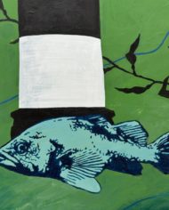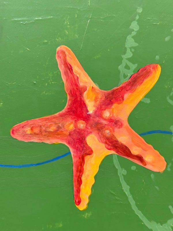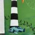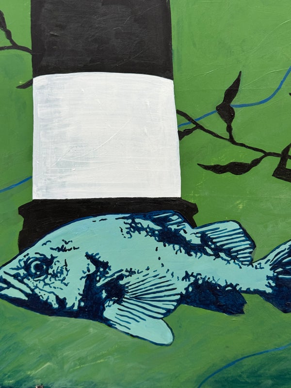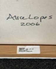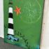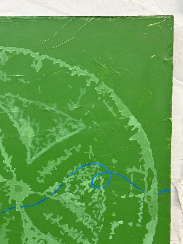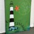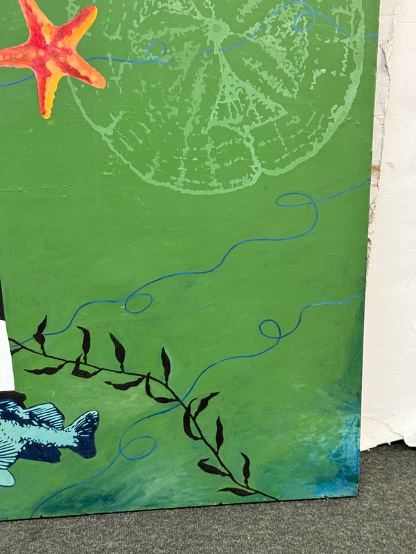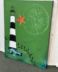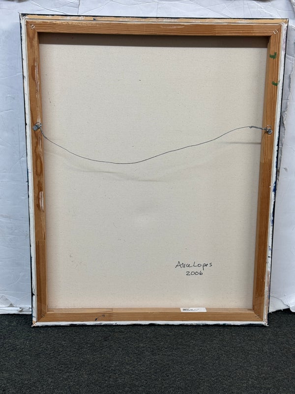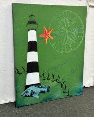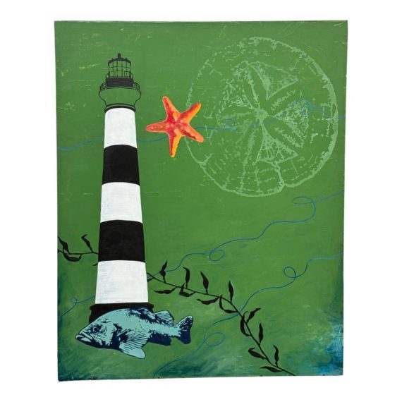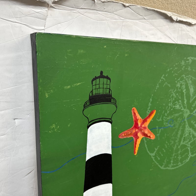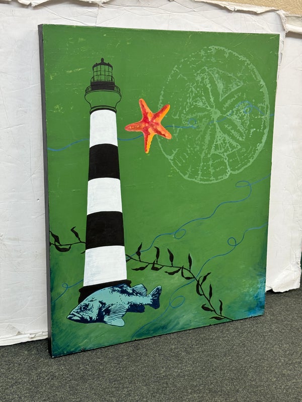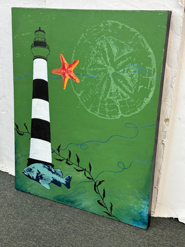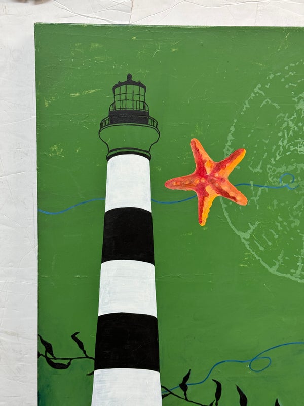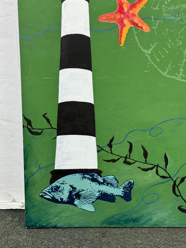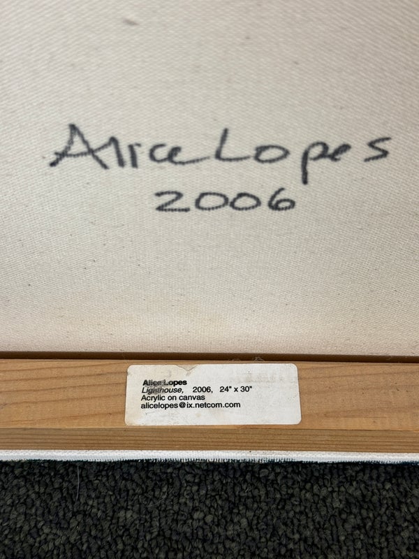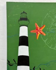 Design Plus Galley presents an Original Acrylic on Canvas Artwork by Alice Lopes, Signed + Dated. The lighthouse rises as is the central focus with maritime elements over a green background. The art is striking, bold and calming all at once. Is in good condition with minor signs of wear.