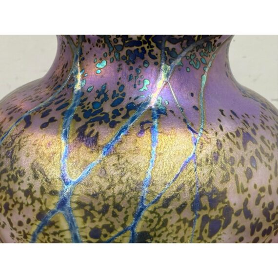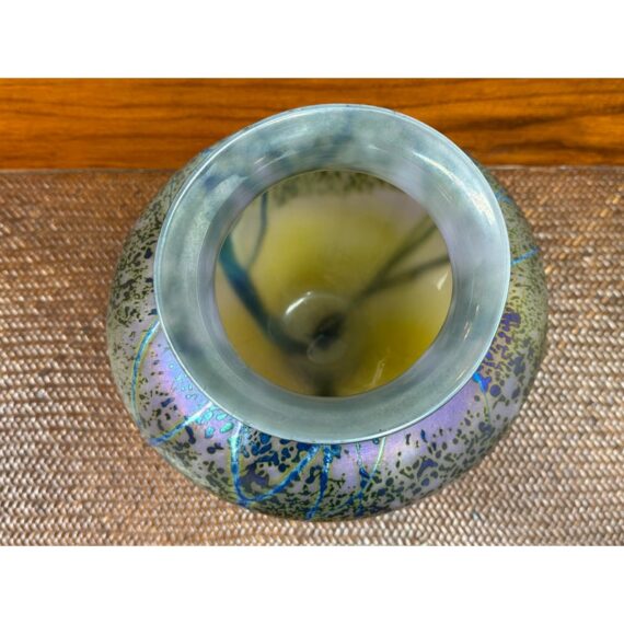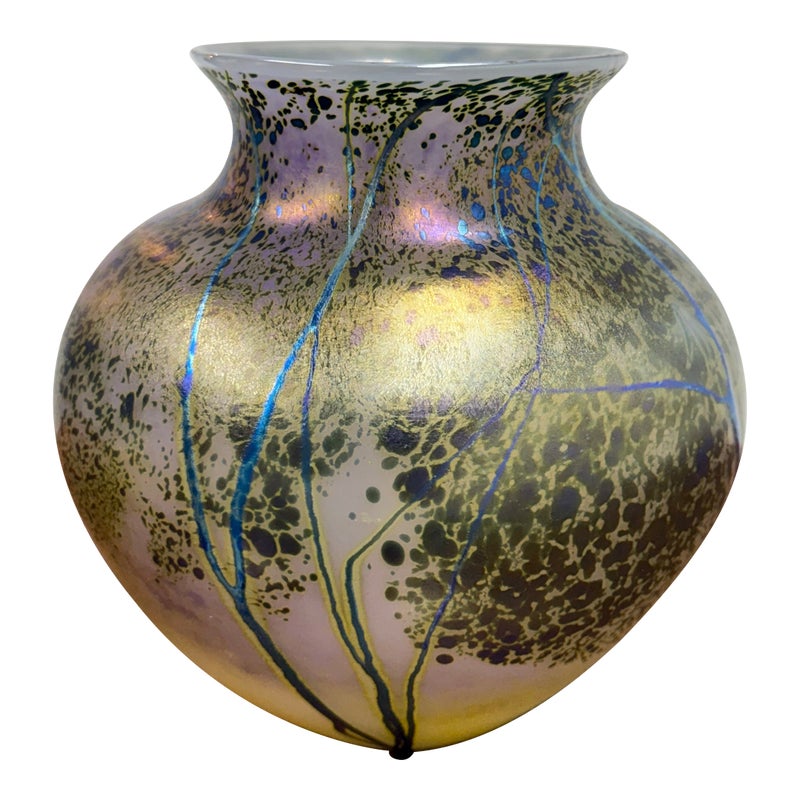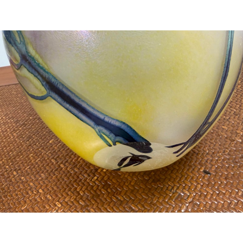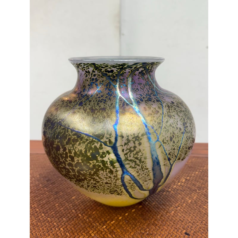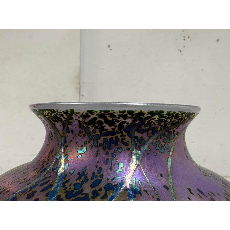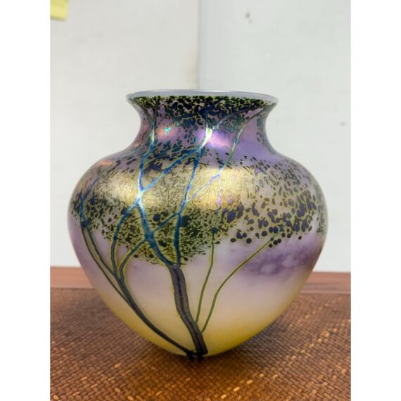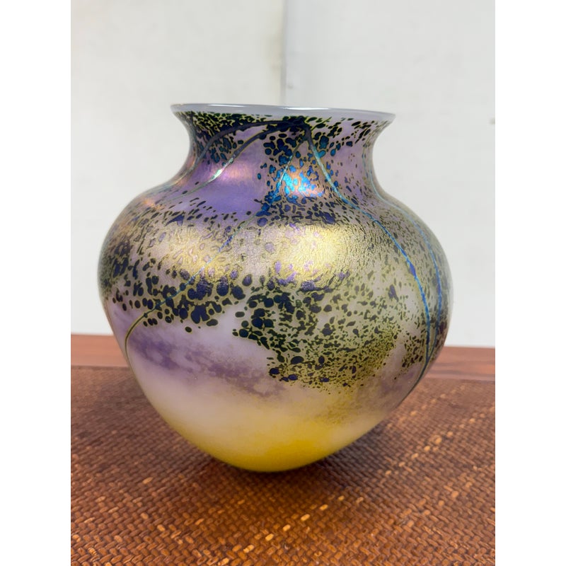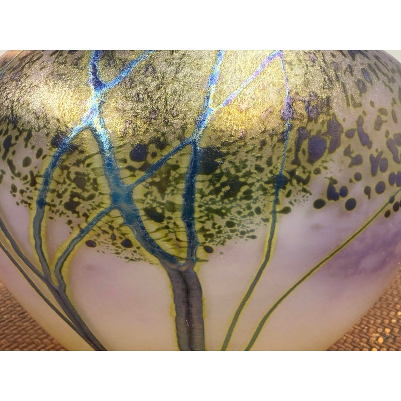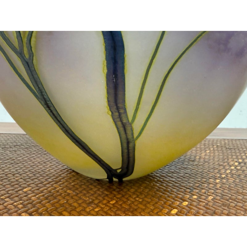 Design Plus Gallery presents the Sunset Series Art Glass Vase by Renowned American Contemporary Glass Maker, Peet Robison (1948-2012). Peet Robison was a prominent artist and figure in the studio glass community of Central and Southwestern US. The vase depicts an abstract landscape with a blue to pink sunset background and iridescent blue/green trees in silhouette. Signed by the artist and dated 2007. It is in overall good, as-pictured with minimal surface wear.