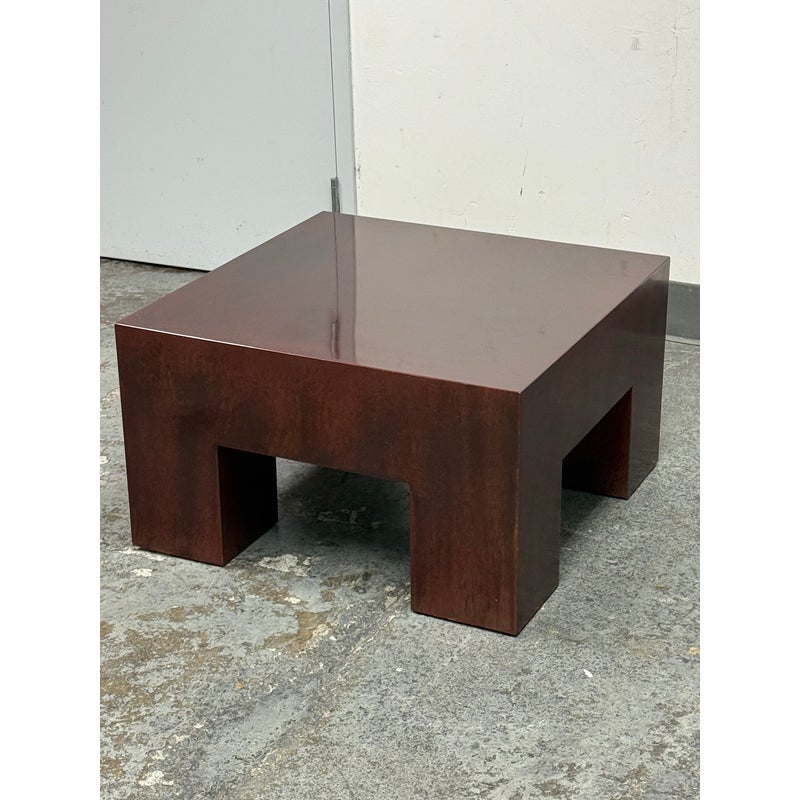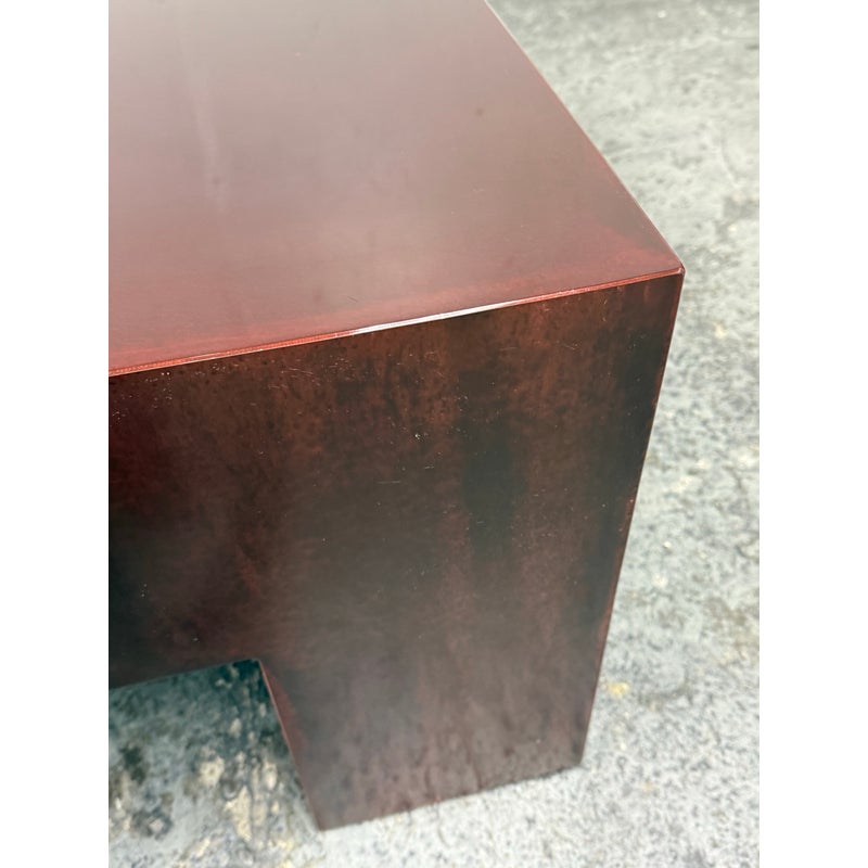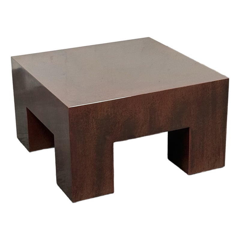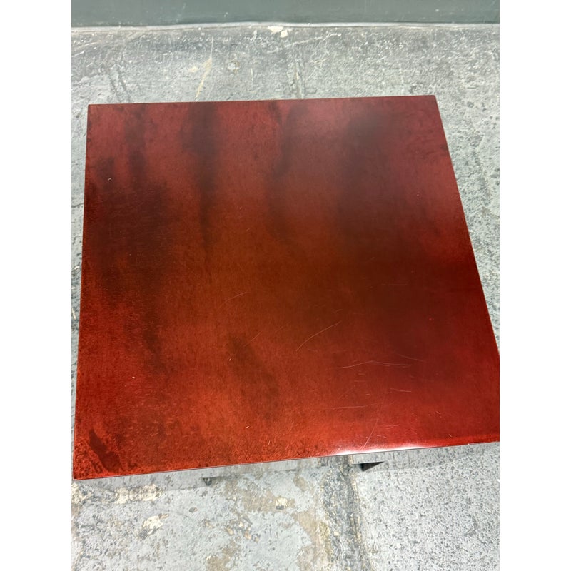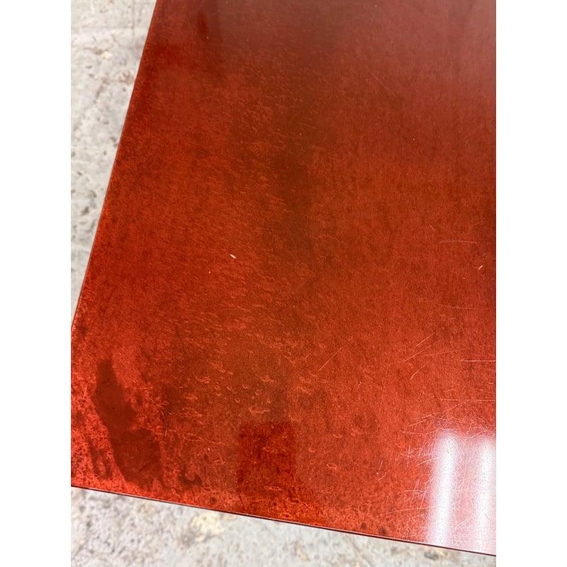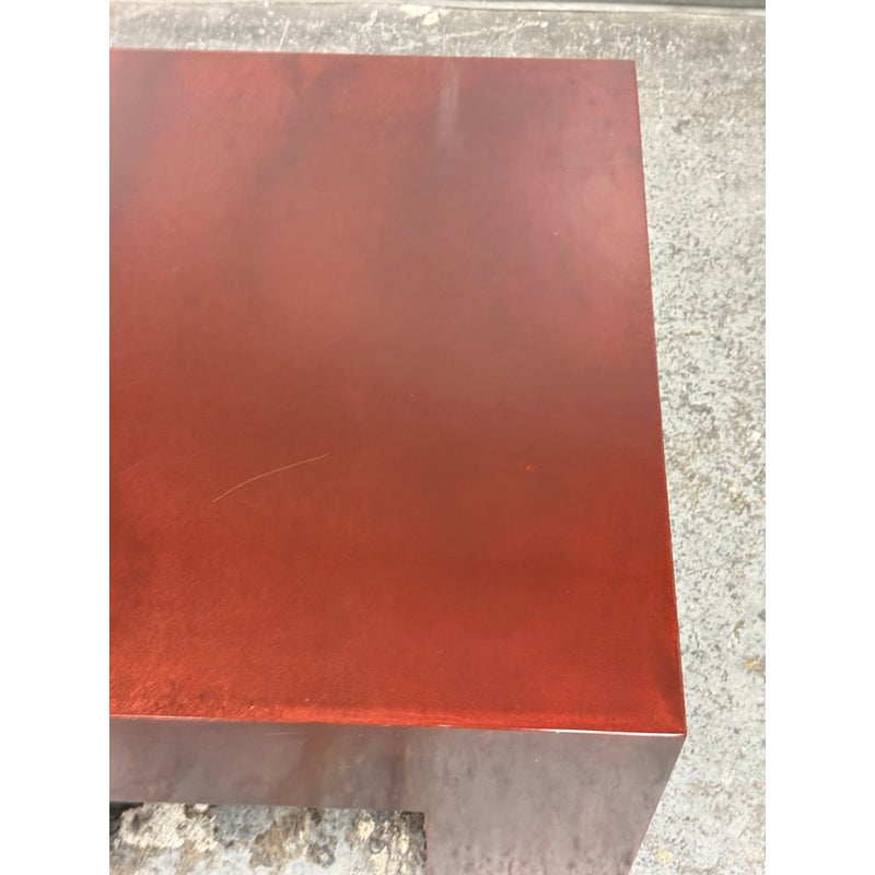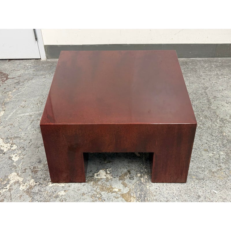 Design Plus Gallery presents a Red Metal Coffee Table from the Early 21st Century San Francisco Design Center. This piece will be uniquely yours as only one was made in this type. You get a nice metal shell of a body that has an oxblood paint adhered to the metal. The table has a low profile with four wide legs supporting its surface. There is a signature and date present on the inner frame of the table. It is in good overall condition for its usage. Made in the USA.