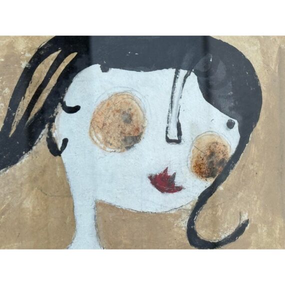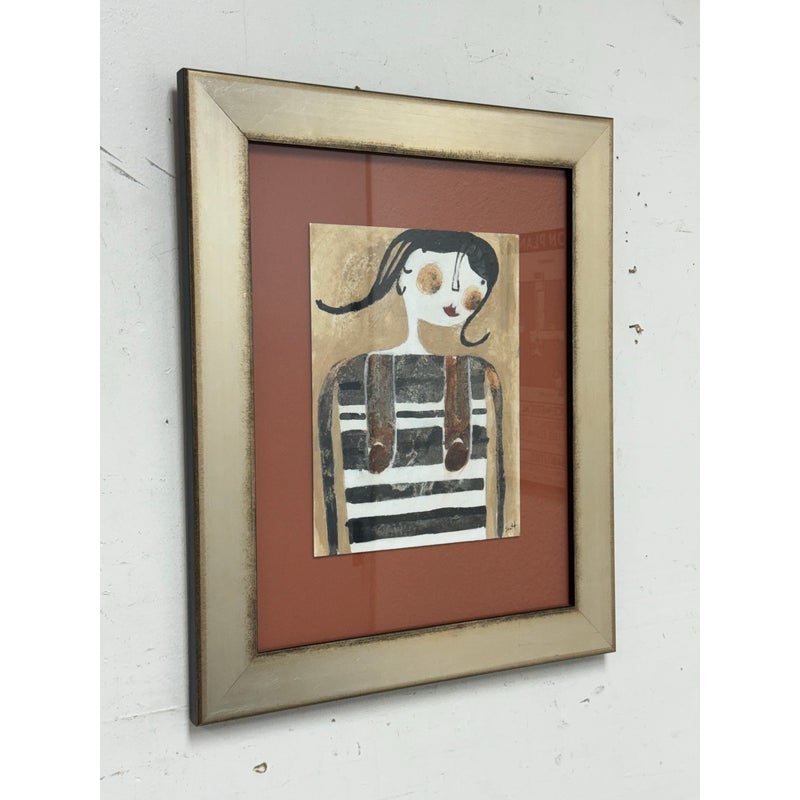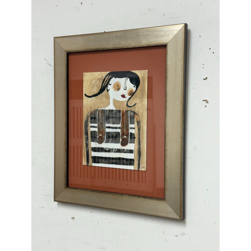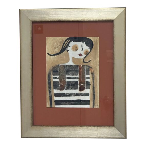 Design Plus Gallery presents a Custom Framed “Stuck in a Mount” by Artist Scott Bergeyart”. A striking mixed-media work by Canadian artist Scott Bergey, centers on a stylized female figure with porcelain-white skin, blush cheeks, vivid red lipstick, and inky black hair, dressed in a graphic black-and-white overall. Bergey’s modern-meets-retro sensibility comes through in the clean contours and bold contrasts, while the custom presentation elevates the piece: a champagne-finish frame paired with a rustic cinnamon mat adds warmth and a subtly vintage note. Ready to display and ideal for contemporary, eclectic, or mid-century-inspired spaces.In good condition, visible and minimal wear from usage.