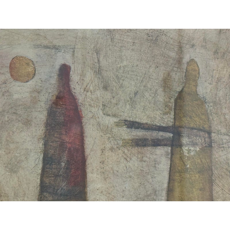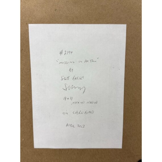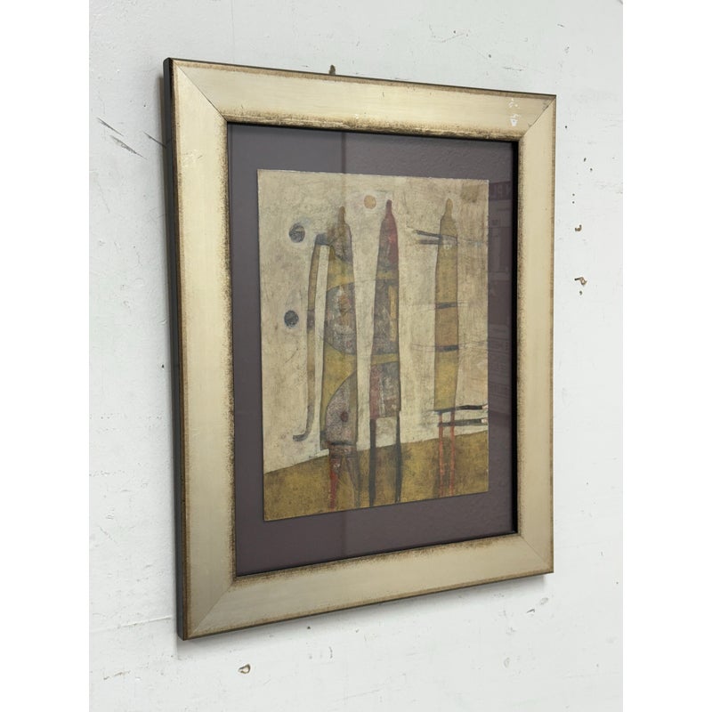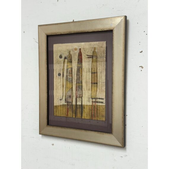 Design Plus Gallery presents a Circa 2013 “Missing in Action” Mixed Media by Artist Scott Bergeyart. Features Three shadow-like figures that seem to appear and recede through layered mixed media. Subtle textures and washes play against touches of yellow, red, and purple, creating a moody, modern-meets-retro atmosphere that feels both intimate and enigmatic. The composition balances figuration and abstraction, inviting quiet reflection on presence, memory, and the spaces in between.In good condition, minimal wear from usage.
