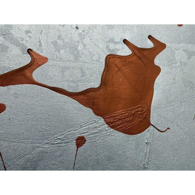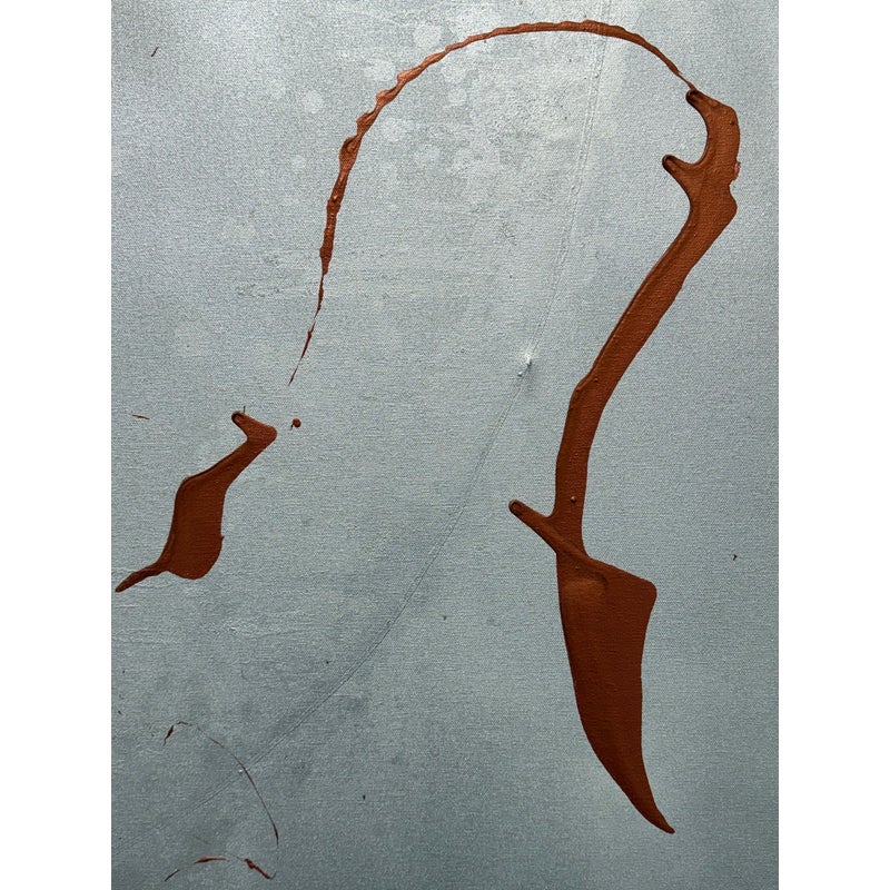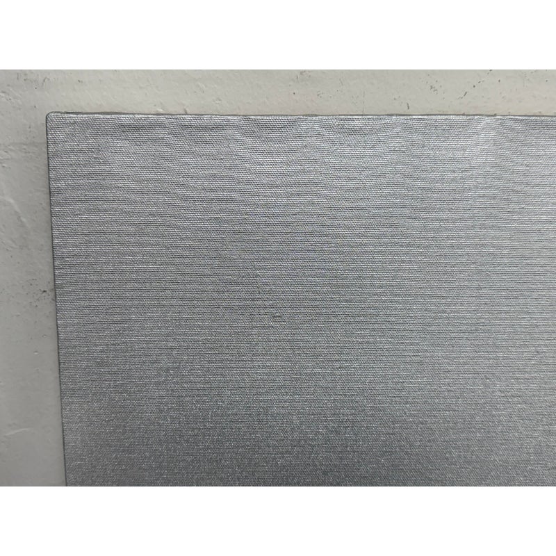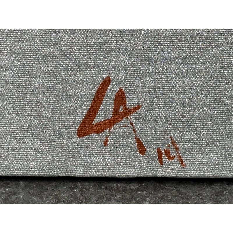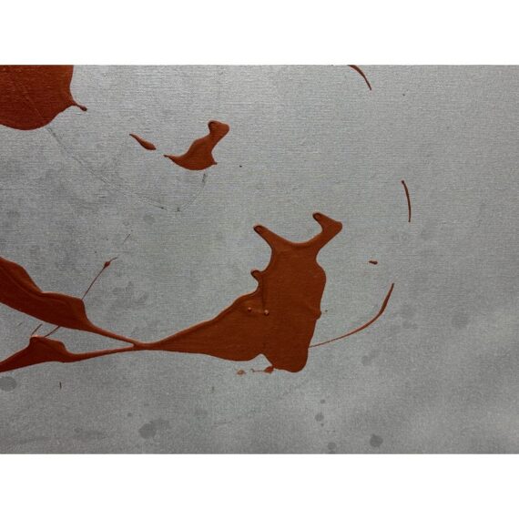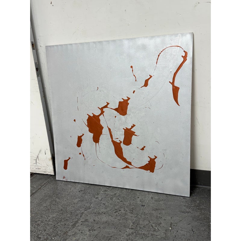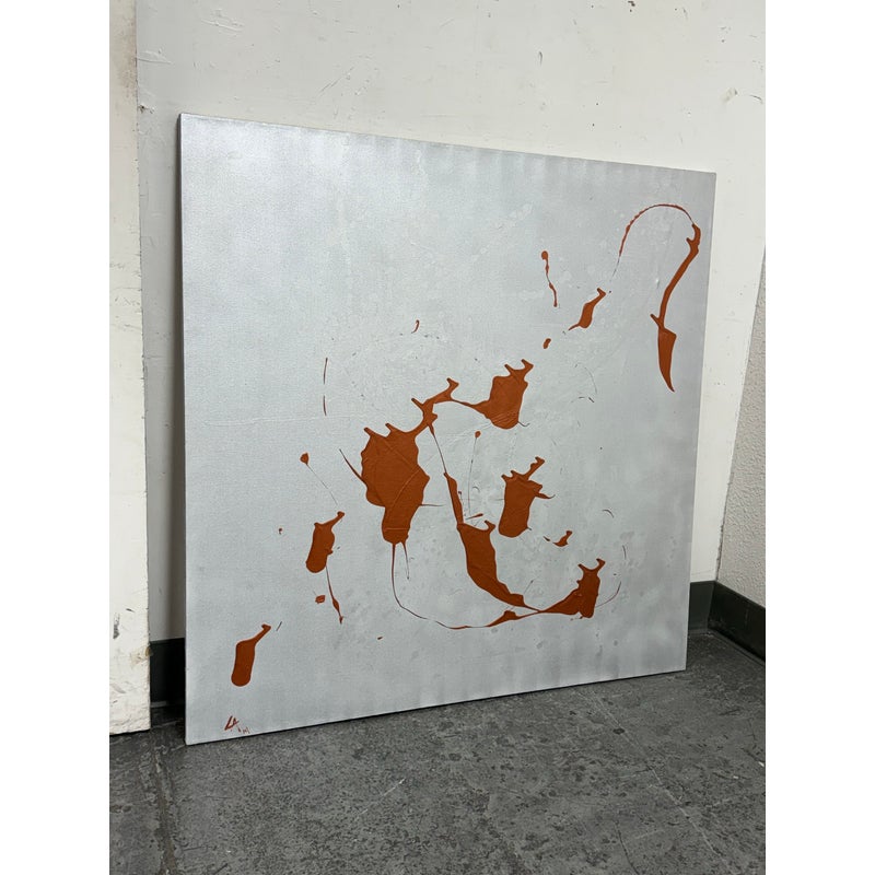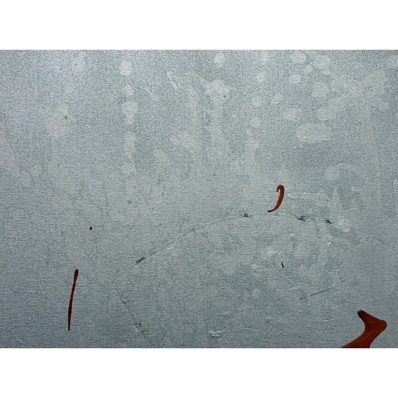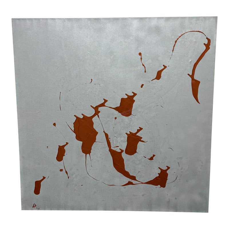 Design Plus Gallery presents a Circa 2014 Untitled Painting, Signed by Artist LA. This is a stretched canvas with a silver metallic all over paint with an amber acrylic splashed across for the utmost abstract design style. In good condition, minimal wear from usage.