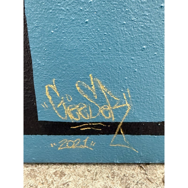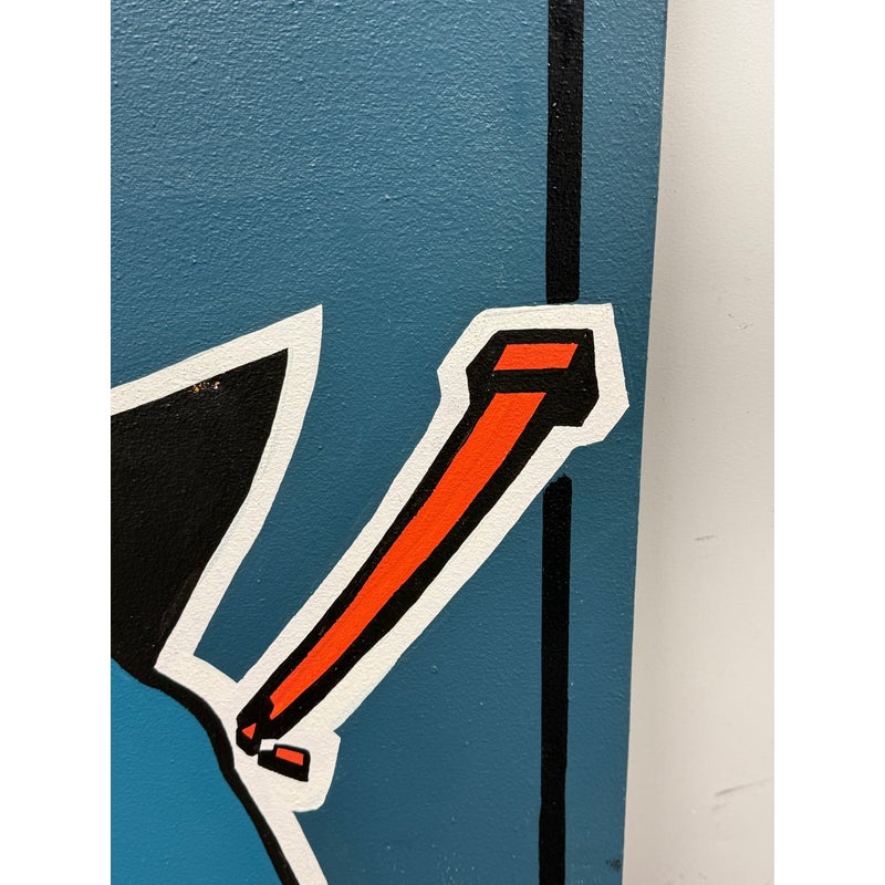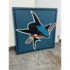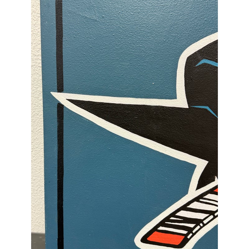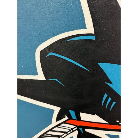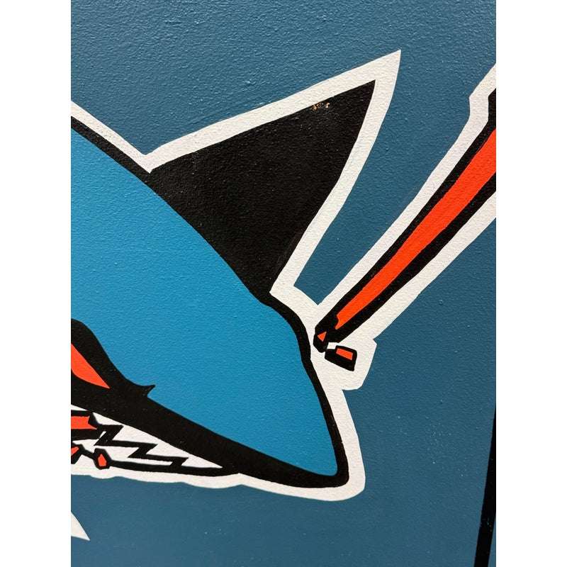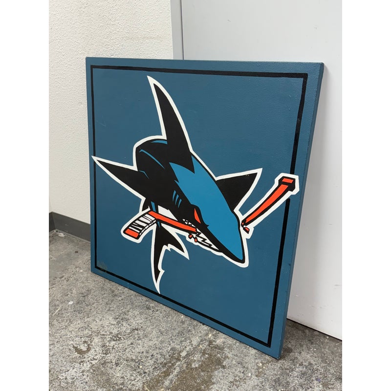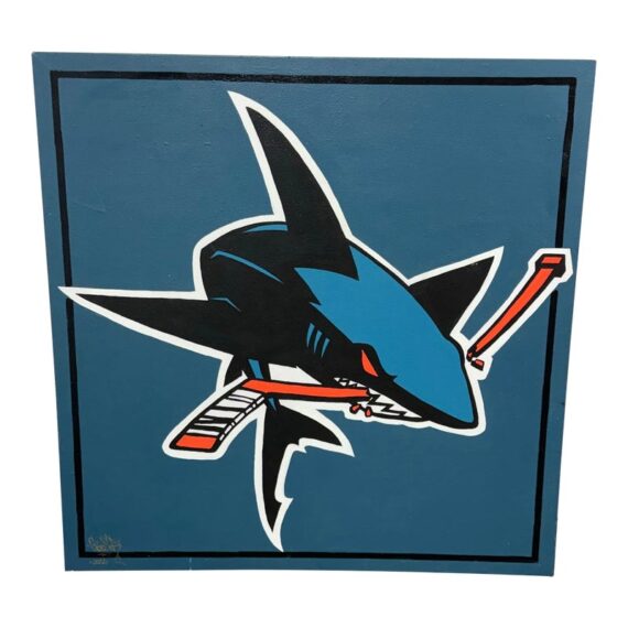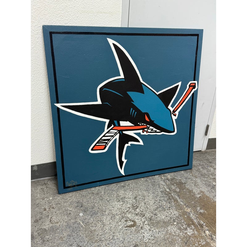 Design Plus Gallery Welcomes all Shark Fans with this Original Sharks Logo Oil Painting on Canvas. This oversize art piece will win you season tickets in the heart of your loyal fan! Whether as a gift for your young amateur player or for your very own man cave, the presence of this well crafted original art piece in your home will be enjoyed for all. There are LED Strips on the back side that could function with minor assistance required for them to work. Is in good condition with artists signature + date on the lower left hand side.